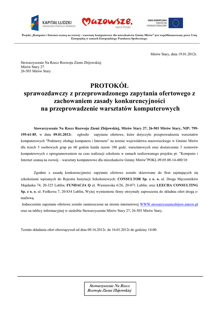 Projekt „Komputer i Internet szansą na rozwój – warsztaty komputerowe dla mieszkańców Gminy Mirów” jest współfinansowany przez Unię Europejską w ramach Europejskiego Funduszu Społecznego. Mirów Stary, dnia 19.01.2012r. Stowarzyszenie Na Rzecz Rozwoju Ziemi Zbijowskiej Mirów Stary 27 26-503 Mirów Stary PROTOKÓŁ sprawozdawczy z przeprowadzonego zapytania ofertowego z zachowaniem zasady konkurencyjności na przeprowadzenie warsztatów komputerowych Stowarzyszenie Na Rzecz Rozwoju Ziemi Zbijowskiej, Mirów Stary 27, 26-503 Mirów Stary, NIP: 799195-61-85, w dniu 09.01.2012r. ogłosiło zapytanie ofertowe, które dotyczyło przeprowadzenia warsztatów komputerowych "Podstawy obsługi komputera i Internetu” na terenie województwa mazowieckiego w Gminie Mirów dla trzech 5 osobowych grup po 60 godzin każda razem 180 godz. warsztatowych oraz dostarczenia 3 zestawów komputerowych z oprogramowaniem na czas realizacji szkolenia w ramach realizowanego projektu pt: ”Komputer i Internet szansą na rozwój – warsztaty komputerowe dla mieszkańców Gminy Mirów”POKL.09.05.00-14-480/10 Zgodnie z zasadą konkurencyjności zapytanie ofertowe zostało skierowane do firm zajmujących się szkoleniami wpisanych do Rejestru Instytucji Szkoleniowych: CONSULTOR Sp. z o. o. ul. Droga Męczenników Majdanka 74, 20-325 Lublin; FUNDACJA Q ul. Wieniawska 6/26, 20-071 Lublin; oraz LEECHA CONSULTING Sp. z o. o. ul. Fiołkowa 7, 20-834 Lublin. Wyżej wymienione firmy otrzymały zaproszenia do składnia ofert drogą emailową. Jednocześnie zapytanie ofertowe zostało zamieszczone na stronie internetowej WWW.stowarzyszeniezbijow.mirow.pl oraz na tablicy informacyjnej w siedzibie Stowarzyszenia Mirów Stary 27, 26-503 Mirów Stary. Termin składania ofert obowiązywał od dnia 09.16.2012r. do 16.01.2012r do godziny 14:00. Stowarzyszenie Na Rzecz Rozwoju Ziemi Zbijowskiej Projekt „Komputer i Internet szansą na rozwój – warsztaty komputerowe dla mieszkańców Gminy Mirów” jest współfinansowany przez Unię Europejską w ramach Europejskiego Funduszu Społecznego. W obowiązującym terminie wpłynęła jedna oferta firmy CONSULTOR Sp. z o. o. ul. Droga Męczenników Majdanka 74, 20-325 Lublin pozostali oferenci przesłali zwrotną informację o otrzymaniu zapytania ofertowego pocztą tradycyjną, jednakże nie załączyli oferty. W związku z otrzymaniem tylko jednej oferty do realizacji zamówienia wybrano w/w oferenta który przedstawił ofertę spełniającą wszystkie wymagania. Oferta: 1) CENA 17 550,00 zł ( 1 170,00 zł za jednego uczestnika) brutto 2) DOŚWIADCZENIE bardzo bogate doświadczenie w realizacji szkoleń 162 w latach 2003 – 2011 w tym szkolenia w ramach projektów POKL 3) DOSTARCZENIE NIEZBĘDNEGO SPRZĘTU DO PRZEPROWADZENIA WARSZTATÓW Komputer HP 4400 Workstation z oprogramowaniem klawiatura i mysz– 3 szt. Monitor Philips 170 S – 3 szt. Rzutnik Benq Ekran do rzutnika Na podstawie przedstawionej oferty oraz wymaganych załączników do oferty zatwierdzono wybór wykonawcy firmę CONSULTOR Sp. z o. o. O dokonaniu wyboru wykonawcę powiadomiono telefonicznie. Zatwierdzam wybór wykonawcy 19.01.2012r Skarbnik - Wioletta Bąk Członek Zarządu – Rozalia Miernik Koordynator Projektu .....Agnieszka Wolińska.......... podpis osoby dokonującej wyboru ............................................................................ data i podpis Stowarzyszenie Na Rzecz Rozwoju Ziemi Zbijowskiej