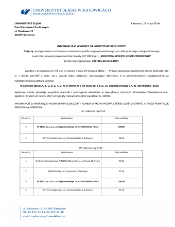 UNIWERSYTET ŚLĄSKI Dział Zamówień Publicznych ul. Bankowa 12 40-007 Katowice Katowice, 23 maja 2014r. INFORMACJA O WYBORZE NAJKORZYSTNIEJSZEJ OFERTY Dotyczy: postępowania o udzielenie zamówienia publicznego prowadzonego w trybie przetargu nieograniczonego o wartości powyżej równowartości kwoty 207 000 € p.n. „DOSTAWA SPRZĘTU KOMPUTEROWEGO” (numer postępowania: DZP.381.10.2014.DW). Zgodnie z przepisem art. 92 ust. 2 ustawy z dnia 29 stycznia 2004r. – Prawo zamówień publicznych (tekst jednolity: Dz. U. z 2013r. poz.907 z późn. zm.), zwanej dalej „Ustawą”, Zamawiający informuje, iż w przedmiotowym postępowaniu za najkorzystniejszą została uznana: W zakresie części A, B, C, D, E, F, G, H, I: oferta nr 3 AF SEKO sp. z o.o., ul. Bogusławskiego 17, 43-300 Bielsko- Biała Wybrane oferty spełniają wszystkie warunki i wymagania określone w Specyfikacji Istotnych Warunków Zamówienia oraz zgodnie z kryterium oceny ofert otrzymały maksymalną ilość punktów, tj. 100,00. INFORMACJE ZAWIERAJĄCE NAZWY (FIRMY), SIEDZIBY I ADRESY WYKONAWCÓW, KTÓRZY ZŁOŻYLI OFERTY, A TAKŻE PUNKTACJĘ PRZYZNANĄ OFERTOM: W zakresie części A: Nr oferty Wykonawca Ilość punktów 3 AF SEKO sp. z o.o., ul. Bogusławskiego 17, 43-300 Bielsko- Biała 100,00 4 BIT Technologies sp.j., ul. Uniwersytecka 4, Katowice 78,56 W zakresie części B: Nr oferty Wykonawca Ilość punktów 1 Centrum Komputerowe PLANETA Marcin Dejas, ul. Piwna 32, Tychy 97,65 2 ZyCOM Polska, ul. Puszczyka 9, Warszawa 97,76 3 AF SEKO sp. z o.o., ul. Bogusławskiego 17, 43-300 Bielsko- Biała 100,00 4 BIT Technologies sp.j., ul. Uniwersytecka 4, Katowice 95,19 W zakresie części C: Nr oferty Wykonawca Ilość punktów 1 Centrum Komputerowe PLANETA Marcin Dejas, ul. Piwna 32, Tychy 98,30 3 AF SEKO sp. z o.o., ul. Bogusławskiego 17, 43-300 Bielsko- Biała 100,00 4 BIT Technologies sp.j., ul. Uniwersytecka 4, Katowice 97,42 W zakresie części D: Nr oferty Wykonawca Ilość punktów 1 Centrum Komputerowe PLANETA Marcin Dejas, ul. Piwna 32, Tychy 98,48 2 ZyCOM Polska, ul. Puszczyka 9, Warszawa 97,63 3 AF SEKO sp. z o.o., ul. Bogusławskiego 17, 43-300 Bielsko- Biała 100,00 W zakresie części E: Nr oferty 3 Wykonawca Ilość punktów AF SEKO sp. z o.o., ul. Bogusławskiego 17, 43-300 Bielsko- Biała 100,00 W zakresie części F: Nr oferty Wykonawca Ilość punktów 1 Centrum Komputerowe PLANETA Marcin Dejas, ul. Piwna 32, Tychy 86,89 2 ZyCOM Polska, ul. Puszczyka 9, Warszawa 79,39 3 AF SEKO sp. z o.o., ul. Bogusławskiego 17, 43-300 Bielsko- Biała 100,00 4 BIT Technologies sp.j., ul. Uniwersytecka 4, Katowice 74,15 W zakresie części G: Nr oferty Wykonawca Ilość punktów 1 Centrum Komputerowe PLANETA Marcin Dejas, ul. Piwna 32, Tychy 95,18 2 ZyCOM Polska, ul. Puszczyka 9, Warszawa 60,74 3 AF SEKO sp. z o.o., ul. Bogusławskiego 17, 43-300 Bielsko- Biała 100,00 W zakresie części H: Nr oferty 3 Wykonawca Ilość punktów AF SEKO sp. z o.o., ul. Bogusławskiego 17, 43-300 Bielsko- Biała 100,00 W zakresie części I: Nr oferty Wykonawca Ilość punktów 1 Centrum Komputerowe PLANETA Marcin Dejas, ul. Piwna 32, Tychy 89,63 3 AF SEKO sp. z o.o., ul. Bogusławskiego 17, 43-300 Bielsko- Biała 100,00 4 BIT Technologies sp.j., ul. Uniwersytecka 4, Katowice 91,25 Przewodniczący Komisji Przetargowej mgr Justyna Rutkowska- Zawada
