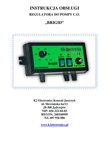 INSTRUKCJA OBSŁUGI REGULATORA DO POMPY C.O. „BRIGID” K2 Electronics Konrad Jaszczyk ul. Słowiańska 6a/13 28-300 Jędrzejów NIP: 656-222-04-83 REGON: 260160950 Tel. 607 936 886 www.k2electronics.pl Deklaracja zgodności nr 4/2008 My, firma K2 Electronics, ul. Słowiańska 6a/13, 28-300 Jędrzejów, deklarujemy z pełną odpowiedzialnością, że produkowany przez nas regulator „BRIGID” 230V, 50Hz spełnia wymagania Rozporządzenia Ministra Gospodarki Pracy i Polityki Społecznej. (Dz.U.03.49.414) z dnia 12 marca 2003 roku, wdrażającego postanowienia Dyrektywy Niskonapięciowej (LVD) 2006/95/WE, oraz Rozporządzenia Ministra Infrastruktury (Dz.U.03.90.848) z dnia 02.04.2003r wdrażającego postanowienia dyrektywy EMC 89/336/EWG. Do ocen zgodności zastosowano normy zharmonizowane PN-EN 60730-2-1:2002. Wyrób oznaczono CE po raz pierwszy 17.03.2008. Właściciel: Konrad Jaszczyk Jędrzejów 17.03.2008 UWAGA! URZĄDZENIE ELEKTRYCZNE POD NAPIĘCIEM! Przed dokonaniem jakichkolwiek czynności związanych z zasilaniem (podłączanie przewodów, instalacja urządzenia, itp.) należy upewnić się, że regulator nie jest podłączony do sieci! Montażu powinna dokonać osoba posiadająca odpowiednie uprawnienia elektryczne Przed uruchomieniem sterownika należy dokonać pomiaru skuteczności zerowania silników elektrycznych, kotła ,oraz pomiaru izolacji przewodów elektrycznych. ZASADA DZIAŁANIA Mikroprocesorowy regulator „ BRIGID ” przeznaczony jest do sterowania pompą obiegu wody w kotłach na paliwa stałe w otwartych instalacjach C.O. Jego zadanie polega na załączeniu pompy C.O. gdy na kotle zostanie osiągnięta temp. zadana oraz wyłączeniu pompy gdy temp. spadnie 3*C poniżej temp. zadanej. Regulator zapobiega niepotrzebnemu działaniu pompy co pozwala zaoszczędzić zużycie energii elektrycznej (oszczędności w zależności od stopnia wykorzystania kotła mogą sięgać nawet do 60%) oraz wydłuża żywotność pompy zapobiegając jej zbędnemu działaniu. OPIS FUNKCJI STEROWNIKA Ustawianie temp. zadanej Jest to temp. przy której następuje załączenie pompy C.O. Zmiany dokonujemy nastawiając potencjometrem żądaną temp. Gdy sterownik osiągnie temp. zadaną pompa zostanie automatycznie załączona co zasygnalizuje dioda z opisem POMPA. Uwaga! Jeżeli kocioł nie jest wyposażony w rurkę, w której można umieścić czujnik to należy go umieścić na rurze wychodzącej z kotła możliwie jak najniżej w celu jak najdokładniejszego odwzorowania temp. na kotle (sposób mocowania czujnika przedstawiony jest w rozdziale montaż regulatora). Praca ręczna Sterownik wyposażony jest w dodatkowy załącznik [POMPA]. Załączenie go na pozycję „1” umożliwia ręczne załączenie pompy co zasygnalizuje dioda umieszczona powyżej. ZABEZPIECZENIA Regulator wyposażony jest w zabezpieczenia przed przegrzaniem kotła, które polega na załączeniu sygnału dźwiękowego gdy na kotle przekroczona zostanie temp. 90*C. Alarm można wyłączyć załączając załącznik [POMPA] na pozycję „1” natomiast załącznik [SIEĆ] na pozycję „0”. Uwaga! Alarm dźwiękowy sygnalizuje również uszkodzenie czujnika zatem w przypadku gdy na kotle temp. jest poniżej 90*C, a alarm jest załączony należy skontaktować się z serwisem. DODATKOWE FUNKCJE Anty stop funkcja ta zapobiega zatarciu pompy w sezonie letnim gdy jest ona nieużywana. Regulator co 10 dni załącza pompę na 5 minut. Anty zamarzanie zapobiega zamarznięciu wody w instalacji C.O. załączając pompę poniżej 5*C. Histereza wartość histerezy wynosi 3*C. Funkcja ta zapobiega ciągłemu załączaniu i wyłączaniu się pompy w przypadku gdy temp. będzie się wahać np. pomiędzy 30*C, a 29*C. Histereza jest to różnica pomiędzy temperaturą zadaną, a temperaturą wyłączenia pompy. np.: gdy temperatura zadana ma wartość 30*C to wyłączenie nastąpi przy temp. 27*C (zawsze 3*C poniżej temp. zadanej). Sygnalizacja dźwiękowa – po przekroczeniu temp. 90*C załącza się alarm oraz gdy czujnik temperatury jest uszkodzony. W każdym przypadku aby funkcje te były aktywne załącznik SIEĆ musi być załączony na pozycję „1”. KONSERWACJA Przed sezonem grzewczym i w czasie jego trwania należy sprawdzić stan techniczny przewodów, mocowania oraz oczyścić sterownik z kurzu i innych zanieczyszczeń. Należy również dokonać pomiaru uziemienia silnika pompy. UWAGA! URZĄDZENIE ELEKTRYCZNE POD NAPIĘCIEM! Przed dokonaniem jakichkolwiek czynności związanych z zasilaniem (podłączanie przewodów, instalacja urządzenia, itp.) należy upewnić się, że regulator nie jest podłączony do sieci! Montażu powinna dokonać osoba posiadająca odpowiednie uprawnienia elektryczne! Nie wolno stosować żadnych zaworów zamykających obieg wody centralnego ogrzewania. Regulator nie może pracować w układzie zamkniętym centralnego ogrzewania. Muszą być zamontowane zawory bezpieczeństwa, zawory ciśnieniowe, zbiornik wyrównawczy, zabezpieczające kocioł przed zagotowaniem wody w układzie centralnego ogrzewania. Sterownik musi być podłączony do gniazdka z uziemieniem (instalacja w układzie TN-S). W trakcie podłączania sterownika należy dokonać pomiaru skuteczności uziemienia. Kable nie mogą być narażone na działanie temperatur powyżej 80*C. Należy je odizolować od elementów pieca nagrzewających się do wysokich temperatur! MONTAŻ REGULATORA Schemat połączeń Mocowanie czujnika Czujnik należy umieścić tak by jak najdokładniej odwzorował temp. na kotle. Gdy kocioł nie jest wyposażony jest w rurkę, w której można umieścić czujnik to należy zamocować go na głównej rurze wychodzącej z kotła jak na rysunku poniżej. PARAMETRY REGULATORA Zakres regulacji temperatury 30 – 80*C Histereza 3*C Praca przy temp. otoczenia 0 – 45*C Zasilanie 230V (+5%/-10%) 50Hz Dopuszczalne obciążenie wyjść Pompa 1A / 230W Funkcja ANTY STOP zapobiega zatarciu się pompy w 