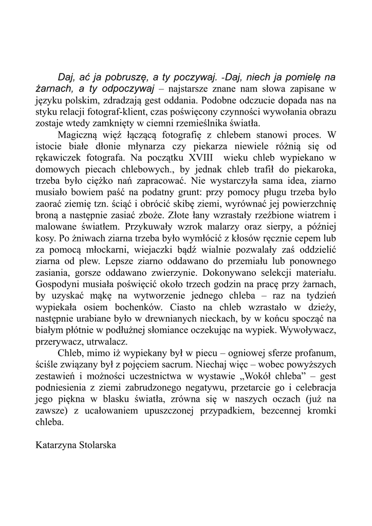 Daj, ać ja pobruszę, a ty poczywaj. -Daj, niech ja pomielę na żarnach, a ty odpoczywaj – najstarsze znane nam słowa zapisane w języku polskim, zdradzają gest oddania. Podobne odczucie dopada nas na styku relacji fotograf-klient, czas poświęcony czynności wywołania obrazu zostaje wtedy zamknięty w ciemni rzemieślnika światła. Magiczną więź łączącą fotografię z chlebem stanowi proces. W istocie białe dłonie młynarza czy piekarza niewiele różnią się od rękawiczek fotografa. Na początku XVIII wieku chleb wypiekano w domowych piecach chlebowych., by jednak chleb trafił do piekaroka, trzeba było ciężko nań zapracować. Nie wystarczyła sama idea, ziarno musiało bowiem paść na podatny grunt: przy pomocy pługu trzeba było zaorać ziemię tzn. ściąć i obrócić skibę ziemi, wyrównać jej powierzchnię broną a następnie zasiać zboże. Złote łany wzrastały rzeźbione wiatrem i malowane światłem. Przykuwały wzrok malarzy oraz sierpy, a później kosy. Po żniwach ziarna trzeba było wymłócić z kłosów ręcznie cepem lub za pomocą młockarni, wiejaczki bądź wialnie pozwalały zaś oddzielić ziarna od plew. Lepsze ziarno oddawano do przemiału lub ponownego zasiania, gorsze oddawano zwierzynie. Dokonywano selekcji materiału. Gospodyni musiała poświęcić około trzech godzin na pracę przy żarnach, by uzyskać mąkę na wytworzenie jednego chleba – raz na tydzień wypiekała osiem bochenków. Ciasto na chleb wzrastało w dzieży, następnie urabiane było w drewnianych nieckach, by w końcu spocząć na białym płótnie w podłużnej słomiance oczekując na wypiek. Wywoływacz, przerywacz, utrwalacz. Chleb, mimo iż wypiekany był w piecu – ogniowej sferze profanum, ściśle związany był z pojęciem sacrum. Niechaj więc – wobec powyższych zestawień i możności uczestnictwa w wystawie „Wokół chleba” – gest podniesienia z ziemi zabrudzonego negatywu, przetarcie go i celebracja jego piękna w blasku światła, zrówna się w naszych oczach (już na zawsze) z ucałowaniem upuszczonej przypadkiem, bezcennej kromki chleba. Katarzyna Stolarska