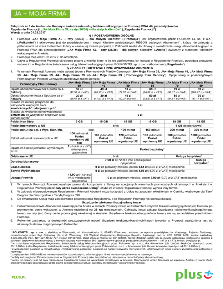 Załącznik nr 1 do Aneksu do Umowy o świadczenie usług telekomunikacyjnych w Promocji PWA dla przedsiębiorców Regulamin Promocji „JA+ Moja Firma XL – raty (36/36) – dla stałych klientów” („Regulamin Promocji”) Wersja z dnia 01.02.2017 § 1 POSTANOWIENIA OGÓLNE 1. Promocja „JA+ Moja Firma XL – raty (36/36) – dla stałych klientów” („Promocja”) jest organizowana przez POLKOMTEL sp. z o.o. 1 („Polkomtel”) i skierowana jest do przedsiębiorców i innych klientów posiadających REGON będących Abonentami 2 , którzy nie zalegają z płatnościami na rzecz Polkomtel i którzy w czasie jej trwania podpiszą z Polkomtel Aneks do Umowy o świadczenie usług telekomunikacyjnych w Promocji PWA dla przedsiębiorców „JA+ Moja Firma XL – raty (36/36) – dla stałych klientów” („Aneks”) związany z numerami telefonów wskazanymi w Aneksie. 2. Promocja trwa od 01.02.2017 r. do odwołania. 3. Użyte w Regulaminie Promocji określenia pisane z wielkiej litery, o ile nie zdefiniowano ich inaczej w Regulaminie Promocji, posiadają znaczenie nadane im w Regulaminie świadczenia usług telekomunikacyjnych przez POLKOMTEL sp. z o.o. – Abonament („Regulamin”). § 2 PAKIETY TARYFOWE I INNE UPRAWNIENIA ABONENTA 1. W ramach Promocji Abonent może wybrać jeden z Promocyjnych Planów Cenowych: JA+ Moja Firma 39, JA+ Moja Firma 49, JA+ Moja Firma 59, JA+ Moja Firma 69, JA+ Moja Firma 79 lub JA+ Moja Firma 89 („Promocyjny Plan Cenowy”). Opcje usług w poszczególnych Promocyjnych Planach Cenowych przedstawia tabela poniżej: JA+ Moja Firma JA+ Moja Firma JA+ Moja Firma JA+ Moja Firma JA+ Moja Firma JA+ Moja Firma Promocyjny Plan Cenowy 39 49 59 69 79 89 Opłata abonamentowa bez Upustu za e39 zł 49 zł 59 zł 69 zł 79 zł 89 zł (47,97 zł z VAT) (60,27 zł z VAT) (72,57 zł z VAT) (84,87 zł z VAT) (97,17 zł z VAT) (109,47 zł z VAT) Fakturę Opłata abonamentowa z Upustem za e29 zł 39 zł 49 zł 59 zł 69 zł 79 zł (35,67 zł z VAT) (47,97 zł z VAT) (60,27 zł z VAT) (72,57 zł z VAT) (84,87 zł z VAT) (97,17 zł z VAT) Fakturę Stawka za minutę połączenia do 0 zł wszystkich krajowych sieci komórkowych3 i stacjonarnych3 Stawka za wysłanie jednej wiadomości SMS/MMS do wszystkich krajowych sieci 0 zł komórkowych4 Pakiet Non Stop 9 GB 15 GB 15 GB 18 GB 18 GB 18 GB Pakiet Internetowy w UE 1 GB (jednorazowo) brak Pakiet minut na poł. z Wyb. Kier. Mn. 100 minut 150 minut 200 minut 300 minut brak 100 jednostek 100 jednostek 120 jednostek 150 jednostek 300 jednostek 1000 jednostek Pakiet Pakiet Pakiet Pakiet Pakiet Pakiet Pakiet jednostek wymiennych w UE wymienny UE wymienny UE wymienny UE wymienny UE wymienny UE wymienny UE 100 8 zł (9,84 zł z VAT) Opłata za Pakiet jednostek wymiennych Pakiet bezpłatny5 miesięcznie w UE opcjonalnie Odebrane w UE Usługa bezpłatna5 brak 7,90 zł (9,72 zł z VAT) miesięcznie Usługa Doradca biznesowy bezpłatna5 opcjonalnie Czasoumilacz 0 zł za pierwszy miesiąc, potem 1,64 zł (2,02 zł z VAT) miesięcznie Serwis Wyświetlacza 0 zł za pierwszy miesiąc, potem 4,06 zł (4,99 zł z VAT) miesięcznie 11,90 zł (14,64zł z Usługa Prawnik 0 zł za pierwszy miesiąc, potem 7,90 zł (9,72 zł z VAT) miesięcznie VAT) miesięcznie opcjonalnie 2. W ramach Promocji Abonent uzyskuje prawo do korzystania z Usług na specjalnych warunkach promocyjnych określonych w Aneksie i w Regulaminie Promocji przez cały okres świadczenia Usług6, chyba że z treści Regulaminu Promocji wynika inny termin. 3. W zakresie nieuregulowanym Regulaminem Promocji Abonent może korzystać z Usług na zasadach określonych w Cenniku właściwym dla Taryf Progres dla Firm zgodnie z Taryfą Progres 399. 4. Do świadczenia Usług mają zastosowanie postanowienia Regulaminu, o ile Regulamin Promocji nie stanowi inaczej. Urządzenie telekomunikacyjne/inny towar 5. Polkomtel umożliwia Abonentowi zawierającemu Aneks w ramach Promocji zakup od Polkomtel Urządzeń telekomunikacyjnych/innych towarów po promocyjnej cenie wskazanej w Aneksie rozłożonej na 36 rat miesięcznych. Całkowity koszt zakupu Urządzenia telekomunikacyjnego/innego towaru na raty jest równy cenie promocyjnej określonej w Aneksie. Urządzenia telekomunikacyjne/inne towary nie są samodzielnie przedmiotem Promocji. 6. Polkomtel zastrzega, iż dostępność poszczególnych modeli Urządzeń telekomunikacyjnych/innych towarów w Promocji uzależniona jest od aktualnych stanów magazynowych Polkomtel. 1 POLKOMTEL sp. z o.o. z siedzibą w Warszawie, ul. Konstruktorska 4, 02-673 Warszawa, wpisana do rejestru przedsiębiorców Krajowego Rejestru Sądowego prowadzonego przez Sąd Rejonowy dla m.st. Warszawy, XIII Wydział Gospodarczy Krajowego Rejestru Sądowego pod nr KRS 0000419430, kapitał zakładowy 3.525.300.000 PLN, NIP 527-10-37-727, Regon 011307968, Dział Obsługi Klienta tel. 601102601, fax 601102602 (opłaty jak za zwykłe połączenie telefoniczne zgodnie z pakietem taryfowym dostawcy usług, z którego korzysta Abonent) lub 2601 (jednorazowa opłata za połączenie z konsultantem - 1,97 zł z VAT), e-mail: [email protected]. 2 w rozumieniu odpowiednio Regulaminu świadczenia usług telekomunikacyjnych przez Polkomtel sp. z o.o. dla Abonentów (dla Umów/ Aneksów zawartych przed 25.12.2014 r.) albo Regulaminu świadczenia usług telekomunikacyjnych przez Polkomtel sp. z o.o. – Abonament (dla Umów/ Aneksów zawartych od 25.12.2014 r.). 3 z wyłączeniem połączeń w ramach usługi „Przekazywanie połączeń”, połączeń na numery serwisów rozrywkowych, informacyjnych i inne numery specjalne oraz połączeń w roamingu. 4 z wyłączeniem SMS/MMS na numery serwisów rozrywkowych, informacyjnych i inne numery specjalne oraz w roamingu. 5 opłaty za Usługi oraz Pakiety oznaczone w Regulaminie Promocji jako „bezpłatne” są uiszczane w ramach Opłaty abonamentowej. 6 okres ten liczony jest od dnia rozpoczęcia świadczenia Usług na warunkach określon