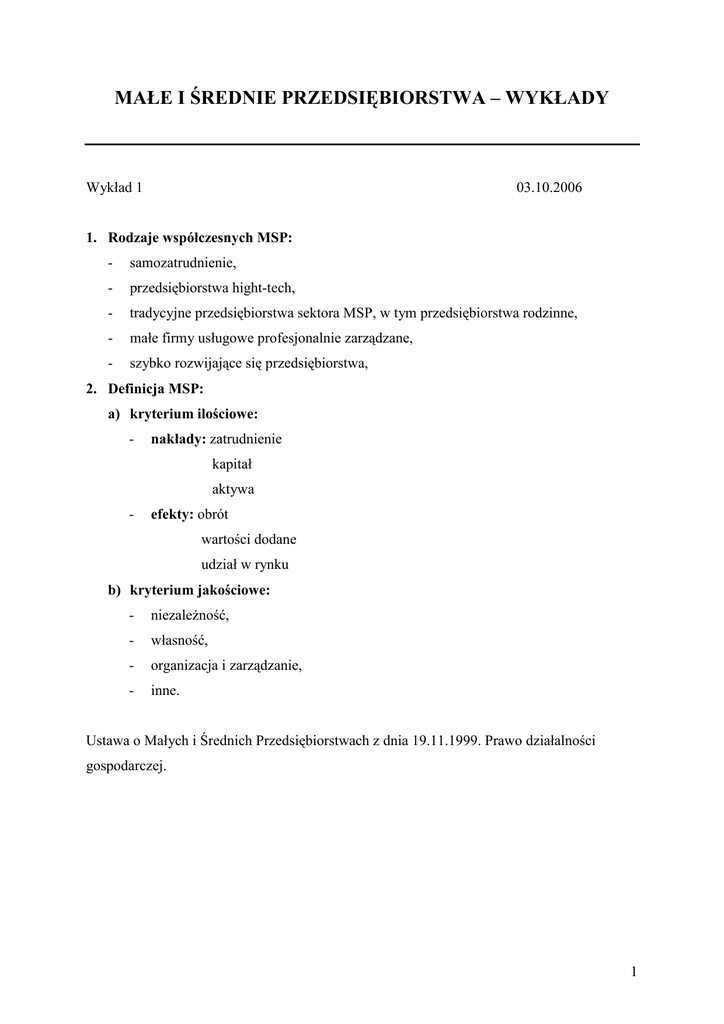 MAŁE I ŚREDNIE PRZEDSIĘBIORSTWA WYKŁADY