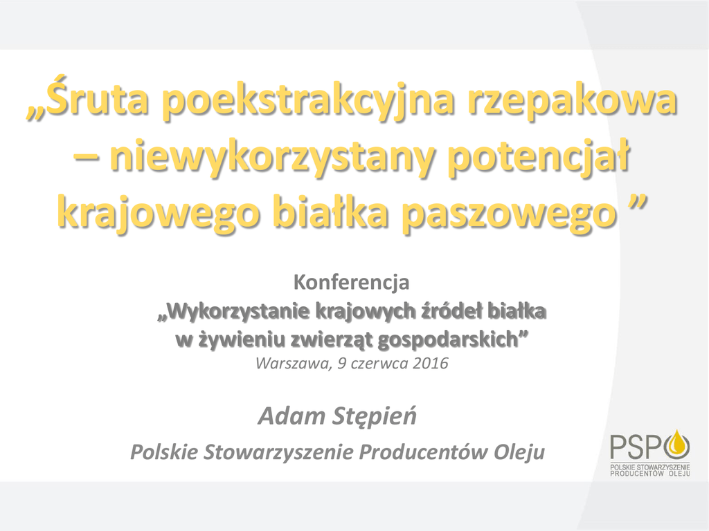„Śruta poekstrakcyjna rzepakowa – niewykorzystany potencjał krajowego białka paszowego ” Konferencja „Wykorzystanie krajowych źródeł białka w żywieniu zwierząt gospodarskich” Warszawa, 9 czerwca 2016 Adam Stępień Polskie Stowarzyszenie Producentów Oleju Krajowy przemysł olejarski wysoki stopień koncentracji nowoczesna infrastruktura techniczna Olej spożywczy 40% Olej na produkcję biopaliw 60% Firmy olejarskie zrzeszone w PSPO przerobiły w 2015 roku Ponad 2,6 mln ton nasion rzepaku Produkując dzięki temu 1,36 miliona ton oleju surowego, 434 tysięcy ton oleju rafinowanego, 1,42 miliona ton śruty poekstrakcyjnej rzepakowej! Śruta poekstrakcyjna rzepakowa jako surowiec dla przemysłu paszowego Powstaje po wytłoczeniu oleju z nasion poddanych procesowi ciągłej ekstrakcji Zawartość białka ogólnego: 36-38% (wartościowe źródło białka) Dobre źródło aminokwasów egzogennych (siarkowych) Zawartość tłuszczu: do 4% Energia brutto 18-20 MJ/kg s.m. Włókno 11-14% CENNY, ALE NIE W PEŁNI DOCENIANY SUROWIEC Śruta poekstrakcyjna rzepakowa Produkcja rzepaku stała się najszybciej rozwijającym działem produkcji roślinnej (rozwój biopaliw, lepsza agrotechnika oraz większe zapotrzebowanie), tym samym krajowa produkcja śruty rzepakowej odnotowała niespotykane wcześniej wielkości. 1 600 1 400 1 200 1 000 793 800 640 835 653 Eksport śruty rzepakowej w 2015 r. wyniósł t tys. ton ponad 725 tj. ok. 50% produkcji krajowej 600 Produkcja śruty w Polsce 400 Zużycie śruty w kraju 200 0 2012 2013 2014 2015 Produkowana w Polsce śruta poekstrakcyjna rzepakowa pochodzi z odmian rzepaku podwójnie ulepszonego (tzw.00), tzn. niskoerukowego i o obniżonej zawartości glukozynolanów (najniższa wartość spośród krajów UE). Odbiorcy polskiej śruty rzepakowej w 2015 r. Hiszpania – 140 tys. ton (+23%!) Niemcy – 136 tys. ton (+19%!) Dania – 28 tys. ton Irlandia – 26 tys. ton Szwecja – 26 tys. ton Zużycie śruty rzepakowej i sojowej w Niemczech 5 4,01 4 3,86 ml ton 3,46 3,09 3 2,86 3,14 3,19 2,90 Śruta rzepakowa 2,40 2,27 2 1,98 Śruta sojowa 1 0 2004 Źródło: OVID 2005 2006 2007 2008 2009 2010 2011 2012 2013 2014 Białkowe surowce paszowe Białko dostarczane z surowców importowanych – 74% Ilość (pasze) Ilość białka Udział 2 200 000 1 000 000 89% Śruta słonecznikowa 300 000 100 000 9% Mączka rybna 30 000 20 000 2% 2 530 000 1 120 000 74% Śruta sojowa ŁĄCZNIE IMPORT Białko dostarczane z surowców krajowych – 26% Ilość (pasze) Ilość białka Udział Rośliny strączkowe 350 000 100 000 25% DGGS 130 000 40 000 10% Surowce rzepakowe (śruta i makuch) 800 000 250 000 65% 1 280 000 390 000 26% ŁĄCZNIE Źródło: De Heus Śruta rzepakowa vs sojowa Argument wzajemnej relacji cen – 1 kg białka pochodzącego ze śruty rzepakowej jest tańszy od białka ze śruty sojowej! Średnia cena bieżąca Śruta sojowa 1 850 zł Śruta rzepakowa 1 000 zł Cena śruty sojowej musiałaby kosztować ok. 1 200 zł/tonę, aby koszt 1 kg białka był taki sam jak w przypadku śruty poekstrakcyjnej rzepakowej KLUCZOWE WYZWANIA ŻYWIENIOWE Glukozynolany - polskie odmiany rzepaku mają najniższą zawartość spośród wszystkich krajów UE! Kwas erukowy - pierwsze plantacje odmian („00”) w Polsce już w 1984 r., a w 1985 r. zarejestrowano pierwszą polską odmianę podwójnie ulepszoną; Wysoka zawartość włókna (11-14%) - w przypadku zwierząt monogastrycznych (drób, trzoda chlewna) ujemnie wpływa na stawność białka; Pasze rzepakowe w żywieniu zwierząt gospodarskich Również dla: owiec kaczek gęsi zwierząt futerkowych Potencjał wykorzystania vs krajowa podaż 2,5 Miliony ton 2 1,5 Potencjalne zużycie Szacunkowe zużycie Produkcja krajowa 1 0,5 0 MITY Sceptycyzm rolników do stosowania śruty rzepakowej mimo niższej ceny niż śruty sojowej – dlaczego? stereotypy, uprzedzenia, brak doświadczenia PRZYKŁADOWE WYPOWIEDZI ROLNIKÓW NT. ŚRUTY RZEPAKOWEJ: „Pasza rzepakowa ma mało białka, trzeba je uzupełniać, liczyć, ważyć – to skomplikowane” „Moim zdaniem w ostatecznym rozrachunku rzepak wychodzi dużo drożej niż soja” „Pasza rzepakowa jest gorzka, a więc moje zwierzęta nie będą chciały jej jeść, będą mniej przybierać na wadze”(wypowiedź w odniesieniu do trzody chlewnej) „Jest ciemnego koloru - na pewno moim zwierzętom się to nie spodoba” Kluczowe bariery: Domyślne poziomy maksymalne zawartości surowców rzepakowych w przemyśle paszowym możliwe w sposób bezpieczny do podwyższenia (determinantem historyczne zawartości substancji anty-odżywczych) Brak doświadczenia w zakresie stosowania śruty rzepakowej przy zadowalających wynikach stosowania śruty sojowej (sprawdzone rozwiązania nie zachęcają do innowacji) ALE: Produkowana lokalnie (bezpieczeństwo dostaw!) Efektywna ekonomicznie (niższa cena za kilogram białka!) Wraz z biopaliwami tworzy idealny przykład „BIOGOSPODARKI” Wykorzystanie śruty rzepakowej = obniżenie kosztów skarmiana zwierząt = obniżenie kosztów produkcji zwierzęcej = WIĘKSZY ZYSK DLA ROLNIKA Konieczne są inicjatywy zwiększające krajową absorpcję śruty rzepakowej ukierunkowane na: Wzrost świadomości walorów żywieniowych i faktycznych możliwości oferowanych hodowcom przez śrutę rzepakową; Pokazanie realnych możliwości obniżenia kosztów produkcji zwierzęcej Wzrost zainteresowania przemysłu paszowego jako wypadkowa zmiany popytu ze strony rolników DZIĘKUJĘ ZA UWAGĘ!