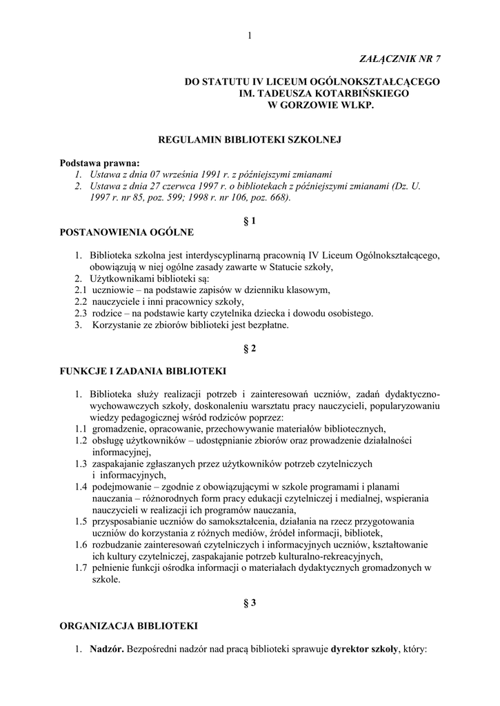 1 ZAŁĄCZNIK NR 7 DO STATUTU IV LICEUM OGÓLNOKSZTAŁCĄCEGO IM. TADEUSZA KOTARBIŃSKIEGO W GORZOWIE WLKP. REGULAMIN BIBLIOTEKI SZKOLNEJ Podstawa prawna: 1. Ustawa z dnia 07 września 1991 r. z późniejszymi zmianami 2. Ustawa z dnia 27 czerwca 1997 r. o bibliotekach z późniejszymi zmianami (Dz. U. 1997 r. nr 85, poz. 599; 1998 r. nr 106, poz. 668). §1 POSTANOWIENIA OGÓLNE 1. Biblioteka szkolna jest interdyscyplinarną pracownią IV Liceum Ogólnokształcącego, obowiązują w niej ogólne zasady zawarte w Statucie szkoły, 2. Użytkownikami biblioteki są: 2.1 uczniowie – na podstawie zapisów w dzienniku klasowym, 2.2 nauczyciele i inni pracownicy szkoły, 2.3 rodzice – na podstawie karty czytelnika dziecka i dowodu osobistego. 3. Korzystanie ze zbiorów biblioteki jest bezpłatne. §2 FUNKCJE I ZADANIA BIBLIOTEKI 1. Biblioteka służy realizacji potrzeb i zainteresowań uczniów, zadań dydaktycznowychowawczych szkoły, doskonaleniu warsztatu pracy nauczycieli, popularyzowaniu wiedzy pedagogicznej wśród rodziców poprzez: 1.1 gromadzenie, opracowanie, przechowywanie materiałów bibliotecznych, 1.2 obsługę użytkowników – udostępnianie zbiorów oraz prowadzenie działalności informacyjnej, 1.3 zaspakajanie zgłaszanych przez użytkowników potrzeb czytelniczych i informacyjnych, 1.4 podejmowanie – zgodnie z obowiązującymi w szkole programami i planami nauczania – różnorodnych form pracy edukacji czytelniczej i medialnej, wspierania nauczycieli w realizacji ich programów nauczania, 1.5 przysposabianie uczniów do samokształcenia, działania na rzecz przygotowania uczniów do korzystania z różnych mediów, źródeł informacji, bibliotek, 1.6 rozbudzanie zainteresowań czytelniczych i informacyjnych uczniów, kształtowanie ich kultury czytelniczej, zaspakajanie potrzeb kulturalno-rekreacyjnych, 1.7 pełnienie funkcji ośrodka informacji o materiałach dydaktycznych gromadzonych w szkole. §3 ORGANIZACJA BIBLIOTEKI 1. Nadzór. Bezpośredni nadzór nad pracą biblioteki sprawuje dyrektor szkoły, który: 2 1.1 zapewnia pomieszczenia i wyposażenie warunkujące prawidłową pracę biblioteki, bezpieczeństwo i nienaruszalność mienia, 1.2 zatrudnia, zgodnie z obowiązującymi normami lub standardami wykwalifikowaną obsługę biblioteki, powierza jednemu nauczycielowi obowiązek kierowania biblioteką, 1.3 zapewnia realizację zadań dydaktyczno-wychowawczych biblioteki, 1.4 zapewnia środki finansowe na działalność biblioteki – w sposób umożliwiający prowadzenie planowego, racjonalnego systemu zakupów materiałów bibliotecznych i koniecznego sprzętu, 1.5 kontroluje stan ewidencji i opracowania zbiorów biblioteki, 1.6 zarządza przeprowadzenie skontrum zbiorów bibliotecznych oraz odpowiada za protokolarne przekazanie biblioteki, jeżeli następuje zmiana pracownika, 1.7 zatwierdza regulamin biblioteki – czytelni, wypożyczalni, pracowni multimedialnej, korzystania ze zbiorów audiowizualnych. 2. Lokal. Lokal biblioteki składa się z 4 pomieszczeń: wypożyczalni, magazynu, czytelni, czytelni multimedialnej. 3. Wyposażenie. Wyposażenie biblioteki stanowią odpowiednie meble biblioteczne, urządzenia komputerowe, audiowizualne, reprodukcyjne i telekomunikacyjne, które umożliwiają: 3.1 bezpieczne i funkcjonalne przechowywanie oraz udostępnianie zbiorów, 3.2 zorganizowanie nowoczesnego warsztatu biblioteczno-informacyjnego umożliwiającego realizację przypisanych bibliotece zadań. 4. Zbiory: 4.1 biblioteka gromadzi materiały biblioteczne przeznaczone do rozpowszechniania niezależnie od nośnika fizycznego i sposobu zapisu treści (druki, dokumenty dźwiękowe, wizualne, audiowizualne, elektroniczne), które służą wypełnianiu zadań biblioteki, 4.2 biblioteka prowadzi politykę gromadzenia zbiorów kierując się zapotrzebowaniem użytkowników, analizą obowiązujących w szkole programów, ofertą rynkową oraz możliwościami finansowymi, 4.3 zbiory biblioteki udostępniane są: prezencyjnie (w czytelni), drogą wypożyczeń indywidualnych (w wypożyczalni) oraz w gabinetach przedmiotowych, 4.4 do gabinetów przedmiotowych zbiory są przekazywane na rok szkolny, odpowiedzialny za nie jest nauczyciel wypożyczający. 5. Pracownicy: 5.1 w bibliotece zatrudnieni są nauczyciele bibliotekarze, zgodnie z obowiązującymi przepisami, 5.2 biblioteką kieruje nauczyciel bibliotekarz wyznaczony przez dyrektora szkoły (w przypadku obsady co najmniej 2-osobowej), 5.3 zadania poszczególnych nauczycieli bibliotekarzy określone są w zakresach ich obowiązków. 6. Czas pracy biblioteki: 6.1 biblioteka jest czynna w czasie trwania zajęć dydaktycznych, zgodnie z organizacją roku szkolnego, 6.2 udostępnianie zbiorów odbywa się przez 30 godzin tygodniowo. 6.3 okres udostępniania zostaje odpowiednio skrócony w czasie przeprowadzania skontrum, 6.4 czas i godziny pracy biblioteki zatwierdza na początku roku szkolnego dyrektor szkoły. 7. Finansowanie wydatków: 7.1 budżet szkoły, 7.2 Rada Rodziców i inni ofiarodawcy 3 7.3 pozyskiwanie środków przez organizację różnorodnych imprez. §4 ZADANIA I OBOWIĄZKI NAUCZYCIELA BIBLIOTEKARZA 1. Praca pedagogiczna: 1.1 udostępnianie zbiorów – zgodnie z regulaminem biblioteki – w wypożyczalni i czytelni, 1.2 prowadzenie działalności informacyjnej i poradniczej, 1.3 tworzenie warunków do poszukiwania, porządkowania i wykorzystywania informacji z różnych źródeł oraz efektywnego posługiwania się technologią informacyjną, 1.4 rozbudzanie i rozwijanie indywidualnych zainteresowań uczniów oraz wyrabianie i pogłębianie u uczniów nawyku czytania i uczenia się, 1.5 prowadzenie różnych form upowszechniania czytelnictwa, 1.6 organizowanie różnorodnych działań rozwijających wrażliwość kulturową i społeczną, 1.7 udział w realizacji zadań dydaktyczno-wychowawczych szkoły poprzez współpracę z wychowawcami klas, nauczycielami przedmiotów, rodzicami uczniów, bib