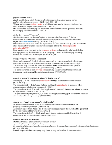 jeżeli = ‘where’ / ‘if’ / Jeżeli wspólnik nie uiścił dopłaty w określonym terminie, obowiązany jest do zapłaty odsetek ustawowych... . (KSH4 Art. 178 § 2) Where a shareholder fails to make an additional payment by the specified date, he shall be obliged to pay statutory interest... . (CCC1)5 If a shareholder does not pay the additional contribution within a specified deadline, he shall pay statutory interest... . (PCCC chyba że = ‘unless’ / ‘save as’ Jeżeli akcjonariusz nie dokonał wpłaty w terminie określonym w § 1, jest on obowiązany do zapłacenia odsetek ustawowych za opóźnienie lub odszkodowania, chyba że statut stanowi inaczej. (KSH Art. 330 § 5) If the shareholder fails to make the payment on the date specified in § 1, the shareholder shall pay statutory interest on delay or damages, unless the statutes provide otherwise. (PCCC) Save as otherwise provided in the company articles, a shareholder who has failed to make payment by the date referred to in paragraph 1 shall be liable to pay statutory interest for the default, or damages. (PCOCPAC)11 w razie = ‘upon’ / ‘should’ / in case of Statut może stanowić, że akcje ulegają umorzeniu w razie ziszczenia się określonego zdarzenia bez powzięcia uchwały przez walne zgromadzenie. (KSH Art. 359 § 6) The statutes may provide for share redemption upon the occurrence of a specific event without a resolution of the general meeting. (CCC1) The company articles may provide for redeeming shares without the resolution of the general meeting should a certain event occur. (PCOCPAC) w razie = ‘when’ / ‘in the case where’ / ‘in the case of’ Przepisy § 1, 2, 4 i 5 stosuje się odpowiednio w razie ustania stosunku zależności. (KSH Art. 6 § 6) The provisions of §§ 1, 2, 4, and 5 above shall apply accordingly to instances when the dependence relationship has ceased. (CCC1) The provisions of § 1, 2, 4 and 5 shall apply mutatis mutandis in the case where a relation of dependence ceases to exist. (PCCC) The provisions of paragraphs 1, 2, 4 and 5 shall apply accordingly in the case of cessation of a relationship of dependency. (PCOCPAC) stosuje się = ‘shall be governed’ / ‘shall apply’ W sprawach określonych w art. 1 § 1 nieuregulowanych w ustawie stosuje się przepisy Kodeksu cywilnego. (KSH Art. 2) All matters set forth in Article 1 § 1 which are not regulated in this Act shall be governed by the provisions of the Civil Code. (CCC1) The provisions of the Civil Code shall apply to any matters specified in Article 1, paragraph 1 not regulated in this Act. (PCOCPAC) wolno = ‘shall be permissible’ Wolno zatrudniać tylko tych młodocianych, którzy: 1) ukończyli co najmniej gimnazjum, 2) przedstawili świadectwo lekarskie stwierdzające, że praca danego rodzaju nie zagraża ich zdrowiu. (KP Art. 191 § 1) It shall be permissible to employ only those young adults who: 1) have completed at least junior high school; 2) present a medical certificate stating that work of a particular type is not hazardous to their health. (PLC) wolno = ‘shall be free’ Jeżeli wartość wkładów niepieniężnych lub przedmiotów i praw majątkowych, nabywanych przed zarejestrowaniem, ustalona przez biegłych rewidentów jest niższa przynajmniej o jedną piątą od wartości, oznaczonej w sprawozdaniu założycieli, wolno każdemu subskrybentowi zrzec się uczestnictwa w spółce. (KH25 Art. 325) Where the value of non-cash contributions or propriety rights and things acquired prior to registration, determined by expert auditors, is lower by at least one fifth than the value indicated in the promoters’ report, each subscriber shall be free to resign from participation in the company. (PCC226) wolno = ‘shall be authorised’ Właścicielowi wolno w pościgu za rojem wejść na cudzy grunt, powinien jednak naprawić wynikłą stąd szkodę. (KC Art. 182) In pursuing the swarm the owner shall be authorised to enter the land of another person but he has to redress the resulting damage. (PCC) może = ‘may’ / ‘shall have the right’ Odwołać prokurę może każdy wspólnik mający prawo prowadzenia spraw spółki. (KSH Art. 41 § 2) The commercial power of attorney may be revoked by any partner who has the right to manage the affairs of the partnership. (PCCC) XIX Every partner having the right to conduct affairs of the partnership shall have the right to revoke the procuration. (PCOCPAC) In Polish legislative texts, there is also można to be found. It is another form of móc, and it occurs in subjectless constructions. Polish legislators use można when they address the general public; they do not name the legal subject of the norm. This should be obvious from the context. See the example below: można = ‘may’ Potrącenia z tytułów wymienionych w § 1 i 2 można również dokonać z urzędu. (OP Art. 64 § 3)27 Set-offs under the rights listed in §§ 1 and 2 may also be made ex officio. (AORFT) nie jest obowiązany = ‘shall not be obliged’ / ‘shall not be obligated’ Komandytariusz nie jest obowiązany do zwrotu tego, co pobrał tytułem zysku na podstawie sprawozdania finansowego,... (KSH Art. 112 § 4) A limited partner shall not be obliged to return whatever he received as profit on the basis of the financial statements. (CCC1) A limited partner shall not be obligated to return what he received in respect of profit under the financial report. (PCCC) A limited partner shall not be required to refund what he collected as profit on the basis of financial statement. (PCOCPAC) nie wymaga = ‘shall not be necessary’ jest uprawniony = ‘shall be entitled’ Każdy wspólnik jest uprawniony i zobowiązany do prowadzenia spraw spółki. (KC) Each partner shall be entitled and bound to manage the partnership’s affairs. (PCC) uprawnienie przysługuje = ‘the right shall vest in’ Uprawnienie, o którym mowa w art. 64 § 1, przysługuje również podatnikom w stosunk