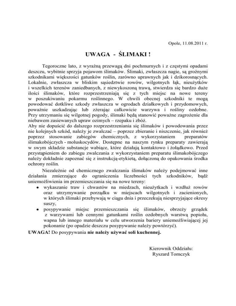 Opole, 11.08.2011 r. UWAGA - ŚLIMAKI ! Tegoroczne lato, z wyraźną przewagą dni pochmurnych i z częstymi opadami deszczu, wybitnie sprzyja pojawom ślimaków. Ślimaki, zwłaszcza nagie, są groźnymi szkodnikami większości gatunków roślin, zarówno uprawnych jak i dzikorosnących. Lokalnie, zwłaszcza w bliskim sąsiedztwie rowów, wilgotnych łąk, nieużytków i wszelkich terenów zaniedbanych, z niewykoszoną trawą, stwierdza się bardzo duże ilości ślimaków, które rozprzestrzeniają się z tych miejsc na nowe tereny w poszukiwaniu pokarmu roślinnego. W chwili obecnej szkodniki te mogą powodować dotkliwe szkody zwłaszcza w ogrodach działkowych i przydomowych, poważnie uszkadzając lub zżerając całkowicie warzywa i rośliny ozdobne. Przy utrzymaniu się wilgotnej pogody, ślimaki będą stanowić poważne zagrożenie dla niebawem zasiewanych upraw ozimych – rzepaku i zbóż. Aby nie dopuścić do dalszego rozprzestrzeniania się ślimaków i powodowania przez nie kolejnych szkód, należy je zwalczać – poprzez zbieranie i niszczenie, jak również poprzez stosowanie zabiegów chemicznych, z wykorzystaniem preparatów ślimakobójczych - moluskocydów. Dostępne na naszym rynku preparaty zawierają w swym składzie substancje wabiące, które działają kontaktowo i żołądkowo. Przed przystąpieniem do zabiegu zwalczania z wykorzystaniem preparatu ślimakobójczego należy dokładnie zapoznać się z instrukcją-etykietą, dołączoną do opakowania środka ochrony roślin. Niezależnie od chemicznego zwalczania ślimaków należy podejmować inne działania zmierzające do ograniczenia liczebności tych szkodników, bądź uniemożliwienia im przemieszczania się na nowe tereny: wykaszanie traw i chwastów na miedzach, nieużytkach i wzdłuż rowów oraz utrzymywanie porządku w miejscach wilgotnych i zacienionych, w których ślimaki przebywają w ciągu dnia i przeczekują niesprzyjające okresy suszy, posypywanie miejsc przemieszczania się ślimaków, obrzeży grządek z warzywami lub cennymi gatunkami roślin ozdobnych warstwą popiołu, wapna lub innego materiału w celu utworzenia bariery uniemożliwiającej jej pokonanie (po opadzie deszczu posypywanie należy powtórzyć). UWAGA! Do posypywania nie należy używać soli kuchennej. Kierownik Oddziału: Ryszard Tomczyk