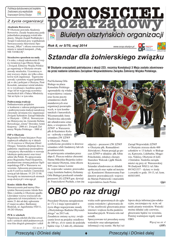 Publikacja dystrybuowana jest bezpłatnie. Zrealizowano przy współudziale finansowym Gminy Olsztyn Z życia organizacji Strzelectwo sposobem na nudę Co roku, z okazji zakończenia II wojny światowej Liga Obrony Kraju i Związek Żołnierzy Wojska Polskiego organizują w Olsztynie otwarte zawody strzeleckie. Uczestniczą w niej wszyscy chętni, nie tylko członkowie tych organizacji. Tegoroczne zawody z pistoletu wygrał (podobnie jak w ubr.) policjant z Olsztyna, Piotr Kowalski, natomiast wśród młodzieży w rywalizacji z karabinu sportowego od lat wygrywają uczestnicy strzeleckich kół z Pałacu Młodzieży. Tak też było i w tym roku. Podtrzymują tradycje Dofinansowanie projektów w konkursie z zakresu pielęgnowania i podtrzymywania tradycji narodowej otrzymały od miasta trzy organizacje: Związek Sybiraków Zarząd Oddziału w Olsztynie – 1200 zł, Stowarzyszenie Historyczne im. Generała Stefana Roweckiego „Grota” Dowódcy Armii Krajowej – 2800 zł i Związek Żołnierzy Wojska Polskiego – 1000 zł. FIP w Olsztynie Regionalne Forum Inicjatyw Pozarządowych odbędzie się w dniach 13-14 czerwca w Olsztynie (Hotel Omega). Tematyka obejmuje dwa zagadnienia: organizacje pozarządowe i inicjatywy obywatelskie w rozwoju lokalnym społeczności oraz trzeci sektor dla Polski. Po opracowaniu przez Regionalny Panel Ekspertów, przedstawione zostaną podczas Ogólnopolskiego FIP w Warszawie we wrześniu. Zgłoszenia przyjmowane są do 8 czerwca mailem: r.narnicki@ eswip.pl lub faksem: 55 235 33 88. Szczegóły na internetowych stronach ocop.olsztyn.pl i wim.ngo.pl. Koniec Aikido Ren Shin Stowarzyszenie pod nazwą Olsztyńskie Stowarzyszenie Aikido Ren Shin z siedzibą w Olsztynie upadło. Likwidator wzywa wierzycieli do zgłaszania ich wierzytelności w terminie 21 dni od daty ogłoszenia (5 maja) na adres: Bartłomiej Biedziuk, ul. Jagiellońska 55D/11, 10-283 Olsztyn. PCK w szkołach Organizacją szkoleń dla klas czwartych i szóstych szkół podstawowych oraz klas drugich gimnazjów i szkół Cd. na str. 2 Rok 8, nr 5/70, maj 2014 www.ocop.olsztyn.pl Sztandar dla żołnierskiego związku W Olsztynie uroczystość patriotyczna z okazji 223. rocznicy Konstytucji 3 Maja została zdominowana przez nadanie sztandaru Zarządowi Wojewódzkiemu Związku Żołnierzy Wojska Polskiego. Pod Kolumną Orła Białego na placu Konsulatu Polskiego zgromadziły się władze województwa i miasta oraz liczne poczty sztandarowe służb mundurowych oraz organizacji pozarządowych, w tym kombatanckich i harcerskich. Wicemarszałek Anna Wasilewska odczytała akt ufundowania sztandaru, a wiceprezes ZG ZŻWP w Warszawie płk dr Kazimierz Kolasa – uchwałę o nadaniu sztandaru ZW ZŻWP w Olsztynie. Potem symboliczne gwoździe w drzewce sztandaru wbili fundatorzy lub ich przedstawiciele. Po poświęceniu sztandaru przez abpa E. Piszcza rodzice chrzestni: Hanna Mikulska-Bojarska (sekretarz miasta Olsztyna, żona oficera WP) oraz Janusz Lorenz (b. wojewoda i senator, przewodniczący komitetu budowy Kolumny Orła Białego) przekazali sztandar prezesowi ZG ZŻWP gen. dywizji dr. Franciszkowi Puchale, a ten (na Fot. JJP Akademia Rowerowa W Olsztynie powstała Akademia Rowerowa. Zasady bezpiecznej jazdy jednośladem propagują wśród młodzieży: Miejski Zespół Profilaktyki i Terapii Uzależnień przy współudziale Stowarzyszenia Aktywności Społecznej „Młyn” i oficera rowerowego miasta w ramach kampanii „JAdę, NIE TANKUJĘ”. zdjęciu) – prezesowi ZW ZŻWP w Olsztynie płk. Romualdowi Jóźwiakowi. Potem przejął go poczet ZŻWP w składzie: płk Albin Polechoński, młodszy chorąży Stanisław Walczak i ppłk Marek Krysiewicz. Sztandar ufundowano ze składek społecznych oraz wpłat od instytucji. Komitetowi Honorowemu Fundatorów przewodniczyli: wojewoda Marian Podziewski i marszałek województwa Jacek Protas. Zarząd Wojewódzki ZŻWP w Olsztynie zrzesza około 400 członków w 13 kołach: w Biskupcu, Kętrzynie, Lidzbarku, Mrągowie, Nidzicy, Olsztynie (6 kół) i Ostródzie. Siedziba zarządu mieści się przy ul. Warszawskiej 96 (budynek WKU): tel./faks 89/5421537 – dyżury w środy i czwartki w godz. 10-13, tel. kom. 603031895. (jjp) OBO po raz drugi Prezydent Olsztyna zarządzeniem nr 172 z 2 maja wprowadził w życie długo negocjowane zasady „Olsztyńskiego Budżetu Obywatelskiego” na 2015 rok. Zasadnicze zmiany są trzy: zwiększenie kwot na projekty osiedlowe do 100 tys. zł (w sumie do podziału będzie więc 3,3 mln zł), obniżenie wieku osób uprawnionych do zgłaszania wniosków i głosowania do 15 lat, możliwość głosowania przez internet i większa liczba punktów konsultacyjnych. Wzrasta rola rad osiedli. Sprecyzowano też procedurę oceny wniosków oraz udostępnianie informacji o tej ocenie. Ma być też lepsza akcja informacyjno-edukacyjna, zaczynająca się m.in. od nauki pisania wniosków. Wnioski można składać cały czerwiec, głosowanie będzie we wrześniu. Poniżej ważniejsze reguły zasad OBO. Więcej na str. 4 (JJP) Z życia organizacji Dok. ze str. 2 ponadgimnazjalnych w zakresie udzielania pierwszej pomocy przedmedycznej zajmie się w Olsztynie Warmińsko- Mazurski Oddział Polskiego Czerwonego Krzyża. Prezydent przyznał mu na to 33 tys. zł. Erasmus+Młodzież w CEiIK Centrum Edukacji i Inicjatyw Kulturalnych w Olsztynie zaprasza młodzież w wieku 17-25 lat na bezpłatne szkolenie dotyczące programu Erasmus+ Młodzież, które odbędzie się w dniach 30-31 maja (piątek-sobota) w Ośrodku Szkoleniowym w Gietrzwałdzie, ul. Olsztyńska 38. Organizatorzy zapewniają transport w obie strony (loco CEiIK), uczestnicy pokrywają tylko koszt dojazdu do Olsztyna. Informacji udziela Sławomir Mołda, tel. 89 513 17 35. Kartę zgłoszenia należy przesyłać faksem na numer 89 526 89 99 lub e-mailem: [email protected] do 27 maja. Ekstremalna orientacja Mazurskie Ekstremalne Zawody na Orientację w trzech różnych dyscyplinach (kajakiem, r