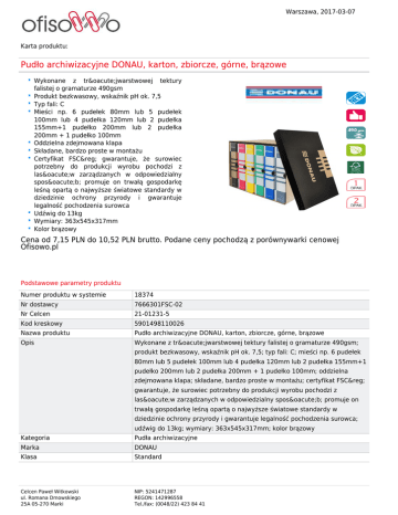 Warszawa, 2017-03-07 Karta produktu: Pudło archiwizacyjne DONAU, karton, zbiorcze, górne, brązowe Wykonane z trójwarstwowej tektury falistej o gramaturze 490gsm Produkt bezkwasowy, wskaźnik pH ok. 7,5 Typ fali: C Mieści np. 6 pudełek 80mm lub 5 pudełek 100mm lub 4 pudełka 120mm lub 2 pudełka 155mm+1 pudełko 200mm lub 2 pudełka 200mm + 1 pudełko 100mm Oddzielna zdejmowana klapa Składane, bardzo proste w montażu Certyfikat FSC® gwarantuje, że surowiec potrzebny do produkcji wyrobu pochodzi z lasów zarządzanych w odpowiedzialny sposób; promuje on trwałą gospodarkę leśną opartą o najwyższe światowe standardy w dziedzinie ochrony przyrody i gwarantuje legalność pochodzenia surowca Udźwig do 13kg Wymiary: 363x545x317mm Kolor brązowy Cena od 7,15 PLN do 10,52 PLN brutto. Podane ceny pochodzą z porównywarki cenowej Ofisowo.pl Podstawowe parametry produktu Numer produktu w systemie 18374 Nr dostawcy 7666301FSC-02 Nr Celcen 21-01231-5 Kod kreskowy 5901498110026 Nazwa produktu Pudło archiwizacyjne DONAU, karton, zbiorcze, górne, brązowe Opis Wykonane z trójwarstwowej tektury falistej o gramaturze 490gsm; produkt bezkwasowy, wskaźnik pH ok. 7,5; typ fali: C; mieści np. 6 pudełek 80mm lub 5 pudełek 100mm lub 4 pudełka 120mm lub 2 pudełka 155mm+1 pudełko 200mm lub 2 pudełka 200mm + 1 pudełko 100mm; oddzielna zdejmowana klapa; składane, bardzo proste w montażu; certyfikat FSC® gwarantuje, że surowiec potrzebny do produkcji wyrobu pochodzi z lasów zarządzanych w odpowiedzialny sposób; promuje on trwałą gospodarkę leśną opartą o najwyższe światowe standardy w dziedzinie ochrony przyrody i gwarantuje legalność pochodzenia surowca; udźwig do 13kg; wymiary: 363x545x317mm; kolor brązowy Kategoria Pudła archiwizacyjne Marka DONAU Klasa Standard Celcen Paweł Witkowski ul. Romana Dmowskiego 25A 05-270 Marki NIP: 5241471287 REGON: 142996558 Tel./fax: (0048/22) 423 84 41 Warszawa, 2017-03-07 Karta katalogowa produktu cd. Pudło archiwizacyjne DONAU, karton, zbiorcze, górne, brązowe Kolor Kolor Brązowy Cecha Etykieta Miejsce opisowe Materiał Tektura Produkt Pojemnik Rodzaj Składany Typ Zbiorcze W ofercie od 2013-06 Wymiary Format B.d. Format B.d. Gramatura (g/m2) 490 Szerokość (mm) 363 Wymiary (mm) 363x545x317 Ilość Ilość kartek B.d. Certyfikaty Nowy produkt w ofercie Standard Hit Hit Ilość lat gwarancji 1 Wspólny słownik zamówień CPV 30193700-5 Zamiennik Zamiennik 7666301PL-02 Serdecznie zapraszamy do współpracy zespół. Ofisowo.pl Celcen Paweł Witkowski ul. Romana Dmowskiego 25A 05-270 Marki NIP: 5241471287 REGON: 142996558 Tel./fax: (0048/22) 423 84 41