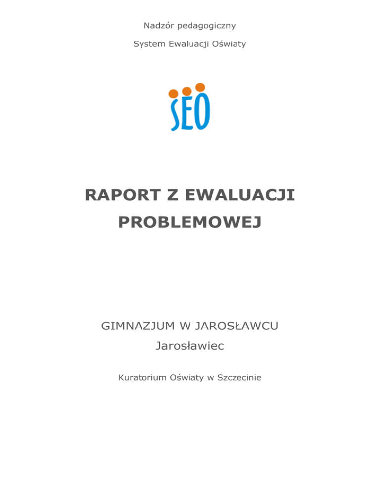 Nadzór pedagogiczny System Ewaluacji Oświaty RAPORT Z EWALUACJI PROBLEMOWEJ GIMNAZJUM W JAROSŁAWCU Jarosławiec Kuratorium Oświaty w Szczecinie Wstęp Prezentowany raport jest rezultatem ewaluacji zewnętrznej przeprowadzonej w szkole przez wizytatorów do spraw ewaluacji. Ewaluacja zewnętrzna polega na zbieraniu i analizowaniu informacji na temat funkcjonowania szkoły w obszarach wyznaczonych przez wymagania państwa: 1. Szkoła lub placówka realizuje koncepcję pracy ukierunkowaną na rozwój uczniów. 2. Procesy edukacyjne są zorganizowane w sposób sprzyjający uczeniu się. 3. Uczniowie nabywają wiadomości i umiejętności określone w podstawie programowej. 4. Uczniowie są aktywni. 5. Kształtowane są postawy i respektowane normy społeczne. 6. Szkoła lub placówka wspomaga rozwój uczniów, z uwzględnieniem ich indywidualnej sytuacji. 7. Nauczyciele współpracują w planowaniu i realizowaniu procesów edukacyjnych. 8. Promowana jest wartość edukacji. 9. Rodzice są partnerami szkoły lub placówki. 10. Wykorzystywane są zasoby szkoły lub placówki oraz środowiska lokalnego na rzecz wzajemnego rozwoju. 11. Szkoła lub placówka, organizując procesy edukacyjne, uwzględnia wnioski z analizy wyników sprawdzianu, egzaminu gimnazjalnego, egzaminu maturalnego, egzaminu potwierdzającego kwalifikacje zawodowe i egzaminu potwierdzającego kwalifikacje w zawodzie oraz innych badań zewnętrznych i wewnętrznych. 12. Zarządzanie szkołą lub placówką służy jej rozwojowi. Ewaluacja ma także na celu ustalenie, czy szkoła spełnia badane wymagania zawarte w rozporządzeniu Ministra Edukacji Narodowej z dnia 6.08.2015 r. Szkoła może spełniać wymagania na poziomie podstawowym i podejmować działania z wysokiego poziomu wymagania. GIMNAZJUM W JAROSŁAWCU 2/30 Opis metodologii Badanie zostało zrealizowane w dniach 17-03-2016 - 23-03-2016 przez zespół wizytatorów ds. ewaluacji, w skład którego weszli: Maria Łapacz-Domaradzka, Katarzyna Dajczak. Badaniem objęto 43 uczniów (ankiety), 42 rodziców (ankieta i wywiad grupowy) i 8 nauczycieli (ankieta i wywiady grupowe). Przeprowadzono wywiad indywidualny z dyrektorem szkoły, a także obserwacje lekcji i analizę danych zastanych. Na podstawie zebranych danych został sporządzony raport, który obejmuje podstawowe obszary działania szkoły określone w wymaganiach: ● Uczniowie nabywają wiadomości i umiejętności określone w podstawie programowej. ● Szkoła lub placówka wspomaga rozwój uczniów, z uwzględnieniem ich indywidualnej sytuacji. ● Szkoła lub placówka, organizując procesy edukacyjne, uwzględnia wnioski z analizy wyników sprawdzianu, egzaminu gimnazjalnego, egzaminu maturalnego, egzaminu potwierdzającego kwalifikacje zawodowe i egzaminu potwierdzającego kwalifikacje w zawodzie oraz innych badań zewnętrznych i wewnętrznych. Wyjaśnienie skrótów dla narzędzi: OZ - Akusz obserwacji zajęć AD - Kwestionariusz ankiety dla dyrektora/dyrektorki szkoły AN - Kwestionariusz ankiety dla nauczycieli AR - Kwestionariusz ankiety dla rodziców AMD - Kwestionariusz ankiety dla uczniów "Mój dzień" AMS - Kwestionariusz ankiety dla uczniów "Moja szkoła" APW - Kwestionariusz ankiety poewaluacyjnej dla wizytatora ADZ - Kwestionariusz badania "Analiza danych zastanych" WN - Scenariusz wywiadu grupowego z nauczycielami WR - Scenariusz wywiadu grupowego z rodzicami WD - Scenariusz wywiadu z dyrektorem/dyrektorką szkoły WNPO - Scenariusz wywiadu z nauczycielem po obserwacji WNO - Scenariusz wywiadu z zespołem nauczycieli uczących w jednym oddziale GIMNAZJUM W JAROSŁAWCU 3/30 Obraz placówki Szkoła Podstawowa w Jarosławcu w swoim działaniu kieruje się mottem "Nie ma lustra, które by lepiej odbijało człowieka niż jego słowa" i dba, aby uczniowie postępowali w myśl tej sentencji. Szkoła uczy kultury słowa, asertywnego zachowania, wpaja tolerancję, umiejętność radzenia sobie ze stresem. Baza lokalowa szkoły mieści się w kilku budynkach i jest modernizowana. Do dyspozycji uczniów są dobrze wyposażone klasy - w każdej klasie znajduje się komputer z dostępem do Internetu, sprzęt multimedialny, w dwóch tablice interaktywne, funkcjonuje dziennik elektroniczny. Uczniowie korzystają z kompleksu boisk sportowych ORLIK, placu zabaw oraz sali gimnastycznej. Szkoła zatrudnia specjalistów do pracy z uczniami o specjalnych potrzebach edukacyjnych. Są to pedagog, psycholog, logopedzi, oligofrenopedagodzy, trenerzy. Oferta edukacyjna szkoły jest skierowana do uczniów o różnych potrzebach edukacyjnych. Uczniowie korzystają z zajęć wyrównawczych, korekcyjno - kompensacyjnych, logopedycznych, terapeutycznych, rewalidacyjnych oraz sportowych. W szkole funkcjonują koła przedmiotowe, zespół wokalny oraz koło teatralne "Latarnia". Oferta daje uczniom możliwość wyrównania szans edukacyjnych oraz możliwość rozwijania zainteresowań. Nauczyciele organizują konkursy uwzględniając możliwości uczniów słabszych np. konkurs na piosenkę anglojęzyczną, na kartkę świąteczną napisaną w języku angielskim lub niemieckim, konkurs przyrodniczy, itp. Szkoła aktywnie współpracuje z Centrum Kultury i Sportu w Postominie i jest współgospodarzem Międzynarodowego Biegu po Plaży oraz Ogólnopolskiego Biegu Mikołajkowego. Oferta szkoły jest rozszerzana - wprowadzono programy autorskie - "W tanecznym kręgu", "Muzyka i teatr", zorganizowano sekcję pływacką. Dzięki konsekwentnym i skutecznym działaniom kadry pedagogicznej uczniowie odnoszą sukcesy w konkursach przedmiotowych, tematycznych, przeglądach artystycznych i zawodach sportowych, a szkoła systematycznie poprawia efekty kształcenia. GIMNAZJUM W JAROSŁAWCU 4/30 Informacja o placówce Nazwa placówki Patron GIMNAZJUM W JAROSŁAWCU Typ placówki Gimnazjum Miejscowość Jarosławiec Ulica BAŁTYCKA Numer 65 B Kod pocztowy 76-107 Urząd pocztowy JAROSŁAWIEC Telefon 0598109417 Fax 0598109417 Www WWW.ZS