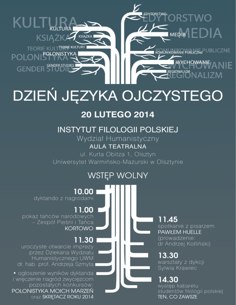 DZIEŃ JĘZYKA OJCZYSTEGO 20 LUTEGO 2014 INSTYTUT FILOLOGII POLSKIEJ Wydział Humanistyczny AULA TEATRALNA ul. Kurta Obitza 1, Olsztyn Uniwersytet Warmińsko-Mazurski w Olsztynie WSTĘP WOLNY 10.00 dyktando z nagrodami 11.00 pokaz tańców narodowych – Zespół Pieśni i Tańca KORTOWO 11.30 uroczyste otwarcie imprezy przez Dziekana Wydziału Humanistycznego UWM dr. hab. prof. Andrzeja Szmyta • ogłoszenie wyników dyktanda i wręczenie nagród zwycięzcom pozostałych konkursów: POLONISTYKA MOICH MARZEŃ oraz SKRĘTACZ ROKU 2014 11.45 spotkanie z pisarzem PAWŁEM HUELLE (prowadzenie: dr Andrzej Kotliński) 13.30 warsztaty z dykcji Sylwia Krawiec 14.30 występ kabaretu studentów filologii polskiej TEN, CO ZAWSZE