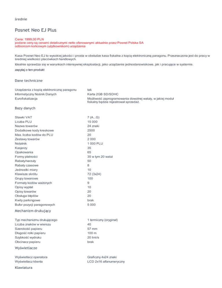 średnie Posnet Neo EJ Plus Cena: 1999,00 PLN podane ceny są cenami detalicznymi netto oferowanymi aktualnie przez Posnet Polska SA odbiorcom końcowym (użytkownikom) urządzenia Kasa Posnet Neo EJ to wysokiej jakości i prosta w obsłudze kasa fiskalna z kopią elektroniczną paragonu. Przeznaczona jest do pracy w średniej wielkości placówkach handlowych. Idealnie sprawdza się w warunkach intensywnej eksploatacji, jako urządzenie jednostanowiskowe, jak i pracujące w systemie. zapytaj o ten produkt Dane techniczne Urządzenia z kopią elektroniczną paragonu Informatyczny Nośnik Danych Eurofiskalizacja tak Karta 2GB SD/SDHC Możliwość zaprogramowania dowolnej waluty, w jakiej moduł fiskalny będzie rejestrował sprzedaż. Bazy danych Stawki VAT Liczba PLU Nazwa towarów Dodatkowe kody kreskowe Max. liczba kodów do PLU Zestawy towarów Notatnik Kasjerzy Opakowania Formy płatności Rabaty/narzuty Rabaty czasowe Jednostki miary Klawisze skrótu Grupy towarowe Formaty kodów ważonych Opisy wypłat Opisy towarów Obsługa błędów Kwity parkingowe Bufor pozycji paragonowych 7 (A...G) 15 000 24 znaki 2500 20 2 000 1 000 PLU 35 65 35 w tym 20 walut 50 8 10 72 (3x24) 100 9 10 20 20 brak 5 000 Mechanizm drukujący Typ mechanizmu drukującego Liczba znaków w wierszu Szerokość papieru Długość rolki papieru Szybkość wydruku Obcinacz papieru 1 termiczny (oryginał) 40 57 mm 100 m 20 linii/s brak Wyświetlacze Wyświetlacz operatora Wyświetlacz klienta Klawiatura Graficzny 4x24 znaki LCD 2x16 alfanumeryczny Liczba klawiszy klawiatury 56 w tym 24 programowalne (trzy poziomy) Komunikacja Porty standardowe Porty dodatkowe Szuflada Obsługiwane urządzenia Komunikacja z komputerem 1xUSB 3xRS232 Ethernet (po zastosowaniu konwertera LAN-RS) 2 x RS232, 1 x PS2 (po zastosowaniu Multipleksera) 6V komputer, modem, skaner, waga, pinpad, weryfikator cen, drukarka paragonowa, multiplekser, szuflada ON-LINE bez przerywania pracy kasjera Zasilanie Zasilacz zewnętrzny Wbudowany akumulator Ładowarka samochodowa Port USB 230V / 15V/1A zapewniający wydruk min. 6000 linii brak brak Wymiary, waga, temeratury Wymiary Waga Zakres temperatur pracy 314 x 147 x 368 mm (szer. x wys. dł.) ~4,4kg 5 – 40o C Inne Wyposażenie dodatkowe Najważniejsze funkcje Szuflada kasowa Posnet SKL Szuflada kasowa flip-top Szuflada kasowa duża i średnia Multiplekser Silikonowa osłona klawiatury Kopia elektroniczna paragonu (karta SD/SDHC) Baza towarowa 15000 PLU Złącza 3 x RS232, 1 X USB Alfanumeryczny wyświetlacz operatora LCD 4 x 20 znaków Wielowalutowość (przygotowana na eurofiskalizację) Dłuższa, 100 metrowa rolka papieru oryginału Najwyższy standard wykonania Nowoczesny i elegancki design Dodatkowe informacje Najważniejsze cechy produktu: Kopia elektroniczna paragonu (karta SD/SDHC) Baza towarowa 15000 PLU Złącza 3 x RS232, 1 X USB Graficzny 4x24 znaki Wielowalutowość (przygotowana na eurofiskalizację) Dłuższa, 100 metrowa rolka papieru oryginału Najwyższy standard wykonania Nowoczesny i elegancki design Polecana dla: sklepy i supermarkety spożywczo-przemysłowe sklepy drogeryjno-kosmetyczne piekarnie i cukiernie nieduże i średnie lokalne gastronomiczne, fast-food itp. butiki różnorakie sklepy: mięsno-wędliniarskie, monopolowe, pasmanterie, jubilerskie