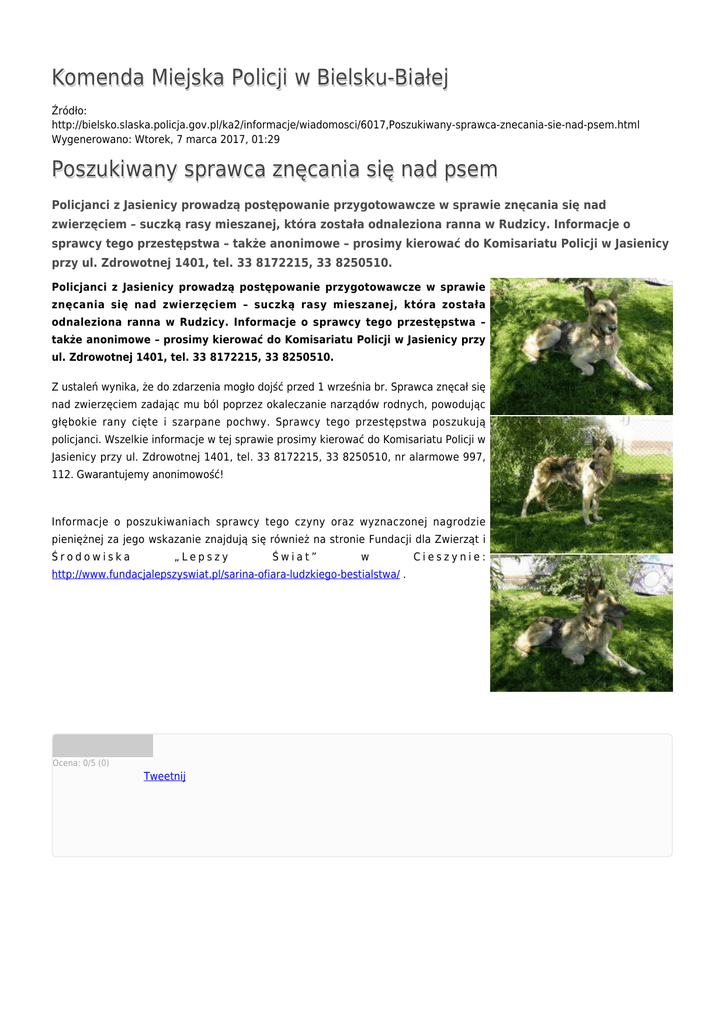 Komenda Miejska Policji w Bielsku-Białej Źródło: http://bielsko.slaska.policja.gov.pl/ka2/informacje/wiadomosci/6017,Poszukiwany-sprawca-znecania-sie-nad-psem.html Wygenerowano: Wtorek, 7 marca 2017, 01:29 Poszukiwany sprawca znęcania się nad psem Policjanci z Jasienicy prowadzą postępowanie przygotowawcze w sprawie znęcania się nad zwierzęciem – suczką rasy mieszanej, która została odnaleziona ranna w Rudzicy. Informacje o sprawcy tego przestępstwa – także anonimowe – prosimy kierować do Komisariatu Policji w Jasienicy przy ul. Zdrowotnej 1401, tel. 33 8172215, 33 8250510. Policjanci z Jasienicy prowadzą postępowanie przygotowawcze w sprawie znęcania się nad zwierzęciem – suczką rasy mieszanej, która została odnaleziona ranna w Rudzicy. Informacje o sprawcy tego przestępstwa – także anonimowe – prosimy kierować do Komisariatu Policji w Jasienicy przy ul. Zdrowotnej 1401, tel. 33 8172215, 33 8250510. Z ustaleń wynika, że do zdarzenia mogło dojść przed 1 września br. Sprawca znęcał się nad zwierzęciem zadając mu ból poprzez okaleczanie narządów rodnych, powodując głębokie rany cięte i szarpane pochwy. Sprawcy tego przestępstwa poszukują policjanci. Wszelkie informacje w tej sprawie prosimy kierować do Komisariatu Policji w Jasienicy przy ul. Zdrowotnej 1401, tel. 33 8172215, 33 8250510, nr alarmowe 997, 112. Gwarantujemy anonimowość! Informacje o poszukiwaniach sprawcy tego czyny oraz wyznaczonej nagrodzie pieniężnej za jego wskazanie znajdują się również na stronie Fundacji dla Zwierząt i Środowiska „Lepszy Świat” w http://www.fundacjalepszyswiat.pl/sarina-ofiara-ludzkiego-bestialstwa/ . Ocena: 0/5 (0) Tweetnij Cieszynie: