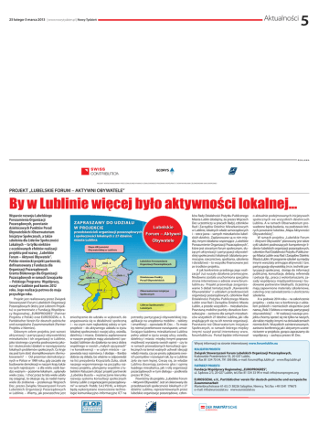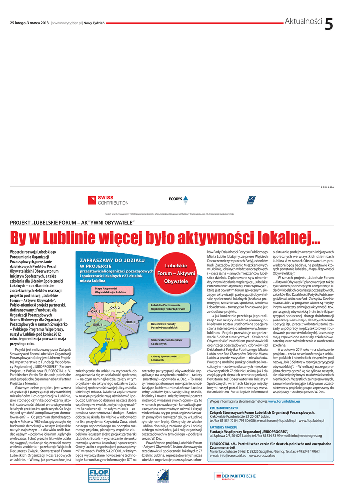 Aktualności 25 lutego-3 marca 2013 | www.nowytydzien.pl | Nowy Tydzień reklama 352-(.7©©:63Íß),1$162:$1<©35=(=©6=:$-&$5,đ©:©5$0$&+©6=:$-&$56.,(*2©352*5$08©:63Íß35$&<©=©12:<0,©.5$-$0,©&=ß21.2:6.,0,©81,,©(8523(-6.,(- PROJEKT „LUBELSKIE FORUM – AKTYWNI OBYWATELE” Lubelskie By w Lublinie więcej było aktywności lokalnej… ZAPRASZAMY DO UDZIAŁU W PROJEKCIE przedstawicieli organizacji pozarządowych i społeczności lokalnych z 27 dzielnic ZAPRASZAMY DO UDZIAŁU miasta Lublina 352-(.7©©:63Íß),1$162:$1<©35=(=©6=:$-&$5,đ©:©5$0$&+©6=:$-&$56.,(*2©352*5$08©:63Íß35$&<©=©12:<0,©.5$-$0,©&=ß21.2:6.,0,©81,,©(8523(-6.,(- Wsparcie rozwoju Lubelskiego Porozumienia Organizacji Pozarządowych, powstanie dzielnicowych Punktów Porad Obywatelskich i Obserwatorium Inicjatyw Społecznych, a także szkolenia dla Liderów Społeczności Lokalnych – to tylko niektóre z oczekiwanych efektów realizacji projektu pod nazwą „Lubelskie Forum – Aktywni Obywatele”. Polsko-niemiecki projekt partnerski, dofinansowany z Funduszu dla Organizacji Pozarządowych Grantu Blokowego dla Organizacji Pozarządowych w ramach Szwajcarko – Polskiego Programu Współpracy, ruszył w Lublinie pod koniec 2012 roku. Jego realizacja potrwa do maja przyszłego roku. Projekt jest realizowany przez Związek Stowarzyszeń Forum Lubelskich Organizacji Pozarządowych (który jest Liderem Projektu) w partnerstwie z Fundacją Współpracy Regionalnej „EUROPROGRES” (Partner Projektu z Polski) oraz EUROSOZIAL e. V. Paritätischer Verein für deutsch-polnische und europäische Zusammenarbeit (Partner Projektu z Niemiec). Głównym celem projektu jest wzrost aktywizacji i partycypacji obywatelskiej mieszkańców i ich organizacji w Lublinie, jako istotnego czynnika podnoszenia jakości i skuteczności działań w rozwiązywaniu lokalnych problemów społecznych. Co kryje się pod tym dość skomplikowanym sformułowaniem? – Od przemian demokratycznych w Polsce w 1989 roku, gdy zaczęło się budowanie demokracji w naszym kraju także na tych najniższym – a dla wielu osób bardzo ważnym – poziomie lokalnym , upłynęło wiele czasu. I choć przez te lata wiele udało się osiągnąć, to okazuje się, że nadal mamy wiele do zrobienia – przekonuje Wojciech Dec, prezes Związku Stowarzyszeń Forum Lubelskich Organizacji Pozarządowych w Lublinie. – Wiemy, jak powszechne jest ków Rady Działalności Pożytku Publicznego Forum – Aktywni o aktualnie podejmowanych inicjatywach Miasta Lublin (dodajmy, że prezes Wojciech społecznych we wszystkich dzielnicach Dec uczestniczy w pracach Rady), członków Lublina. A w ramach Obserwatorium proRad i Zarządów Dzielnic Mieszkaniowych wadzone będą badania, na podstawie któLubelskie W PROJEKCIE w Lublinie, lokalnych władz samorządowych rych powstanie lubelska „Mapa Aktywności przedstawicieli organizacji pozarządowych Mapa Aktywności i – rzecz jasna – samych mieszkańców lubel- Obywatelskiej”. Forum – Aktywni i społeczności lokalnych z 27 dzielnic skich dzielnic. Zaplanowane są w nim mięW ramach projektu „Lubelskie Forum Obywatelskiej w Lublinie miasta Lublina Obywatele dzy innymi działania wspierające „Lubelskie – Aktywni Obywatele” planowany jest także Porozumienie Organizacji Pozarządowych”, cykl szkoleń podnoszących kompetencje liprzedstawicieli organizacji pozarządowych Mapa Aktywności które jest otwartym forum społecznym, słu- derów lubelskich organizacji pozarządowych, Obywatelskiej w Lublinie i społeczności lokalnych z 27 dzielnic żącym aktywizacji i partycypacji obywatel- członków Rad Działalności Pożytku PubliczneLubelskie skiej Porozumienie społeczności lokalnych (działania pro- go Miasta Lublin oraz Rad i Zarządów Dzielnic miasta Lublina OKR. 2 Organizacji Pozarządowych mocyjne, rzecznictwo, spotkania, szkolenia Miasta Lublin. W programie szkoleń są między Lubelskie Porozumienie OKR. 32 i doradztwo) – to wszystko finansowane jest innymi warsztaty animujące aktywność i tzw. OKR. Organizacji Pozarządowych Mapa Aktywności OKR. 3 ze środków projektu. partycypację obywatelską (m.in. techniki parA jak konkretnie przebiega jego reali- tycypacji społecznej, dostęp do informacji Obywatelskiej w Lublinie zacja? Już ruszyły działania promocyjne. publicznej, konsultacje, debaty, referenda OKR. 1 OKR. 1 Dzielnicowe Punkty Dzielnicowe Punkty Niedawno została uruchomiona specjalna i petycje itp., praca z wolontariuszami, zaOKR. 4 OKR. 4 Porad Obywatelskich strona internetowa o adresie www.forum- sady współpracy międzysektorowej i buPorad Obywatelskich Projekt przewiduje zorganizo- dowanie partnerstw lokalnych). Uczestnicy Lubelskie lublin.eu Porozumienie wanie 5 debat tematycznych „Kawiarenki mają zapewnione materiały szkoleniowe, OKR. 2 Obserwatorium Inicjatyw OKR. 5 Organizacji Pozarządowych Obywatelskie” z udziałem przedstawicieli catering oraz zaświadczenia o ukończeniu Społecznych OKR. 3 OKR. 5 organizacji pozarządowych, członków Rad szkolenia. Obserwatorium Inicjatyw Działalności Pożytku Publicznego Miasta A w połowie 2014 roku – na zakończenie Społecznych Lublin oraz Rad i Zarządów Dzielnic Miasta projektu – czeka nas w konferencja z udziaLiderzy Społeczności Lublin, a przede wszystkim – mieszkańców. łem polskich i niemieckich ekspertów pod OKR. 1 Lokalnych Dzielnicowe Punkty Powstaną mobilne punkty doradczo-kon- nazwą „Rola 3 Sektora w rozwoju partycypacji OKR. 4 sultacyjne – zarówno dla samych mieszkań- obywatelskiej”. – W realizacji naszego proPorad Obywatelskich Liderzy zniechęcenie do udziału w wyborach, do potrzeby partycypacji obywatelskiej (np. Społeczności ców wszystkich 27 dzielnic Lublina, jak i dla jektu chcemy oprzeć się nie tylko na naszych, Biuro projektu: angażowania się w działalność aplikacje na urządzenia mobilne –Lokalnych tablety znajdujących się na ich terenie orga