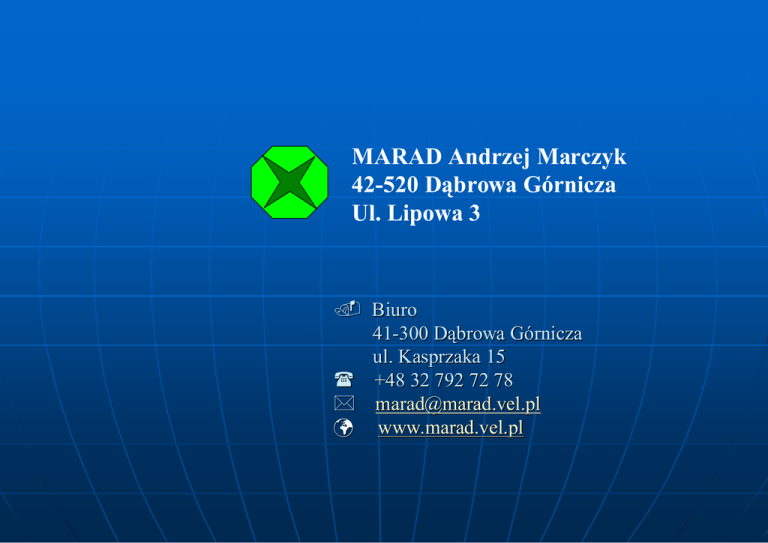 MARAD Andrzej Marczyk 42-520 Dąbrowa Górnicza Ul. Lipowa 3 . Biuro 41-300 Dąbrowa Górnicza ul. Kasprzaka 15 ( +48 32 792 72 78 * [email protected] ü www.marad.vel.pl Jesteśmy nowoczesną firmą spełniającą europejskie standardy. Nasze produkty wykonujemy z najwyższą starannością o szczegóły i detale. Naszą misją jest zadowolenie klienta zawsze, przy każdym nawet najmniejszym zleceniu. Zastosowanie nowych technologii w powiązaniu z długoletnim doświadczeniem Naszej kadry pracowniczej pozwala budować maszyny i urządzenia o najwyższej jakości. Zajmujemy się projektowaniem, wykonaniem, dostawą maszyn, urządzeń, linii produkcyjnych dla przemysłu AGD, RTV, przemysłu spożywczego, przetwórczego, motoryzacyjnego oraz lotniczego. n n n n n n PROFIL DZIAŁALNOŚCI FIRMY Wykonanie dokumentacji technicznej maszyn i urzą urządzeń dzeń Automatyzacja sterowania maszyn i urzą urządzeń dzeń n projektowanie ukł układó adów automatyki i schemató schematów elektrycznych n oprogramowanie sterownikó sterowników n modyfikacja gotowych rozwią rozwiązań zań Wykonanie montaż montaż i dostawa: n Manipulatoró Manipulatorów n Stanowisk montaż montażowych n przyrzą przyrządów spawalniczych n obrotnikó obrotników spawalniczych n urzą urządzeń dzeń testują testujących / sprawdzianó sprawdzianów n konstrukcji stalowych n linii produkcyjnych n wózkó zków do transportu wewnę wewnętrznego n wykonanie instalacji pneumatycznych n wykonanie instalacji hydraulicznych Modernizacje urzą urządzeń dzeń dla speł spełnienia norm CE / nadanie znaku CE n wykonanie dokumentacji techniczno ruchowej maszyn i urzą urządzeń dzeń w celu przystosowania ich do wymogó wymogów norm WE n inwentaryzacja maszyn pod wzglę względem mechanicznym, elektrycznym, pneumatycznym, n opracowanie instrukcji obsł obsługi, n przeprowadzenie analizy na zgodność zgodność z normami WE n opracowanie dokumentacji niezbę niezbędnej do wykonania modernizacji maszyn w celu przystosowania ich do wymagań wymagań normy WE. Usł Usługi n usł usługi w zakresie wykonania wszelkiego rodzaju obó obórki skrawaniem n modernizacje linii produkcyjnych ZREALIZOWANE ZADANIA PONIŻEJ PRZEDSTAWIAMY NIEKTÓRE ZE ZREALIZOWANYCH ZADAŃ PRZEZ FIRMĘ MARAD Przyrządy i stanowiska montażowe - - - - - Wykonanie przyrzą przyrządów montaż montażowych do skł składania elementó elementów samolotu Air Bus Zaprojektowanie i wykonanie stanowiska do odsysania wody ze zmywarki dla Indesit Polska Zaprojektowanie i wykonanie stanowiska do skrę skręcania kolumny Mc Pherson ze zwrotnicą zwrotnicą dla firmy DPI – ZCS Ciechanó Ciechanów Zaprojektowanie i wykonanie stanowiska do skrę skręcania amortyzatora dla SCG Polska Gliwice Zaprojektowanie i wykonanie stanowiska do montaż montażu szyby tylnej samochodu Kia Sportage Zaprojektowanie i wykonanie stanowiska do montaż montażu pierś pierścienia stalowego oraz gumowego o-ring na tł tłoczysko dla firmy BWI NORTH AMERICA INT. Manipulatory n Wykonanie modernizacji manipulatorów do zmywarki naczyń dla Electrolux Sp. z o.o. w Żarowie n Zaprojektowanie i wykonanie automatycznej stacji do testowania hederów zbożowych dla firmy CNH Polska. n Wykonanie modernizacji manipulatora do przykręcania drążka reakcyjnego w samochodzie Agila dla Opel Polska Urządzenia testujące / sprawdziany n n n n Zaprojektowanie i wykonanie urządzenia do napawania ślimaków dla CNH Polska Sp. z o.o. Zaprojektowanie i wykonanie urządzenia do testowania obrywaczy dla CNH Polska sp. z o.o. Zaprojektowanie i wykonanie urządzenia do prostowania i pomiaru bicia promieniowego ślimaków dla CNH Polska Urządzenie do testowania, kalibracji i regulacji pras rolujących wraz z bezprzewodowym sterowaniem radiowym dla CNH Polska • Linia montażu • Wykonanie linii do produkcji łóżek szpitalnych dla Famed S.A • • Zaprojektowanie i wykonanie linii montażu tylnej osi Chewrolet Aveo wraz z montażem na FSO Warszawa dla firmy ZPP Auto Sp. z o.o. • • Adaptacja, przeniesienie oraz montaż w FSO Warszawa linii montażu kolumny Mc Pherson Chewroleta Aveo dla firmy DPI – ZCS Ciechanów. • • Wykonanie płyt stalowych do montażu robotów przemysłowych dla Opel Polska Przenośniki n n Zaprojektowanie i wykonanie przenośnika do transportu kolumny Mc Phersona dla firmy DPI – ZCS Ciechanów Zaprojektowanie i wykonanie przenośnika do transportu deski rozdzielczej dla firmy Denso Wózki do transportu wewnętrznego n Wykonanie serii wózków Wax Trolley dla firmy Beck & Pollitzer Polska Sp. z o.o. n Wykonanie wózka szpuli dla Segu Polska Sp. z o.o. Stoły nożycowe n n Wykonanie stołów nożycowych dla zróżnicowania poziomu linii do produkcji łóżek szpitalnych dla Famed S.A. Zaprojektowanie i wykonanie stołów nożycowych do załadunku i rozładunku palet na linii montażu tylnej osi Chewrolet Aveo dla firmy ZPP AUTO Sp. z o.o. Przyrządy spawalnicze - - - Zaprojektowanie i wykonanie przyrządu spawalniczego do spawania elementów siedzenia samochodu FSB Abarth Proto dla Johnson Controls Zaprojektowanie i wykonanie przyrządów spawalniczych do spawania elementów typoszeregu deskowania ściennego dla Ulma System S.A. Wykonanie przyrządów do zgrzewania osłon kombajnu CX dla CNH Polska Modernizacje i nadanie CE - - - - - Przeprowadzenie montażu obudów dla linii Katex dla Sekurit SaintGobain Sp. z o.o. Wykonanie renowacji frezarki oraz obudowy dźwiękochłonnej dla firmy Logstor Ror Polska Sp. z o.o. Wykonanie modernizacji manipulatora do przykręcania drążka reakcyjnego w samochodzie Agila dla Opel Polska Wykonanie modernizacji pojemników siatkowych do transportu wewnątrzzakładowego części samochodu Panda Wykonanie dokumentacji techniczno - ruchowej maszyn i urządzeń, w celu przystosowania ich do wymogów norm WE Instalacje pneumatyczne - - - - Zaprojektowanie i wykonanie systemu pneumatycznego napędu i sterowania ramką aktywn