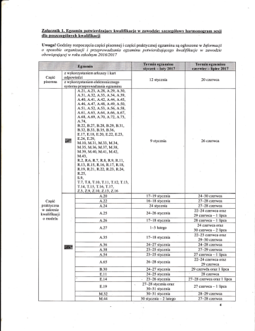 rzałacznik 1. Egzamin potwierdzaiacv kwalifikacie w zawodzie: szczególowv harmonogram sesii dla noszczególnvch kwalifikacii Uwaga! Godziny rozpoczęciaczęści pisemnej i części praktycmej egzaminu są ogłoszone w Informacji sposobie organizacji i przeprowadzania egzaminu potwierdzajqcego kwali/ikacje w zqwodzie obowiqzujqcej w roku szkolnym 20]6/2017 o mnu, 901: z wykorzystaniem arkuszy i kart Część pisemna odpowiedzi 12 stycznia 20 czerwca 9 stycznia 26 częrwca A.20 A.22 A.24 17-19 stycznia A.25 24-26 stycznia A.26 l7-18 stvcznia 24-30 częrwca 27--28 częrwca 27--28 czerwca 22-24 częrwcaoraz 29 częrwca- I lipca 28 częrwca- l lipca z wykorzystaniem elektronicznego svstemu Drzeoro wadzania e szaminu A.21, A.23, A.28, A.29, A.30, A.3l, A.3.2, A.33, A.34, A.39, A.40, A.4I, A,42, A.44, A.45, A.46, A.47, A.48, A.49, A.50, A.51, A.52, A.53, A.56, A,58, A.61, A.63, A.64, A.66, A.67, A.68, A.69, A.70, A.72, A.73, A.74, W B,22, B.27, B.28, B.29, B.3I, B.32,B.33, B.35, B.36, E. l 7, E,l 8, E.20, E.22, E.23, E.24,E.29, M.l0, M.31, M.33, M,34, M.35, M.36, M,37, M,38" M.39, M.40, M.4I,M.42, M.43, R.2, R.6, R.7, R.8, R.9, Rl1, R.13, R.l5, R.16, Rl7, R.l8, R.l9, R.21, R.22, R.23, R.24, R.25, S.9, T.7, T.8, T.l0, T.11, T.l2,T.I3, T.l4, T.l5, T.16,T.17 , Z.3- Z.9. Z.|0^ Z.l3^ Z.16 Część praktyczna w zakręsie kwalifikacji o modelu 16-18 stycznia 24 stycznia 1-3 lutego ^.27 ffi A.35 l7-18 stycznia A,.36 24-2'7 stycznia 23-25 stycznia A.38 A.54 23-25 stycznia A.65 26-28 stycznia B.30 24-27 stycznia 24-25 stycznia 23-26 stvcznta 27-28 stycznia oraz 30-31 stycznia E.l1 F..|4 E.19 M.32 M.44 3G-31 stycznia 30 stycznia-2 luteso 24 czqwcaotaz 30 czerwca - 2lipca 22-23 częrwcaoraz 29-30 czerwca 24ł8 czerwca 27--29 czerwca 27 czerwca- l lipca 22-24 ęzerwcaoraz 29 częrwca, 29 czerwća oraz l lipca ż8 częrwca 27-28 częrwca oraz l Iipca 27 czerwca- 1 Ltpca 28-29 czerwca 27-28 częrwca 4