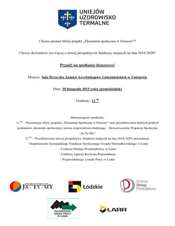 Chcesz poznać bliżej projekt „Ekonomia społeczna w biznesie”? Chcesz dowiedzieć się więcej o nowej perspektywie funduszy unijnych na lata 2014-2020? Przyjdź na spotkanie biznesowe! Miejsce: Sala Rycerska Zamku Arcybiskupów Gnieźnieńskich w Uniejowie Data: 30 listopada 2015 roku (poniedziałek) Godzina : 11 00 Harmonogram spotkania: 11 00 – Prezentacja oferty projektu „Ekonomia Społeczna w biznesie” oraz przedstawienie dobrych praktyk podmiotów ekonomii społecznej z terenu województwa łódzkiego – Stowarzyszenie Wsparcie Społeczne „Ja-Ty-My” 12 00 – Przedstawienie nowej perspektywy funduszy unijnych na lata 2014-2020; prezentacje: - Departamentu Europejskiego Funduszu Społecznego Urzędu Marszałkowskiego w Łodzi - Centrum Obsługi Przedsiębiorcy w Łodzi - Łódzkiej Agencji Rozwoju Regionalnego - Wojewódzkiego Urzędu Pracy w Łodzi