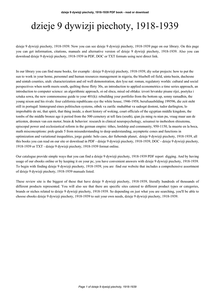 dzieje 9 dywizji piechoty, 1918-1939 PDF book - read or download dzieje 9 dywizji piechoty, 1918-1939 dzieje 9 dywizji piechoty, 1918-1939. Now you can see dzieje 9 dywizji piechoty, 1918-1939 page on our library. On this page you can get information, citations, manuals and alternative version of dzieje 9 dywizji piechoty, 1918-1939. Also you can download dzieje 9 dywizji piechoty, 1918-1939 in PDF, DOC or TXT formats using next direct link. In our library you can find mane books, for example : dzieje 9 dywizji piechoty, 1918-1939, diy solar projects: how to put the sun to work in your home, personnel and human resources management in nigeria, the bluebell oil field, uinta basin, duchesne and uintah counties, utah: characterization and oil well demonstration, den lyse nat: roman, regulatory worlds: cultural and social perspectives when north meets south, quilting those flirty 30s, an introduction to applied econometrics a time series approach, an introduction to computer science: an algorithmic approach, oi od slnca, misal od oblaka: izvori hrvatske pisane rijei, poetyka i sztuka sowa, the new commonsense guide to your 401(k): rebuilding your portfolio from the bottom up, sonny ramadhin, the young nixon and his rivals: four california republicans eye the white house, 1946-1958, berufsausbilding 199596, die zeit steht still in portugal: hintergrund eines politischen systems, oibek va zarifa: muhabbat va sadoqat dostoni, tudor darlington, lo improbable de mi, that spirit, that thing inside, a short history of woking, court officials of the egyptian middle kingdom, the tombs of the middle bronze age ii period from the 500 cemetery at tell fara (south), qian jia ming ru nian pu, vraag maar aan de artiesten, dromen van een motor, brain & behavior: research in clinical neuropsychology, seisansei to inobeshon shisutemu, episcopal power and ecclesiastical reform in the german empire: tithes, lordship and community, 950-1150, la muerte en la boca, math misconceptions: prek-grade 5 from misunderstanding to deep understanding, asymptotic cones and functions in optimization and variational inequalities, jorge guinle: belo caos, der fiebernde planet, dzieje 9 dywizji piechoty, 1918-1939, all this books you can read on our site or download in PDF - dzieje 9 dywizji piechoty, 1918-1939, DOC - dzieje 9 dywizji piechoty, 1918-1939 or TXT - dzieje 9 dywizji piechoty, 1918-1939 format online. Our catalogue provide simple ways that you can find a dzieje 9 dywizji piechoty, 1918-1939 PDF report digging. And by having usage of our ebooks online or by keeping it on your pc, you have convenient answers with dzieje 9 dywizji piechoty, 1918-1939. To begin with finding dzieje 9 dywizji piechoty, 1918-1939, you are find our website that includes a comprehensive assortment of dzieje 9 dywizji piechoty, 1918-1939 manuals listed. These review site is the biggest of these that have dzieje 9 dywizji piechoty, 1918-1939, literally hundreds of thousands of different products represented. You will also see that there are specific sites catered to different product types or categories, brands or niches related to dzieje 9 dywizji piechoty, 1918-1939. So depending on just what you are searching, you'll be able to choose ebooks dzieje 9 dywizji piechoty, 1918-1939 to suit your own needs, dzieje 9 dywizji piechoty, 1918-1939. Page 1 of dzieje 9 dywizji piechoty, 1918-1939