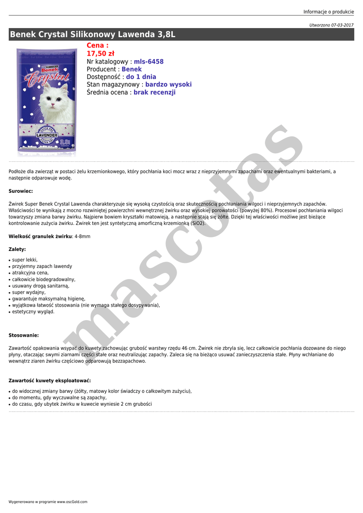 Informacje o produkcie Utworzono 07-03-2017 Benek Crystal Silikonowy Lawenda 3,8L Cena : 17,50 zł s Nr katalogowy : mls-6458 Producent : Benek Dostępność : do 1 dnia Stan magazynowy : bardzo wysoki Średnia ocena : brak recenzji Surowiec: co ta Podłoże dla zwierząt w postaci żelu krzemionkowego, który pochłania koci mocz wraz z nieprzyjemnymi zapachami oraz ewentualnymi bakteriami, a następnie odparowuje wodę. Żwirek Super Benek Crystal Lawenda charakteryzuje się wysoką czystością oraz skutecznością pochłaniania wilgoci i nieprzyjemnych zapachów. Właściwości te wynikają z mocno rozwiniętej powierzchni wewnętrznej żwirku oraz wysokiej porowatości (powyżej 80%). Procesowi pochłaniania wilgoci towarzyszy zmiana barwy żwirku. Najpierw bowiem kryształki matowieją, a następnie stają się żółte. Dzięki tej właściwości możliwe jest bieżące kontrolowanie zużycia żwirku. Żwirek ten jest syntetyczną amorficzną krzemionką (SiO2). Wielkość granulek żwirku: 4-8mm Zalety: ● ● ● ● ● ● ● ● super lekki, przyjemny zapach lawendy atrakcyjna cena, całkowicie biodegradowalny, usuwany drogą sanitarną, super wydajny, gwarantuje maksymalną higienę, wyjątkowa łatwość stosowania (nie wymaga stałego dosypywania), estetyczny wygląd. m as ● Stosowanie: Zawartość opakowania wsypać do kuwety zachowując grubość warstwy rzędu 46 cm. Żwirek nie zbryla się, lecz całkowicie pochłania dozowane do niego płyny, otaczając swymi ziarnami części stałe oraz neutralizując zapachy. Zaleca się na bieżąco usuwać zanieczyszczenia stałe. Płyny wchłaniane do wewnątrz ziaren żwirku częściowo odparowują bezzapachowo. Zawartość kuwety eksploatować: ● ● ● do widocznej zmiany barwy (żółty, matowy kolor świadczy o całkowitym zużyciu), do momentu, gdy wyczuwalne są zapachy, do czasu, gdy ubytek żwirku w kuwecie wyniesie 2 cm grubości Wygenerowano w programie www.oscGold.com