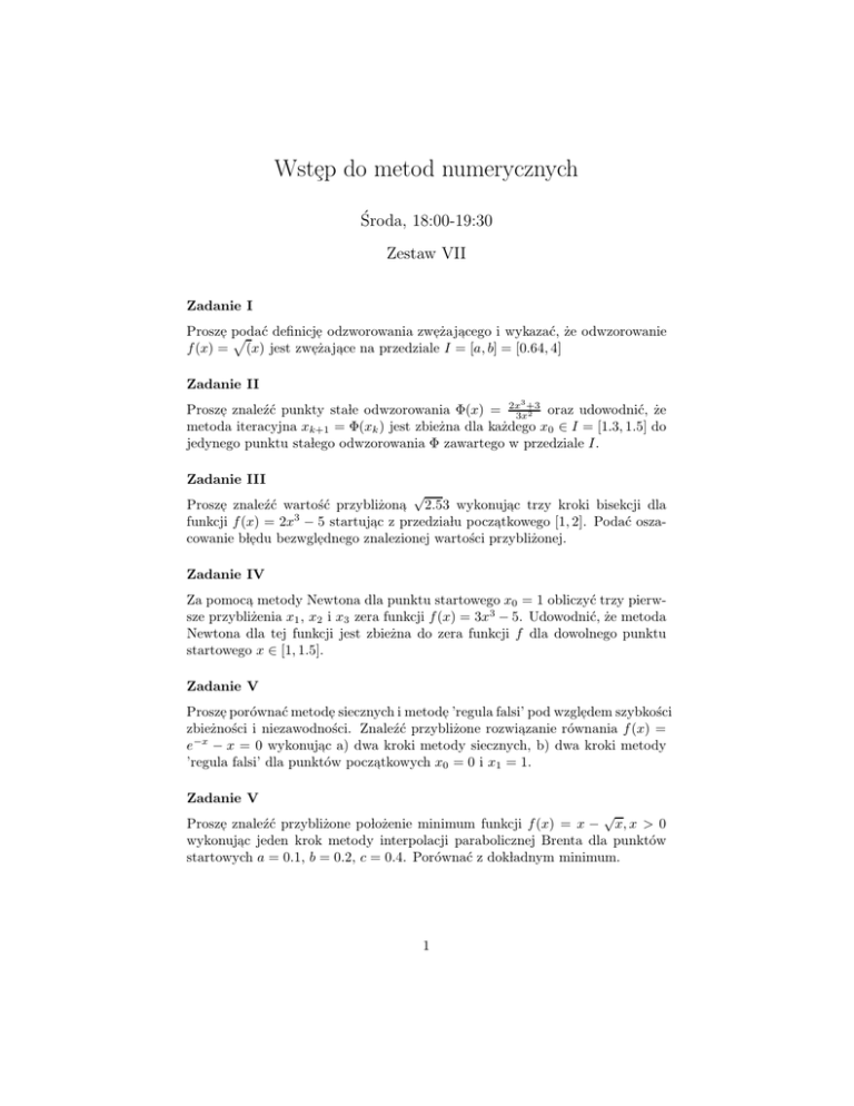 Wstȩp do metod numerycznych Środa, 18:00-19:30 Zestaw VII Zadanie I Prosze֒ podać definicje֒ odzworowania zweżaj acego i wykazać, że odwzorowanie ֒ ֒ p f (x) = (x) jest zweżaj ace na przedziale I = [a, b] = [0.64, 4] ֒ ֒ Zadanie II 3 Prosze֒ znaleźć punkty stale odwzorowania Φ(x) = 2x3x+3 oraz udowodnić, że 2 metoda iteracyjna xk+1 = Φ(xk ) jest zbieżna dla każdego x0 ∈ I = [1.3, 1.5] do jedynego punktu stalego odwzorowania Φ zawartego w przedziale I. Zadanie III √ Prosze֒ znaleźć wartość przybliżona֒ 2.53 wykonujac ֒ trzy kroki bisekcji dla funkcji f (x) = 2x3 − 5 startujac z przedzia lu pocz atkowego [1, 2]. Podać osza֒ ֒ cowanie bledu bezwgl ednego znalezionej wartości przybliżonej. ֒ ֒ Zadanie IV Za pomoca֒ metody Newtona dla punktu startowego x0 = 1 obliczyć trzy pierwsze przybliżenia x1 , x2 i x3 zera funkcji f (x) = 3x3 − 5. Udowodnić, że metoda Newtona dla tej funkcji jest zbieżna do zera funkcji f dla dowolnego punktu startowego x ∈ [1, 1.5]. Zadanie V Prosze֒ porównać metode֒ siecznych i metode֒ ’regula falsi’ pod wzgledem szybkości ֒ zbieżności i niezawodności. Znaleźć przybliżone rozwiazanie równania f (x) = ֒ e−x − x = 0 wykonujac a) dwa kroki metody siecznych, b) dwa kroki metody ֒ ’regula falsi’ dla punktów poczatkowych x0 = 0 i x1 = 1. ֒ Zadanie V √ Prosze֒ znaleźć przybliżone polożenie minimum funkcji f (x) = x − x, x > 0 wykonujac ֒ jeden krok metody interpolacji parabolicznej Brenta dla punktów startowych a = 0.1, b = 0.2, c = 0.4. Porównać z dokladnym minimum. 1