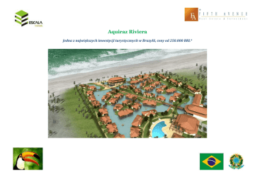Aquiraz Riviera Jedna z największych inwestycji turystycznych w Brazylii, ceny od 250.000 BRL* Lokalizacja Aquiraz Riviera to wysokiej klasy miasteczko turystyczne zlokalizowane na plaży Marambaia w Aquiraz, ok. 35km na południowy wschód od Fortalezy, ok. 25 km od lotniska Pinto Martins. To region o największym potencjale turystycznym w tej części Brazylii. Opis miasteczka Projekt Aquiraz Riviera został opracowany przez konsorcjum portugalskobrazylijskie Aquiraz Investimentos SA i obejmuje on m.in.: 5* hotele, klub osiedlowy, klub plażowy, klub golfowy, pole golfowe, baseny, korty tenisowe, boisko do piłki nożnej, sauna, masaże, centrum konferencyjne oraz inne. Łączna powierzchnia projektu wynosi 285 ha. Odległość od morza wynosi 1,8 km. Aquiraz Riviera sprzedaje działki wokół pola golfowego i klient, który kupi tam ziemię, może postawić swój dom według własnego projektu. Można również skorzystać z usług dewelopera, który oferuje gotowe projekty wysokiej jakości domów . Oferowane są 4 różne modele domów: 231, 247, 248 and 286 m2.Ceny działek od 250.000BRL za 1000m. Luksusowe wakacyjne domy w Aquiraz Riviera Typ 1 – 231m2 Parter: Duży taras Salon Jadalnia Biuro z małą łazienką Kuchnia Pokój dla służby z osobnym wejściem 1 piętro: Sypialnia master Dwie mniejsze sypialnie Prawie 30m2 taras Opcjonalnie: Basen Sauna Jacuzzi Ceny (działka + dom) od 780.000 BRL*. Płatność może być rozłożona na 60 miesięcy. Typ 2 – 247m2 Parter: Duży taras Salon Jadalnia Biuro z małą łazienką Kuchnia Pokój dla służby z osobnym wejściem 1 piętro: Sypialnia master z zabudowaną szafą Dwie mniejsze sypialnie Taras Opcjonalnie: Basen Sauna Jacuzzi Ceny ( działka + dom) od 750.000 BRL*. Płatność może być rozłożona na 60 miesięcy. Typ 3- 248m2 Ceny od 750.000 BRL* Typ 4- 286m2 Ceny od 950.000 BRL* *do ceny należy doliczyć ok. 8% kosztów związanych z zakupem Kontakt i dodatkowe informacje: Marek Gąsiewski tel. 22 8286363 kom.501261523 www.fifthavenue.pl e-mail: [email protected]