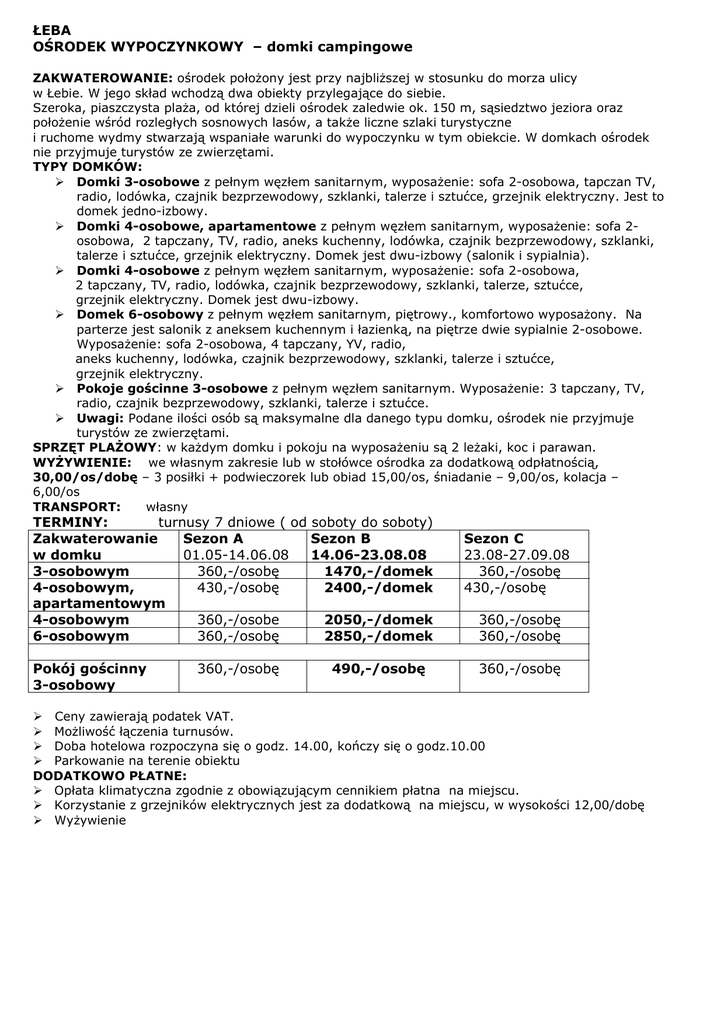 ŁEBA OŚRODEK WYPOCZYNKOWY – domki campingowe ZAKWATEROWANIE: ośrodek położony jest przy najbliższej w stosunku do morza ulicy w Łebie. W jego skład wchodzą dwa obiekty przylegające do siebie. Szeroka, piaszczysta plaża, od której dzieli ośrodek zaledwie ok. 150 m, sąsiedztwo jeziora oraz położenie wśród rozległych sosnowych lasów, a także liczne szlaki turystyczne i ruchome wydmy stwarzają wspaniałe warunki do wypoczynku w tym obiekcie. W domkach ośrodek nie przyjmuje turystów ze zwierzętami. TYPY DOMKÓW: Domki 3-osobowe z pełnym węzłem sanitarnym, wyposażenie: sofa 2-osobowa, tapczan TV, radio, lodówka, czajnik bezprzewodowy, szklanki, talerze i sztućce, grzejnik elektryczny. Jest to domek jedno-izbowy. Domki 4-osobowe, apartamentowe z pełnym węzłem sanitarnym, wyposażenie: sofa 2osobowa, 2 tapczany, TV, radio, aneks kuchenny, lodówka, czajnik bezprzewodowy, szklanki, talerze i sztućce, grzejnik elektryczny. Domek jest dwu-izbowy (salonik i sypialnia). Domki 4-osobowe z pełnym węzłem sanitarnym, wyposażenie: sofa 2-osobowa, 2 tapczany, TV, radio, lodówka, czajnik bezprzewodowy, szklanki, talerze, sztućce, grzejnik elektryczny. Domek jest dwu-izbowy. Domek 6-osobowy z pełnym węzłem sanitarnym, piętrowy., komfortowo wyposażony. Na parterze jest salonik z aneksem kuchennym i łazienką, na piętrze dwie sypialnie 2-osobowe. Wyposażenie: sofa 2-osobowa, 4 tapczany, YV, radio, aneks kuchenny, lodówka, czajnik bezprzewodowy, szklanki, talerze i sztućce, grzejnik elektryczny. Pokoje gościnne 3-osobowe z pełnym węzłem sanitarnym. Wyposażenie: 3 tapczany, TV, radio, czajnik bezprzewodowy, szklanki, talerze i sztućce. Uwagi: Podane ilości osób są maksymalne dla danego typu domku, ośrodek nie przyjmuje turystów ze zwierzętami. SPRZĘT PLAŻOWY: w każdym domku i pokoju na wyposażeniu są 2 leżaki, koc i parawan. WYŻYWIENIE: we własnym zakresie lub w stołówce ośrodka za dodatkową odpłatnością, 30,00/os/dobę – 3 posiłki + podwieczorek lub obiad 15,00/os, śniadanie – 9,00/os, kolacja – 6,00/os TRANSPORT: własny TERMINY: turnusy 7 dniowe ( od soboty do soboty) Zakwaterowanie Sezon A Sezon B w domku 01.05-14.06.08 14.06-23.08.08 3-osobowym 360,-/osobę 1470,-/domek 4-osobowym, 430,-/osobę 2400,-/domek apartamentowym 4-osobowym 360,-/osobe 2050,-/domek 6-osobowym 360,-/osobę 2850,-/domek Pokój gościnny 3-osobowy 360,-/osobę 490,-/osobę Sezon C 23.08-27.09.08 360,-/osobę 430,-/osobę 360,-/osobę 360,-/osobę 360,-/osobę Ceny zawierają podatek VAT. Możliwość łączenia turnusów. Doba hotelowa rozpoczyna się o godz. 14.00, kończy się o godz.10.00 Parkowanie na terenie obiektu DODATKOWO PŁATNE: Opłata klimatyczna zgodnie z obowiązującym cennikiem płatna na miejscu. Korzystanie z grzejników elektrycznych jest za dodatkową na miejscu, w wysokości 12,00/dobę Wyżywienie