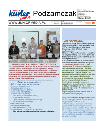 Podzamczak WWW.JUNIORMEDIA.PL ORGANIZATOR PROJEKTU JUŻ PO FERIACH... ale jeszcze przed feriami działo się wiele. Kolejny raz mieliśmy okazję oglądać teatr TVP on-line. Tym razem tekst Jana Brzechwy o Lisie Witalisie i jego szelmostwach. Byliśmy w Teatrze Kameralnym w Lublinie na adaptacji lektury "Ten obcy". Sami też tworzyliśmy teatr: szkolne Jasełka (o tym wewnątrz). A w Filharmonii Lubelskiej podziwialiśmy bożonarodzeniowe widowisko muzyczne. GDYBY MIKOŁAJ UMIAŁ GRAĆ W TENISA... ..to zagrałby razem z klasami 4-6 w dorocznym Mikołajkowym Turnieju Tenisa Stołowego o Puchar Dyrektora Szkoły. Rywalizowano w dwóch kategoriach dziewcząt i chłopców. Zawody zorganizowane przez nauczyciela wf rozgrywane były sposobem pucharowym i dużo zależało od szczęśliwego losowania. Na zdjęciu najlepsi zawodnicy: Łukasz, Karol, Bartek, Kinga, Paulina i Natalia. ............................................................................................. Zimą, ku przestrodze… Gdy w zimie ubrać się nie chcemy, To pewne, że zachorujemy. Chociaż gorączkę mamy, na zabawę chęć posiadamy, I choć wyjść nie możemy, to o tym wciąż marzymy. Inne dzieci na dworze się bawią, w ogóle trosk nie mają. Lepią bałwana, śnieżkami się rzucają, Na buziach uśmiech mają. Śnieg pada i pada, Dla dzieci to wielka frajda. A z tego wiersza taki morał: Szczęśliwy ten, kto w zimie nie chorował. Taki wiersz na pożegnanie zimy napisała Kinga Sz. Zwycięzcy: Łukasz, Karol, Bartek, Kinga, Paulina, Natalia Numer 9 02/14 PARTNER JUŻ PO FERIACH... . . Szkoła Podstawowa im.Henryka Sienkiewicza w Podzamczu Podzamcze 22 21-007, Podzamcze . ale jeszcze przed feriami działo się wiele. Kolejny raz mieliśmy okazję oglądać teatr TVP on-line. Tym razem tekst Jana Brzechwy o Lisie Witalisie i jego szelmostwach. Byliśmy w Teatrze Kameralnym w Lublinie na adaptacji lektury "Ten obcy". Sami też tworzyliśmy teatr: szkolne Jasełka (o tym wewnątrz numeru). A w Filharmonii Lubelskiej podziwialiśmy bożonarodzeniowe widowisko muzyczne: "Cichuteńko pośród nocy", które dostarczyło uczniom naszej szkoły niezapomnianych wrażeń i doznań artystycznych. Widowisko w wykonaniu Zespołu Pieśni i Tańca "Lublin" im. Wandy Kaniorowej to więcej niż zwykły koncert noworoczny. Znakomicie wykonane wokalne przeplatane Zimą, partie ku przestrodze były występami kolędników w Gdy w zimie ubrać się nie chcemy, tradycyjnym składzie, tancerzy i To pewne, że zachorujemy. uzupełnione inscenizacjami związanymi z Bożym Narodzeniem. Na scenie pojawiło się około 100 wykonawców w przepięknych Chociaż gorączkę regionalnych strojach. mamy, Warto było to na zabawęzobaczyć! wszystko chęć posiadamy, (I.D) I choć wyjść nie możemy, to o tym wciąż marzymy. Akcja Gwiazdkowej Niespodzianki stała Innejuż dzieci na dworze sięszkole. bawią, Po raz się tradycją w naszej w ogólepaczki trosk nie mają. przez kolejny zrobione wolontariuszy z krajów zza zachodniej granicy trafiły do rąk naszych uczniów sprawiając im wiele radości. odbywa Lepią bałwana, śnieżkami sięAkcja rzucają, się okresie świąteczno-noworocznym, Na w buziach uśmiech mają. Śnieg ma napada celu propagowanie i pada, dobrych postaw Dla dzieci to wielka frajda. chrześcijańskich jakim jest m.in dzielenie A z ztego wiersza się innymi. (I.D)taki morał: Szczęśliwy ten, kto w zimie nie chorował. (Kinga Szczęśniak) Kurier Lubelski | Numer 9 02/2014 | Strona 2 www.kurierlubelski.pl Podzamczak WWW.JUNIORMEDIA.PL Jasełka SZKOLNA WIGILIA W tym roku Jasełka miały charakter współczesny i metaforyczny. Przy żłóbku Pana Jezusa najważniejsze przesłanie tego biblijnego Mały Książę . zdarzenia rozważali uczniowie wraz z bohaterem literackim Małym Księciem, który przybył do nas w poszukiwaniu przyjaciela. Mamy przygotowały tradycyjne potrawy . Przy stole wigilijnym spotkaliśmy się wraz z naszymi nauczycielami i rodzicami.Wspólna modlitwa, łamanie opłatkiem i tradycyjnie z serca płynące życzenia, a następnie Jasełka i degustacja potraw świątecznych - wypełniły program tego szczególnego dnia.Co roku dokładamy starań, by był on wyjątkowy i nieszablonowy. W przedstawienie zaangażowani byli wszyscy uczniowie klas IV, V i VI. Widowisko przeplatane kolędami wprowadziło i gości i aktorów w świąteczny nastrój. Rodzinną atmosferę dopełniał przygotowany przez nasze mamy poczęstunek złożony z tradycyjnych potraw, które były pyszne. W miłym nastroju rozeszliśmy się do naszych domów, by powrócić do szkolnych zajęć dopiero w Nowym Roku 2014. (M.K) Z kolędą przychodzimy... . Pastuszkowie i Królowie . Konferencja diabłów . Maria i Józef . www.kurierlubelski.pl Kurier Lubelski | Numer 9 02/2014 | Strona 3 Podzamczak WWW.JUNIORMEDIA.PL Królowa i Król balu: Zuzia i Krzyś . Księżniczki, wróżki, damu dworu... . W kalendarzu szkolnym jest co roku dzień, na który czekamy z utęsknieniem, to czas ZABAWY CHOINKOWEJ. Przy dźwiękach muzyki, granej przez zespół Massimo, spędziliśmy kilka wesołych godzin. Konkursy i zabawy adresowane i do młodszych i do starszych uczestników sprawiły, że wszyscy bez względu na wiek bawiliśmy się świetnie. A kogo tam nie było... W dużej liczbie piękne księżniczki i czarownice, sportowcy, kowboje, a nawet strażak. Wybraliśmy też Miss i Mistera zabawy. Tańczono w różnych rytmach, stylach i z różnymi partnerami. O gastronomiczną część imprezy zadbali rodzice. A było tyle wspaniałości, że nikt na pewno nie był głodny. (U.G) Bajeczne stroje wypełniły salę balową . Kurier Lubelski | Numer 9 02/2014 | Strona 4 www.kurierlubelski.pl Podzamczak WWW.JUNIORMEDIA.PL A karnawał trwa... czyli jak się bawiono na szkolnej zabawie choinkowej... Zgodnie z tradycją pojawił się też Mikołaj, który obdarował uczestników zabawy - tym razem - owocami i orzechami. Mikołaj rozdaje owoce i orzec