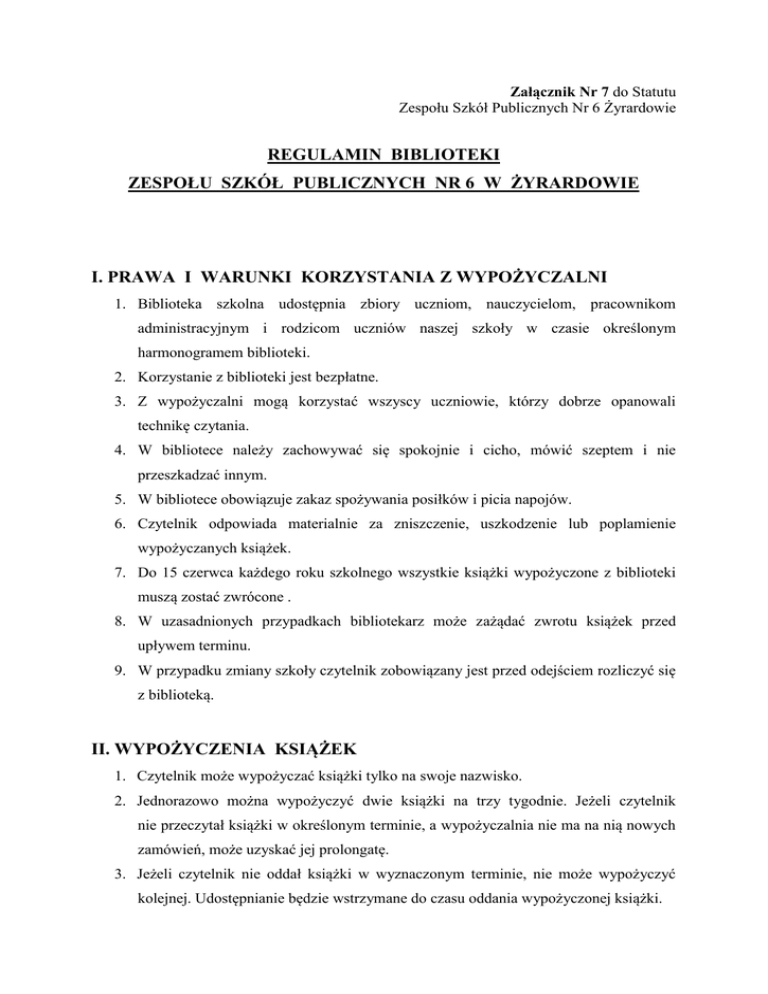 Załącznik Nr 7 do Statutu Zespołu Szkół Publicznych Nr 6 Żyrardowie REGULAMIN BIBLIOTEKI ZESPOŁU SZKÓŁ PUBLICZNYCH NR 6 W ŻYRARDOWIE I. PRAWA I WARUNKI KORZYSTANIA Z WYPOŻYCZALNI 1. Biblioteka szkolna udostępnia zbiory uczniom, nauczycielom, pracownikom administracyjnym i rodzicom uczniów naszej szkoły w czasie określonym harmonogramem biblioteki. 2. Korzystanie z biblioteki jest bezpłatne. 3. Z wypożyczalni mogą korzystać wszyscy uczniowie, którzy dobrze opanowali technikę czytania. 4. W bibliotece należy zachowywać się spokojnie i cicho, mówić szeptem i nie przeszkadzać innym. 5. W bibliotece obowiązuje zakaz spożywania posiłków i picia napojów. 6. Czytelnik odpowiada materialnie za zniszczenie, uszkodzenie lub poplamienie wypożyczanych książek. 7. Do 15 czerwca każdego roku szkolnego wszystkie książki wypożyczone z biblioteki muszą zostać zwrócone . 8. W uzasadnionych przypadkach bibliotekarz może zażądać zwrotu książek przed upływem terminu. 9. W przypadku zmiany szkoły czytelnik zobowiązany jest przed odejściem rozliczyć się z biblioteką. II. WYPOŻYCZENIA KSIĄŻEK 1. Czytelnik może wypożyczać książki tylko na swoje nazwisko. 2. Jednorazowo można wypożyczyć dwie książki na trzy tygodnie. Jeżeli czytelnik nie przeczytał książki w określonym terminie, a wypożyczalnia nie ma na nią nowych zamówień, może uzyskać jej prolongatę. 3. Jeżeli czytelnik nie oddał książki w wyznaczonym terminie, nie może wypożyczyć kolejnej. Udostępnianie będzie wstrzymane do czasu oddania wypożyczonej książki. 4. Uczeń, u którego w domu panuje choroba zakaźna, nie może korzystać z biblioteki. 5. Książki wypożyczonej na swoje nazwisko nie można przekazywać osobom trzecim. III. POSZANOWANIE KSIĄŻEK 1. Czytelnik szanuje i dba o wypożyczone książki. 2. Czytelnik zobowiązany jest odkupić zagubioną lub zniszczoną książkę. Jeśli odkupienie jest niemożliwe powinien oddać inną, wskazaną przez bibliotekarza. REGULAMIN SZKOLNEGO CENTRUM MULTIMEDIALNEGO W ZESPOLE SZKÓŁ PUBLICZNYCH NR 6 W ŻYRARDOWIE I. PRAWO KORZYSTANIA Z SCM 1. Ze szkolnego centrum multimedialnego ( SCM ) zwanego dalej czytelnią, mogą korzystać wszyscy uczniowie ZSP Nr 6, nauczyciele i pracownicy administracyjni oraz rodzice uczniów, w godzinach pracy biblioteki. 2. W czytelni można czytać książki i czasopisma, odrabiać lekcje, pisać referaty i korzystać z pomocy nauczyciela bibliotekarza, a także oglądać filmy na DVD i pracować przy komputerze. 3. Do czytelni należy wchodzić spokojnie, z czystymi rękami, bez jedzenia i picia. Wierzchnie ubranie należy pozostawić w szatni, zmienić obuwie a teczki i torby położyć w wyznaczonym miejscu. 4. W czytelni obowiązuje cisza i zasady kulturalnego zachowania. Uczeń, który źle się zachowuje zostanie wyproszony i może zostać ukarany czasowym zakazem wstępu do czytelni. 5. Korzystający z czytelni obowiązany jest każdorazowo wpisać się do rejestru. II. KORZYSTANIE ZE ZBIORÓW 1. W czytelni można korzystać ze wszystkich zbiorów, to jest z księgozbioru podręcznego, czasopism i zbiorów audiowizualnych. Ze zbiorów tych można korzystać tylko na miejscu. Nie można wynosić ich na zewnątrz. Wyjątek stanowią wypożyczenia przez nauczycieli na lekcje. 2. Czytelnik ma dostęp do wszystkich książek i czasopism znajdujących się na regałach. Do innych zbiorów czytelnik ma dostęp za pośrednictwem nauczyciela bibliotekarza. 3. Czasopisma odnosi się na właściwe miejsce. 4. Przed opuszczeniem czytelni należy zwrócić czytane książki nauczycielowi bibliotekarzowi. 5. Nauczyciel, który chce z uczniami obejrzeć film, powinien wcześniej upewnić się czy w tym czasie czytelnia nie będzie zajęta przez innych użytkowników. III. POSZANOWANIE ZBIORÓW 1. Zbiory czytelni poleca się opiece użytkowników. 2. Za zniszczenia dokonane przez ucznia w czytelni (uszkodzenie komputera, zniszczenie książki lub czasopisma itp.) odpowiadają materialnie rodzice ucznia. 3. Za książki z księgozbioru podręcznego i inne materiały (np. płyty DVD, kasety video czy czasopisma) wypożyczone przez nauczyciela do pracowni na cały rok lub lekcje bieżące odpowiada nauczyciel wypożyczający wyżej wymienione materiały. 4. Zbiory czytelni stanowią własność społeczną, którą powierza się czytelnikom. REGULAMIN KORZYSTANIA Z KOMPUTERÓW W SZKOLNYM CENTRUM MULTIMEDIALNYM 1. Z komputera mogą nieodpłatnie korzystać wszyscy uczniowie i pracownicy szkoły w godzinach pracy biblioteki szkolnej. 2. Komputer w bibliotece służy przede wszystkim do wyszukiwania informacji w sieci Internet oraz przeglądania programów edukacyjnych dostępnych w czytelni. 3. Praca przy komputerze możliwa jest po otrzymaniu zgody dyżurującego bibliotekarza. 4. Przed rozpoczęciem pracy należy wpisać się do zeszytu czytelni. 5. Jednorazowo można korzystać z komputera do 1 godziny. 6. Istnieje możliwość rezerwacji komputera na następny dzień (1godzina). 7. Uczeń może korzystać na miejscu z encyklopedii multimedialnych, słowników i innych baz danych zakupionych przez bibliotekę. 8. NIE WOLNO!!! Zmieniać ustawień w komputerze, wgrywać własnych programów, kasować zainstalowanych. 9. NIE WOLNO!!! Wykonywać żadnych połączeń technicznych bez zgody bibliotekarza (np. włączać i rozłączać kabli zasilających). 10. Zabrania się wkładania własnych dyskietek do stacji dysków. 11. Za naruszenie regulaminu będą nakładane kary (np. zakaz korzystania z komputera przez wyznaczony czas). 12. Za szkody wyrządzone przez ucznia odpowiadają rodzice.