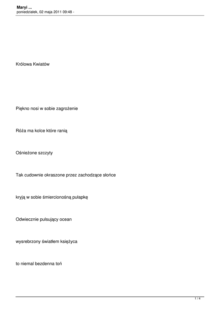 Maryi ... poniedziałek, 02 maja 2011 09:48 - Królowa Kwiatów Piękno nosi w sobie zagrożenie Róża ma kolce które ranią Ośnieżone szczyty Tak cudownie okraszone przez zachodzące słońce kryją w sobie śmiercionośną pułapkę Odwiecznie pulsujący ocean wysrebrzony światłem księżyca to niemal bezdenna toń 1/4 Maryi ... poniedziałek, 02 maja 2011 09:48 - pochłaniająca wszystko na wieki Tylko jedyna róża nie rani kolcem jedyna biel która nie ścina mrozem jedyny bezmiar co nie pozbawia życia Rosa Mystica Najpiękniejsza z Róż Jakie Bóg zasadził w ziemskim Edenie Nieskażona Biel Czystość Najczystsza Gorejąca z Miłości Bezmiar Pokory i Łagodności Najcudowniejsza Konwalia 2/4 Maryi ... poniedziałek, 02 maja 2011 09:48 - Najwonniejszy Fiołek Najpiękniejsza Lilia Najpokorniejsza Stokrotka Kwiat Kwiatów Maryja Królowo Kwiatów Najcudowniejszy z Kwiatów Jakie stworzył Bóg Módl się za nami - Propecia milwaukee Online viagra and cialis Viagra tablet for women Uk viagra lawsuits Viagra used for Levitra other uses Viagra 25mg use 3/4 Maryi ... poniedziałek, 02 maja 2011 09:48 - - How to buy cialis in mexico Cialis lilly for sale Propecia discount coupon Order viagra online canada Viagra 100mg uk Viagra what does pill look like Cialis 10mg uk 4/4