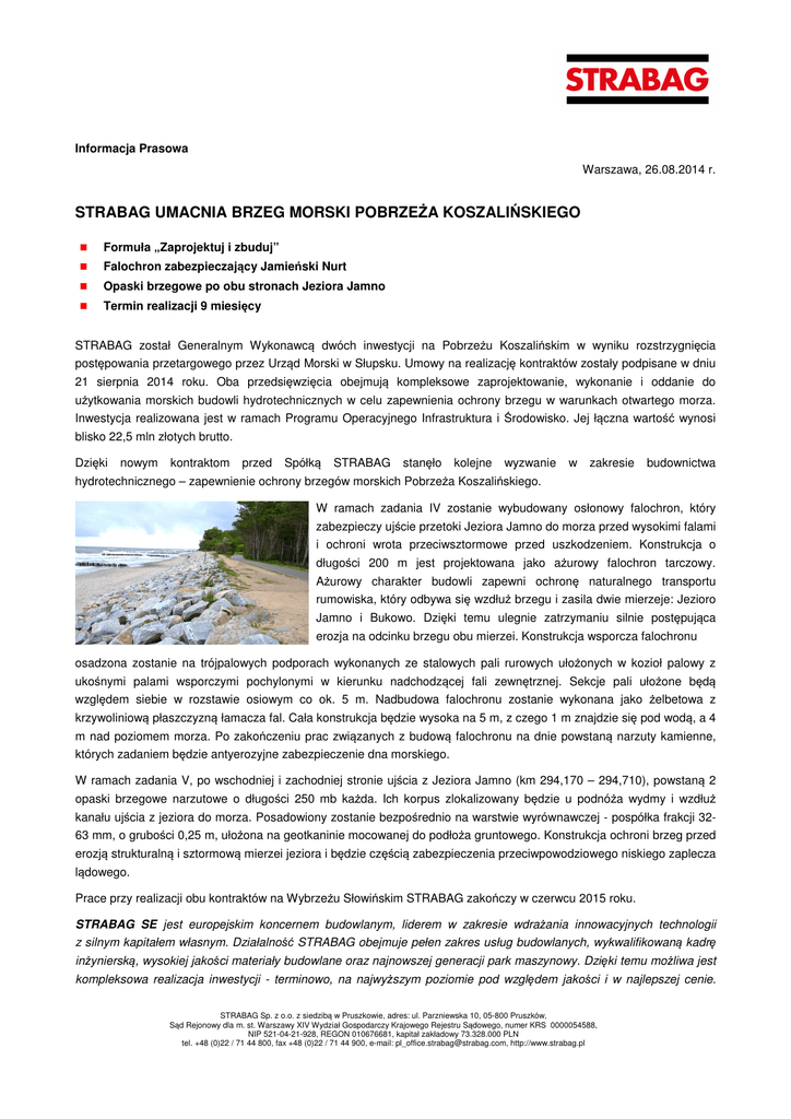Informacja Prasowa Warszawa, 26.08.2014 r. STRABAG UMACNIA BRZEG MORSKI POBRZEŻA KOSZALIŃSKIEGO Formuła „Zaprojektuj i zbuduj” Falochron zabezpieczający Jamieński Nurt Opaski brzegowe po obu stronach Jeziora Jamno Termin realizacji 9 miesięcy STRABAG został Generalnym Wykonawcą dwóch inwestycji na Pobrzeżu Koszalińskim w wyniku rozstrzygnięcia postępowania przetargowego przez Urząd Morski w Słupsku. Umowy na realizację kontraktów zostały podpisane w dniu 21 sierpnia 2014 roku. Oba przedsięwzięcia obejmują kompleksowe zaprojektowanie, wykonanie i oddanie do użytkowania morskich budowli hydrotechnicznych w celu zapewnienia ochrony brzegu w warunkach otwartego morza. Inwestycja realizowana jest w ramach Programu Operacyjnego Infrastruktura i Środowisko. Jej łączna wartość wynosi blisko 22,5 mln złotych brutto. Dzięki nowym kontraktom przed Spółką STRABAG stanęło kolejne wyzwanie w zakresie budownictwa hydrotechnicznego – zapewnienie ochrony brzegów morskich Pobrzeża Koszalińskiego. W ramach zadania IV zostanie wybudowany osłonowy falochron, który zabezpieczy ujście przetoki Jeziora Jamno do morza przed wysokimi falami i ochroni wrota przeciwsztormowe przed uszkodzeniem. Konstrukcja o długości 200 m jest projektowana jako ażurowy falochron tarczowy. Ażurowy charakter budowli zapewni ochronę naturalnego transportu rumowiska, który odbywa się wzdłuż brzegu i zasila dwie mierzeje: Jezioro Jamno i Bukowo. Dzięki temu ulegnie zatrzymaniu silnie postępująca erozja na odcinku brzegu obu mierzei. Konstrukcja wsporcza falochronu osadzona zostanie na trójpalowych podporach wykonanych ze stalowych pali rurowych ułożonych w kozioł palowy z ukośnymi palami wsporczymi pochylonymi w kierunku nadchodzącej fali zewnętrznej. Sekcje pali ułożone będą względem siebie w rozstawie osiowym co ok. 5 m. Nadbudowa falochronu zostanie wykonana jako żelbetowa z krzywoliniową płaszczyzną łamacza fal. Cała konstrukcja będzie wysoka na 5 m, z czego 1 m znajdzie się pod wodą, a 4 m nad poziomem morza. Po zakończeniu prac związanych z budową falochronu na dnie powstaną narzuty kamienne, których zadaniem będzie antyerozyjne zabezpieczenie dna morskiego. W ramach zadania V, po wschodniej i zachodniej stronie ujścia z Jeziora Jamno (km 294,170 – 294,710), powstaną 2 opaski brzegowe narzutowe o długości 250 mb każda. Ich korpus zlokalizowany będzie u podnóża wydmy i wzdłuż kanału ujścia z jeziora do morza. Posadowiony zostanie bezpośrednio na warstwie wyrównawczej - pospółka frakcji 3263 mm, o grubości 0,25 m, ułożona na geotkaninie mocowanej do podłoża gruntowego. Konstrukcja ochroni brzeg przed erozją strukturalną i sztormową mierzei jeziora i będzie częścią zabezpieczenia przeciwpowodziowego niskiego zaplecza lądowego. Prace przy realizacji obu kontraktów na Wybrzeżu Słowińskim STRABAG zakończy w czerwcu 2015 roku. STRABAG SE jest europejskim koncernem budowlanym, liderem w zakresie wdrażania innowacyjnych technologii z silnym kapitałem własnym. Działalność STRABAG obejmuje pełen zakres usług budowlanych, wykwalifikowaną kadrę inżynierską, wysokiej jakości materiały budowlane oraz najnowszej generacji park maszynowy. Dzięki temu możliwa jest kompleksowa realizacja inwestycji - terminowo, na najwyższym poziomie pod względem jakości i w najlepszej cenie. STRABAG Sp. z o.o. z siedzibą w Pruszkowie, adres: ul. Parzniewska 10, 05-800 Pruszków, Sąd Rejonowy dla m. st. Warszawy XIV Wydział Gospodarczy Krajowego Rejestru Sądowego, numer KRS 0000054588, NIP 521-04-21-928, REGON 010676681, kapitał zakładowy 73.328.000 PLN tel. +48 (0)22 / 71 44 800, fax +48 (0)22 / 71 44 900, e-mail: [email protected], http://www.strabag.pl 2 STRABAG korzysta z całej gamy usług oferowanych przez wyspecjalizowane spółki koncernowe, które przejmują odpowiedzialność za ich wykonanie, generując w ten sposób wartość dodaną dla swoich Klientów. W 2013 roku przy zatrudnieniu 73 tys. pracowników STRABAG SE osiągnął obroty w wysokości około 14 mld Euro. Koncern rozszerza swoją działalność daleko wykraczającą poza granice Austrii i Niemiec. Za pośrednictwem sieci należących do niego spółek jest obecny w wielu krajach europejskich i coraz częściej reprezentowany na innych kontynentach. Grupa STRABAG jest obecna w Polsce od 1985 roku. Przy zatrudnieniu ok. 5 300 pracowników, roczne obroty Grupy w 2013 wyniosły blisko 800 mln Euro. Więcej informacji jest dostępnych na www.strabag.pl Kontakt STRABAG Sp. z o.o. Ewa Bałdyga Rzecznik Prasowy Tel: +48 22 244 57 05 [email protected] STRABAG Sp. z o.o. z siedzibą w Pruszkowie, adres: ul. Parzniewska 10, 05-800 Pruszków, Sąd Rejonowy dla m. st. Warszawy XIV Wydział Gospodarczy Krajowego Rejestru Sądowego, numer KRS 0000054588, NIP 521-04-21-928, REGON 010676681, kapitał zakładowy 73.328.000 PLN tel. +48 (0)22 / 71 44 800, fax +48 (0)22 / 71 44 900, e-mail: [email protected], http://www.strabag.pl