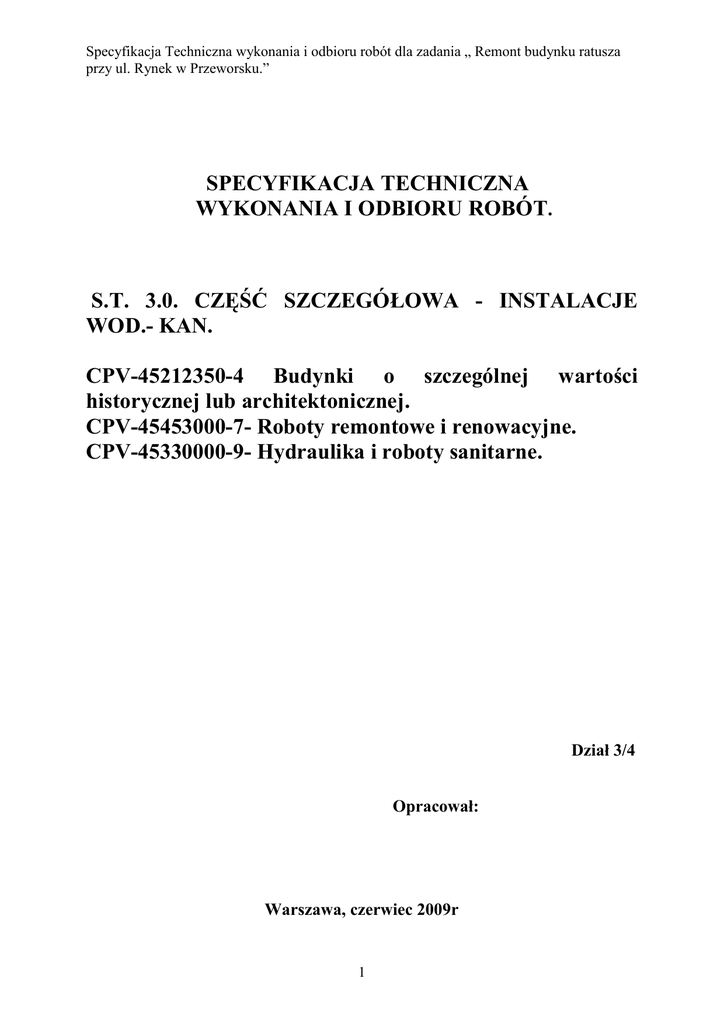 Specyfikacja Techniczna wykonania i odbioru robót dla zadania „ Remont budynku ratusza przy ul. Rynek w Przeworsku.” SPECYFIKACJA TECHNICZNA WYKONANIA I ODBIORU ROBÓT. S.T. 3.0. CZĘŚĆ SZCZEGÓŁOWA - INSTALACJE WOD.- KAN. CPV-45212350-4 Budynki o szczególnej wartości historycznej lub architektonicznej. CPV-45453000-7- Roboty remontowe i renowacyjne. CPV-45330000-9- Hydraulika i roboty sanitarne. Dział 3/4 Opracował: Warszawa, czerwiec 2009r 1 Specyfikacja Techniczna wykonania i odbioru robót dla zadania „ Remont budynku ratusza przy ul. Rynek w Przeworsku.” S.T.3.0. Specyfikacja Techniczna wykonania i odbioru robót- instalacja wod. - kan. S.T.3.1. Specyfikacja Techniczna wykonania i odbioru robót- wewnętrzna instalacja: wody zimnej i hydrantowej. CPV 45330000-9- Hydraulika i roboty sanitarne. CPV 45332200-5- Hydraulika. CPV 45332400-7- Roboty instalacyjne w zakresie sprzętu sanitarnego. S.T.3.2. Specyfikacja Techniczna wykonania i odbioru robót- przyłączy wodociągowych, kanalizacji deszczowej oraz przebudowa odcinka sieci kanalizacji ogólnospławnej. CPV-45330000-9- Hydraulika i roboty sanitarne. CPV 45231300-8- Roboty budowlane w zakresie budowy wodociągów i rurociągów do odprowadzania ścieków. 2 Specyfikacja Techniczna wykonania i odbioru robót dla zadania „ Remont budynku ratusza przy ul. Rynek w Przeworsku.” ST.3.1. SPECYFIKACJA TECHNICZNA WYKONANIA I ODBIORU ROBÓT -WEWNĘTRZNE INSTALACJE: WODY ZIMNEJ I HYDRANTOWEJ , KANALIZACJI SANITARNEJ. 1. WSTĘP. 1.1. Przedmiot Specyfikacji Technicznej (ST) Przedmiotem Specyfikacji Technicznej (ST) są wymagania dotyczące wykonania i odbioru robót na zadaniu „Remont budynku ratusza przy ul. Rynek w Przeworsku”. 1.2. Zakres Specyfikacji Technicznej (ST) Specyfikacje Techniczne (ST) mają zastosowanie jako element dokumentów przetargowych przy zleceniu i realizacji robót wymienionych w pkt. 1.3.. 1.3. Określenia podstawowe Określenia podstawowe zgodne z Warunkami COBRTI Instal: Warunki techniczne wykonania i odbioru instalacji wodociągowych. Zeszyt 7. Warszawa 2003, Warunki techniczne wykonania i odbioru instalacji kanalizacyjnych. Zeszyt 9. Warszawa 2006. 1.4. Zakres robót objętych ST Ustalenia zawarte w niniejszej ST dotyczą zasad prowadzenia robót związanych z wykonaniem instalacji zgodnie z zakresem dokumentacji projektowej i przystosowanie ich dla osób niepełnosprawnych. Wykonane instalacje winne spełniać podstawowe wymagania ustawowe dotyczące: a) bezpieczeństwa konstrukcji, b) bezpieczeństwa poŜarowego, c) bezpieczeństwa uŜytkowania, d) odpowiednich warunków higienicznych zdrowotnych oraz ochrony środowiska, e) ochrony przed hałasem i drganiami, f) oszczędności energii. W zakres opracowania wchodzą: - instalacja wody zimnej i hydrantowej; - przyłącza wodociągowe i kanalizacji deszczowej; - przebudowa odcinka sieci kanalizacji ogólnospławnej. 1.5. Instalacja wody zimnej. Instalacja powinna spełniać wymogi zawarte w „ Warunkach wykonania i odbioru robót budowlano - montaŜowych- tom II - Instalacje sanitarne i przemysłowe”. Wydawnictwo COBTI INSTAL. Obliczenia instalacji wodociągowej wykonano na podstawie normy PN-92/B-01706 „ Instalacje wodociągowe .Wymagania w projektowaniu.” 3 Specyfikacja Techniczna wykonania i odbioru robót dla zadania „ Remont budynku ratusza przy ul. Rynek w Przeworsku.” Punkt pomiarowy wody (wodomierz, zawory odcinające, zawór zwrotny antyskaŜeniowy) projektuje się w piwnicy w przestrzeni technicznej, do której naleŜy zapewnić dostęp w celu konserwacji oraz odczytu wodomierza. Instalację naleŜy wykonać z rur stalowych ocynkowanych o średnicy DN25, DN32, DN40, DN50 w izolacji termicznej. Rury w pomieszczeniu piwnicy naleŜy prowadzić w warstwie izolacyjnej posadzki (tj. 20cm. styropianu). Pion wodociągowy w piwnicy zasilający pomieszczenia sanitarne i kuchenne naleŜy połączyć z istniejącą instalacją w przestrzeni technicznej. W obrębie łazienek naleŜy zdemontować w całości starą instalację i wykonać nową z rur polipropylenowych łączonych przez zgrzewanie. Instalację wykonać jako ukrytą, prowadzić rury nad stropem podwieszonym, wewnątrz ścianek z GK lub w bruzdach ściennych. Rurociągi naleŜy izolować otuliną z pianki polietylenowej w folii antyroszeniowej o gr. 13mm. KaŜda łazienka ma odcięcie od instalacji głównej zaworami kulowymi. Zawory naleŜy wykonać jako rozłączne i umoŜliwić dostęp do nich. 1.6. Instalacja hydrantowa. Po planowanej przebudowie budynek ratusza w całości zakwalifikowany będzie do kategorii zagroŜenia ludzi ZL III oraz do grupy budynków wielokondygnacyjnych średniowysokich. Cała powierzchnia budynku (tj. 1832 m2) będzie stanowiła jedną strefą poŜarową. W związku z powyŜszym projektuje się pion hydrantowy wraz z hydrantami wewnętrznymi HP25. Hydranty w szafce o wymiarach 700x650x250 mm z węŜem półsztywnym o długości 30m naleŜy zlokalizować na kaŜdej kondygnacji (tj. parterze, piętrze i poddaszu), tak aby zasięgiem obejmowały całą powierzchnię budynku. Zawór hydrantu naleŜy zamontować na wysokości 1,35m +/-0,1m od poziomu posadzki. Minimalną wydajność poboru wody z hydrantu HP25 wynosi 1,0 l/s, a ciśnienie na zaworze powinno wynosić 0,2 MPa. Instalacja hydrantowa musi zapewnić jednoczesność poboru w strefie poŜarowej z dwóch sąsiednich hydrantów. Instalację hydrantową projektuje się z rur stalowych ocynkowanych o średnicy DN50 i DN40 mm. Rury w pomieszczeniu piwnicy naleŜy prowadzić w warstwie izolacyjnej posadzki (tj. 20cm styropianu). Pion zasilający hydranty (DN50) na wyŜszych kondygnacjach naleŜy prowadzić w bruzdach ściennych w izolacji termicznej. W pomieszczeniach nieogrzewanych (tj na poddaszu) przewód sieci wodociągowej zasilający hydrant naleŜy zabezpieczenia przed moŜliwością zamarznięcia. W tym celu projektuje się instalację suchą wyposaŜoną w zawór elektromagnetyczny 