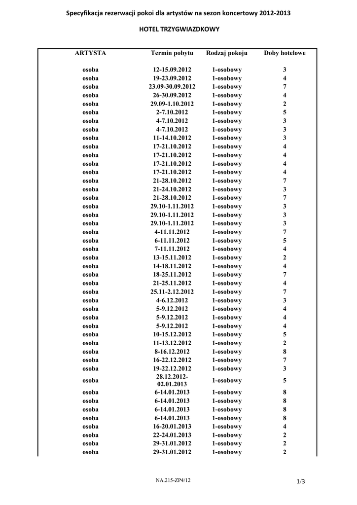 Specyfikacja rezerwacji pokoi dla artystów na sezon koncertowy 2012-2013 HOTEL TRZYGWIAZDKOWY ARTYSTA Termin pobytu Rodzaj pokoju Doby hotelowe osoba osoba osoba osoba osoba osoba osoba osoba osoba osoba osoba osoba osoba osoba osoba osoba osoba osoba osoba osoba osoba osoba osoba osoba osoba osoba osoba osoba osoba osoba osoba osoba osoba osoba osoba osoba 12-15.09.2012 19-23.09.2012 23.09-30.09.2012 26-30.09.2012 29.09-1.10.2012 2-7.10.2012 4-7.10.2012 4-7.10.2012 11-14.10.2012 17-21.10.2012 17-21.10.2012 17-21.10.2012 17-21.10.2012 21-28.10.2012 21-24.10.2012 21-28.10.2012 29.10-1.11.2012 29.10-1.11.2012 29.10-1.11.2012 4-11.11.2012 6-11.11.2012 7-11.11.2012 13-15.11.2012 14-18.11.2012 18-25.11.2012 21-25.11.2012 25.11-2.12.2012 4-6.12.2012 5-9.12.2012 5-9.12.2012 5-9.12.2012 10-15.12.2012 11-13.12.2012 8-16.12.2012 16-22.12.2012 19-22.12.2012 28.12.201202.01.2013 6-14.01.2013 6-14.01.2013 6-14.01.2013 6-14.01.2013 16-20.01.2013 22-24.01.2013 29-31.01.2012 29-31.01.2012 1-osobowy 1-osobowy 1-osobowy 1-osobowy 1-osobowy 1-osobowy 1-osobowy 1-osobowy 1-osobowy 1-osobowy 1-osobowy 1-osobowy 1-osobowy 1-osobowy 1-osobowy 1-osobowy 1-osobowy 1-osobowy 1-osobowy 1-osobowy 1-osobowy 1-osobowy 1-osobowy 1-osobowy 1-osobowy 1-osobowy 1-osobowy 1-osobowy 1-osobowy 1-osobowy 1-osobowy 1-osobowy 1-osobowy 1-osobowy 1-osobowy 1-osobowy 3 4 7 4 2 5 3 3 3 4 4 4 4 7 3 7 3 3 3 7 5 4 2 4 7 4 7 3 4 4 4 5 2 8 7 3 1-osobowy 5 1-osobowy 1-osobowy 1-osobowy 1-osobowy 1-osobowy 1-osobowy 1-osobowy 1-osobowy 8 8 8 8 4 2 2 2 osoba osoba osoba osoba osoba osoba osoba osoba osoba NA.215-ZP4/12 1/3 Specyfikacja rezerwacji pokoi dla artystów na sezon koncertowy 2012-2013 HOTEL TRZYGWIAZDKOWY osoba osoba osoba osoba osoba osoba osoba osoba osoba osoba osoba osoba osoba osoba osoba osoba osoba osoba osoba osoba osoba osoba osoba osoba osoba osoba osoba osoba osoba osoba osoba osoba osoba osoba osoba osoba osoba osoba osoba osoba osoba osoba osoba osoba osoba osoba osoba osoba 29-31.01.2012 27.01.-3.02.2013 30.01-3.02.2013 30.01-3.02.2013 30.01-3.02.2013 30.01-3.02.2013 3-10.02.2013 18-23.02.2013 26-28.02.2013 26-28.02.2013 26-28.02.2013 24.02-3.03.2013 27.02-3.03.2013 3-10.03.2013 13-17.03.2013 20-24.03.2013 20-24.03.2013 20-24.03.2013 20-24.03.2013 3-7.04.2013 3-7.04.2013 8-13.04.2014 12-14.04.2013 12-14.04.2013 12-14.04.2013 17-21.04.2013 17-21.04.2013 21-28.04.2013 24-28.04.2013 8-12.05.2013 12-19.05.2013 15-19.05.2013 15-19.05.2013 15-19.05.2013 15-19.05.2013 22-24.05.2013 22-24.05.2013 22-24.05.2013 22-24.05.2013 26.05-2.06.2013 29.05-2.06.2013 2-9.06.2013 3-8.06.2013 4-8.06.2013 11-16.06.2013 11-16.06.2013 11-16.06.2013 11-16.06.2013 NA.215-ZP4/12 1-osobowy 1-osobowy 1-osobowy 1-osobowy 1-osobowy 1-osobowy 1-osobowy 1-osobowy 1-osobowy 1-osobowy 1-osobowy 1-osobowy 1-osobowy 1-osobowy 1-osobowy 1-osobowy 1-osobowy 1-osobowy 1-osobowy 1-osobowy 1-osobowy 1-osobowy 1-osobowy 1-osobowy 1-osobowy 1-osobowy 1-osobowy 1-osobowy 1-osobowy 1-osobowy 1-osobowy 1-osobowy 1-osobowy 1-osobowy 1-osobowy 1-osobowy 1-osobowy 1-osobowy 1-osobowy 1-osobowy 1-osobowy 1-osobowy 1-osobowy 1-osobowy 1-osobowy 1-osobowy 1-osobowy 1-osobowy 2 7 4 4 4 4 7 5 2 2 2 7 4 7 4 4 4 4 4 4 4 5 2 2 2 4 4 7 4 4 7 4 4 4 4 2 2 2 2 7 4 7 5 4 4 4 4 4 2/3 Specyfikacja rezerwacji pokoi dla artystów na sezon koncertowy 2012-2013 HOTEL TRZYGWIAZDKOWY Razem: 400 dób hotelowych NA.215-ZP4/12 3/3