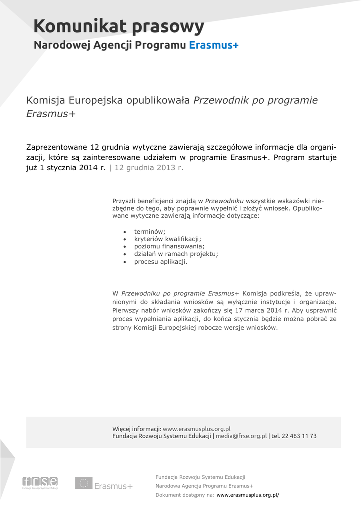 Komisja Europejska opublikowała Przewodnik po programie Erasmus+ Zaprezentowane 12 grudnia wytyczne zawierają szczegółowe informacje dla organizacji, które są zainteresowane udziałem w programie Erasmus+. Program startuje już 1 stycznia 2014 r. | 12 grudnia 2013 r. Przyszli beneficjenci znajdą w Przewodniku wszystkie wskazówki niezbędne do tego, aby poprawnie wypełnić i złożyć wniosek. Opublikowane wytyczne zawierają informacje dotyczące: • • • • • terminów; kryteriów kwalifikacji; poziomu finansowania; działań w ramach projektu; procesu aplikacji. W Przewodniku po programie Erasmus+ Komisja podkreśla, że uprawnionymi do składania wniosków są wyłącznie instytucje i organizacje. Pierwszy nabór wniosków zakończy się 17 marca 2014 r. Aby usprawnić proces wypełniania aplikacji, do końca stycznia będzie można pobrać ze strony Komisji Europejskiej robocze wersje wniosków. Więcej informacji: www.erasmusplus.org.pl Fundacja Rozwoju Systemu Edukacji | [email protected] | tel. 22 463 11 73 Fundacja Rozwoju Systemu Edukacji Narodowa Agencja Programu Erasmus+ Dokument dostępny na: www.erasmusplus.org.pl/