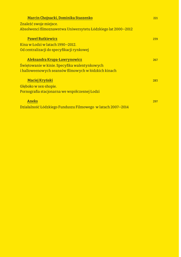 Marcin Chojnacki, Dominika Staszenko 221 Znaleźć swoje miejsce. Absolwenci filmoznawstwa Uniwersytetu Łódzkiego lat 2000—2012 Paweł Rutkiewicz 239 Kina w Łodzi w latach 1990—2012. Od centralizacji do specyfikacji rynkowej Aleksandra Krupa-Ławrynowicz 267 Świętowanie w kinie. Specyfika walentynkowych i halloweenowych seansów filmowych w łódzkich kinach Maciej Kryński 283 Głęboko w sex-shopie. Pornografia stacjonarna we współczesnej Łodzi Aneks Działalność Łódzkiego Funduszu Filmowego w latach 2007—2014 297