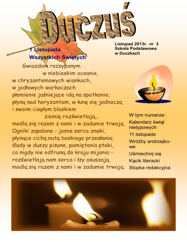 1 Listopada Wszystkich Świętych Listopad 2013r. nr 2 Szkoła Podstawowa w Duczkach Gwiazdom rozsypanym w niebieskim oceanie, w chryzantemowych wiankach, w jodłowych warkoczach płomienie jaśniejące idą na spotkanie; płyną nad horyzontem, w łunę się jednoczą i swoim ciepłym blaskiem ziemię rozświetlają,, modlą się razem z nami i w zadumie trwają. Ogniki zapalone - jasne serca znaki, płynące cichą nutą boskiego przesłania; ślady w duszy pisane, pamiętania ptaki, co nigdy nie odfruną do kraju mijania rozświetlają nam serca i łzy osuszają, modlą się razem z nami i w zadumie trwają. W tym numerze: Kalendarz świąt nietypowych 11 listopada Wróżby andrzejkowe Uśmiechnij się Kącik literacki Stopka redakcyjna Kalendarz Świąt Nietypowych 3 Listopada Święto Myśliwych 4-10 Listopada Światowy Tydzień Przestrzeni Kosmicznej 9 Listopada Światowy Dzień Jakości Międzynarodowy Dzień Walki z Faszyzmem i Antysemityzmem 10 Listopada Dzień Przewodników i Ratowników Górskich 12 Listopada Dzień Drwala 14 Listopada Światowy Dzień Chorych na Cukrzycę Dzień Seniora 16 Listopada Międzynarodowy Dzień Tolerancji (ONZ) 17 Listopada Światowy Dzień Pamięci o Ofiarach Wypadków Drogowych (ONZ) //3 niedziela listopada Dzień Studenta 20 Listopada Dzień Uprzemysłowienia Afryki (ONZ) Powszechny Dzień Dziecka (ONZ) 21 Listopada Święto Wina Dzień Pracownika Socjalnego Światowy Dzień Telewizji (ONZ) Światowy Dzień Życzliwości i Pozdrowień 22-26 Listopada Dni Honorowego Krwiodawstwa w Polsce 24 Listopada Katarzynki Dzień bez Futra Główne obchody z udziałem najwyższych władz państwowych mają miejsce w Warszawie na placu Józefa Piłsudskiego. W samo południe przed Grobem Nieznanego Żołnierza odbywa się uroczysta zmiana warty. W całym kraju organizowane są patriotyczne wiece i pochody, a w kościołach odprawiane msze w intencji ojczyzny. Od upadku komunizmu w 1989, co roku w stolicy dla upamiętnienia święta kilka tysięcy chętnych bierze udział w Biegu Niepodległości. Narodowe Święto Niepodległości jest najważniejszym polskim świętem narodowym. 11 listopada 1918 roku po 123 latach niewoli Polska odzyskała niepodległość. Po latach rozbiorów, dokonanych przez Austrię, Prusy i Rosję w latach 1772-1795, powstaniach narodowych (listopadowym 1830 i styczniowym 1863), zmaganiach na różnych frontach, Polacy dzięki niezłomności, patriotyzmowi i bohaterstwu wywalczyli wolność. Ogromną rolę w odzyskaniu niepodległości odegrał pierwszy marszałek Polski – Józef Piłsudski. Dzień 11 listopada ustanowiono świętem narodowym w 1937 roku. Od roku 1939 do 1989 obchodzenie tego święta było zakazane. Po upadku rządów komunistycznych nabrało szczególnego znaczenia i jest dniem wolnym od pracy. Józef Piłsudski jako mały chłopiec WRÓŻBY KARTECZKOWE TAJEMNICZE KUBECZKI krok1 krok1 Napisz na małych karteczkach imiona chłopców lub dziewcząt. Przygotuj cztery takie same kubeczki, klucz, pierścionek, kostkę do gry planszowej, kostkę cukru. krok 2 krok2 Rzuć karteczki za siebie. Pod kubeczki włóż przedmioty i zmień ułożenie naczyń poprzez przestawienie ich. krok 3 Osoba z karteczki, która upadnie najbliżej Ciebie, zostanie Twoim wybrankiem/ wybranką. krok3 Następnie wskaż wybrany przez siebie kubeczek. PAMIĘTAJ, ŻE MOŻESZ WYBRAĆ TYLKO JEDEN KUBEK!! ZNACZENIE PRZEDMIOTÓW: Klucz - przeprowadzka lub zmiany. Kostka do gry - ciekawe wydarzenia w niedalekiej przyszłości. Pierścionek— spotkanie nowej miłości. Kostka cukru— słodkie życie. LINIA ŻYCIA krok1 Przygotuj mały nóż i jabłko. krok2 Zacznij obierać jabłko ruchem okrężnym. jeśli obierka nie przerwie się, będziesz mieć długie i spokojne życie. Uśmiechnij się! Policjant zatrzymuje samochód, którym jadą trzy osoby. - Gratuluję - mówi policjant - jest pan tysięcznym kierowcą, który przejechał nową szosą. Oto nagroda pieniężna od firmy budującej drogi! Obok pojawia się reporter i pyta: - Na co wyda pan te pieniądze? - No cóż - odpowiada po namyśle kierowca - chyba w końcu zrobię prawo jazdy... Żona kierowcy z przerażeniem: - Nie słuchajcie go panowie... On zawsze lubi żartować, gdy za dużo wypije! W tym momencie z drzemki budzi się, siedzący z tylu dziadek i widząc policjanta zauważa: - A nie mówiłem, że skradzionym samochodem daleko nie zajedziemy!.. Trzej żonaci mężczyźni spotkali się w kościele.Jeden mówi: -Wiecie co? Gdy moja żona była w ciąży czytała książkę "Jaś i Małgosia" i mamy dwoje dzieci. Mówi drugi: -A gdy moja żona była w ciąży czytała "Trzech muszkieterów" i mamy troje dzieci. Ostatni zerwał się do drzwi a jeden spytał: -A gdzie Ty tak pędzisz? -Lecę do domu bo moja żona czyta "101 Dalmatyńczyków. Pani pyta Jasia: - Jasiu powiesz jakieś zdanie w trybie oznajmującym? - Koń ciągnie wóz. - Brawo! A teraz przekształć to zdanie tak aby było zdaniem rozkazującym. - Wio! Bliźniaki wracają ze szkoły i od progu wołają: - Mamo, mamo! Wygrałaś konkurs klasowy "Czyja mama jest najpiękniejsza?". Wszyscy głosowali na swoje własne mamy, a Ty dostałaś dwa głosy.... KĄCIK LITERACKI UWAGA!!! PONAWIAMY SWOJE OGŁOSZENIE DOTYCZĄCE NADSYŁANIA PRZEZ WAS AUTORSKICH UTWORÓW Wszystkich chętnych, którzy posiadają w sobie choć odrobinę zdolności twórczych, pisarskich, zapraszamy do naszego kółka. Spotykamy się w każdy wtorek o godzinie 8:00. Jeśli piszesz opowiadania, wiersze i masz ochotę podzielić się swoją twórczością – pisz na naszego e-mail’a. [email protected] A dziś zapraszamy do zapoznania się z poezją Wisławy Szymborskiej— (1923-2011), polskiej poetki, laureatki Nagrody Nobla. Portret kobiecy Musi być do wyboru. Zmieniać się, żeby tylko nic się nie zmieniło. To łatwe, niemożliwe, trudne, warte próby. Oczy ma, jeśli trzeba, raz modre, raz szare, czarne, wesołe, bez powodu pełne łez. Śpi z n