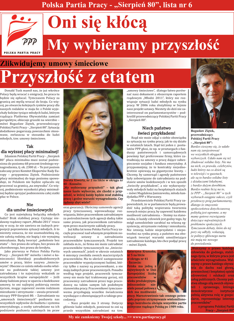 Polska Partia Pracy - „Sierpień 80”, lista nr 6 Oni się kłócą My wybieramy przyszłość Zlikwidujemy umowy śmieciowe Przyszłość z etatem Donald Tusk mamił nas, że już wkrótce Polacy będą wracać z emigracji, bo praca tu będzie się opłacać. Tymczasem Polacy za granicą ani myślą wracać do kraju. Co więcej, po otwarciu kolejnych rynków pracy dla naszych rodaków w maju br. z Polski wyjechały kolejne tysiące młodych ludzi, którym rządząca Platforma Obywatelska zamiast perspektyw, obiecuje gruszki na wierzbie – mówi Bogusław Ziętek, przewodniczący Polskiej Partii Pracy - „Sierpień 80”. Sytuację dodatkowo pogarszają powszechnie stosowane, zwłaszcza w stosunku do ludzi młodych, tzw. umowy śmieciowe. „umowy śmieciowe”, dlatego łatwo porównać nasz dokument z obszernym raportem rządowym „Młodzi 2011”, który nie rozwiązuje sytuacji ludzi młodych na rynku pracy. W 2006 roku złożyliśmy w Sejmie nasz projekt ustawy. Niestety do dziś nie zainteresował on parlamentarzystów – podkreślił przewodniczący Polskiej Partii Pracy -„Sierpień 80”. Niech państwo świeci przykładem! Tak dla wyższej płacy minimalnej! Zdaniem Polskiej Partii Pracy - „Sierpień 80” płaca minimalna musi zostać podniesiona do poziomu 68 procent średniego wynagrodzenia, tj. ok. 2300 zł. – To jest poziom zalecany przez Komitet Ekspertów Rady Europy – przypomina Ziętek. Podniesienie płacy minimalnej do tego poziomu spowoduje, że Polakom nie będzie opłacało się pracować za granicą „na zmywaku”. Co więcej, podniesienie wysokości płacy minimalnej będzie sprzyjać podniesieniu całej siatki płac w Polsce. Nie dla umów śmieciowych! Co jest największą bolączką młodych ludzi? Brak stabilnej pracy. Czytając niedawny rządowy raport „Młodzi 2011” rzuca się w oczy, że nie zawiera on żadnych propozycji poprawienia sytuacji młodych. A to niestety oznacza, że nie usamodzielnią się, nie założą rodziny, nie kupią i nie wynajmą mieszkania. Będą tworzyć „pokolenie bez etatu” – bez prawa do urlopu, bez prawa do chorobowego, bez prawa do kredytu. Jako pierwsza w Polsce Polska Partia Pracy - „Sierpień 80” mówiła i mówi o konieczności likwidacji pozakodeksowych umów o pracę, które nazywa „śmieciowymi”. Obecnie co szósta młoda osoba właśnie na podstawie takiej umowy jest zatrudniana i to najwyższy wskaźnik ze wszystkich krajów europejskich! – Jeśli damy ludziom pracę w oparciu o kodeksowe umowy, to oni najlepiej pokierują swoim życiem, mogąc zapewnić swoim rodzinom mieszkanie i utrzymanie – uważa przewodniczący PPP-Sierpień 80. – Zatrudnianie na „umowach śmieciowych” pozbawia nas wszystkich wpływów do budżetu i systemu emerytalnego, a osoby zatrudniane na ich podstawie pozbawia należnych im praw Dorota Kiwertz, nr 2 na liście w okręgu nr 40 - Koszalin: „My wybieramy przyszłość" – tak głosi nasze hasło wyborcze, ale chodzi o przyszłość, w której każdy będzie miał stabilną pracę i godne warunki wynagradzania. Czy żądamy zbyt wiele? oraz gwarancji. Ukrócimy samowole agencji pracy tymczasowej, wprowadzając rozwiązania, które pracownikom zatrudnianym za pośrednictwem tych agencji dadzą takie same prawa, jak pracownikom zatrudnianym przez macierzyste zakłady pracy. Już kilka lat temu Polska Partia Pracy zaczęła pracować nad własnym projektem nowelizacji ustawy o zatrudnianiu pracowników tymczasowych. Projekt ten zakłada m.in., że firma nie może zatrudniać pracowników tymczasowych na „śmieciowych umowach”, jeżeli w okresie ostatnich 6 miesięcy zwolniła swoich macierzystych pracowników. Ma to ukrócić zastępowanie pracowników wypożyczonymi ludźmi, którzy tylko z nazwy są pracownikami, a nie mają żadnych praw pracowniczych. Ponadto według tego projekt, pracownik tymczasowy nie może być traktowany gorzej, niż pracownicy zatrudnieni przez tego pracodawcę na takim samym lub podobnym stanowisku pracy. Pracownikowi tymczasowemu przysługują wszelkie świadczenia wynikające z obowiązujących u takiego pracodawcy. – Nasz projekt ma 3 strony. Dotyczy głównie ludzi młodych, ponieważ to oni są przede wszystkim zatrudniani na tzw. Rząd nie może zdjąć z siebie obowiązku za sytuację na rynku pracy, jak to się działo w ostatnich latach. Stąd też jeden z postulatów PPP głosi, że np. w przetargach z funduszy państwowych i samorządowych powinny być preferowane firmy, które zatrudniają na umowy o pracę dające zabezpieczenie socjalne i fundusz emerytalny. A przypomnijmy, że te kontrakty niejednokrotnie opiewają na gigantyczne kwoty. – Chcemy, by samorząd i agendy państwowe były zobowiązane do zatrudniania na podstawie umów kodeksowych i w ten sposób „świeciły przykładem”, a nie wykorzystywały młodych ludzi na bezpłatnych stażach – mówi Magdalena Janiszewska, młoda kandydatka PPP z Warszawy. Przedstawiciele Polskiej Partii Pracy zapowiedzieli, że w parlamencie będą prowadzić taką politykę wspierania tworzenia nowych miejsc pracy, by zapewnić każdemu możliwość zatrudnienia. – Stoimy na stanowisku, iż każdy człowiek jest godny tego, by mógł samodzielnie zarabiać na własną egzystencję, utrzymanie rodziny i mieszkania. Nie istnieją ludzie nieprzydatni i niepotrzebni na rynku pracy, a państwo ma obowiązek tworzyć warunki umożliwiające zatrudnienie każdego, kto chce podjąć pracę – mówi Ziętek. Katarzyna Krasuska, nr 5 na liście w okręgu nr 41 - Szczecin: Polska ma jedną z najwyższych w Unii Europejskiej liczbę pracowników w wieku produkcyjnym. Jednocześnie niewiele ponad połowa z nich ma możliwości pracy. Marnotrawienie tak cennego potencjału poprzez utrzymywanie wielomilionowego bezrobocia obciąża wszystkie partie polityczne rządzące Polską po 1989 roku. My nie zamkniemy Twojej szkoły... >> www.partiapracy.pl Bogusław Ziętek, 