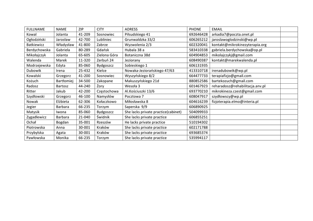 FULLNAME Kowal Ogłodziński Batkiewicz Berdychowska Mikołajczyk Walenda Modrzejewska Dubowik Kowalski Kożuch Radosz Ritter Szydłowski Nowak Jegier Matysik Zygadlewicz Ochał Piotrowska Przybylska Pawłowska NAME Jolanta Jarosław Władysław Gabriela Jolanta Marek Edyta Irena Grzegorz Bartłomiej Bartosz Jakub Grzegorz Elżbieta Barbara Iwona Barbara Bogdan Anna Agata Monika ZIP 41-209 42-700 41-800 80-289 65-605 11-320 85-060 25-432 41-200 34-500 44-240 42-200 46-100 62-306 66-235 85-060 21-040 35-001 30-001 30-001 66-235 CITY Sosnowiec Lubliniec Zabrze Gdańsk ZielonaGóra Zerbuń24 Bydgoszcz Kielce Sosnowiec Zakopane Żory Częstochowa Namysłów Kołaczkowo Torzym Bydgoszcz Świdnik Rzeszów Kraków Kraków Torzym ADRESS Piłsudskiego41 Grunwaldzka33/2 Wyzwolenia2/3 Hubala38a Botaniczna38d Jeziorany Sobieskiego1 Nowaka-Jeziorańskiego47/63 Wyszyńskiego8/2 Makuszyńskiego21d Wesoła3 Al.Kościuszki13/6 Pocztowa7 Miłosławska8 Saperska9/9 Shelacksprivatepractice(cabinet) Shelacksprivatepractice Helacksprivatepractice Shelacksprivatepractice Shelacksprivatepractice Shelacksprivatepractice PHONE 692646428 606265212 602320041 583410338 604904853 608490387 606131935 413310718 664477733 880852586 601467923 693770210 608047917 604616239 606890925 504099933 606855251 510194302 602171788 693685374 535994117 EMAIL [email protected] [email protected] [email protected] [email protected] [email protected] [email protected] [email protected] [email protected] [email protected] [email protected] [email protected] szydł[email protected] [email protected]