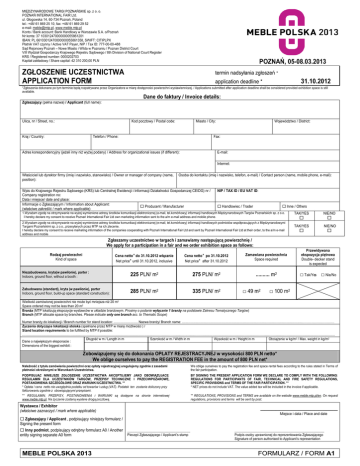 MIĘDZYNARODOWE TARGI POZNAŃSKIE sp. z o. o. POZNAŃ INTERNATIONAL FAIR Ltd. ul. Głogowska 14, 60-734 Poznań, Poland tel.: +48/ 61 869 25 10, fax: +48/ 61 869 29 52 e-mail: [email protected], www.meble.mtp.pl Konto / Bank account: Bank Handlowy w Warszawie S.A. o/Poznań Nr konta: 37 103012470000000055861201 IBAN: PL 66103012470000000055861358, SWIFT: CITIPLPX Płatnik VAT czynny / Active VAT Payer, NIP / Tax ID: 777-00-00-488 Sąd Rejonowy Poznań – Nowe Miasto i Wilda w Poznaniu / Poznan District Court VIII Wydział Gospodarczy Krajowego Rejestru Sądowego / 8th Division of National Court Register KRS / Registered number: 0000202703 Kapitał zakładowy / Share capital: 42 310 200,00 PLN POZNAŃ, 05-08.03.2013 ZGŁOSZENIE UCZESTNICTWA APPLICATION FORM termin nadsyłania zgłoszeń * 31.10.2012 application deadline * *Zgłoszenia dokonane po tym terminie będą rozpatrywane przez Organizatora w miarę dostępności powierzchni wystawienniczej. / Applications submitted after application deadline shall be considered provided exhibition space is still available. Dane do faktury / Invoice details: Zgłaszający (pełna nazwa) / Applicant (full name): Ulica, nr / Street, no.: Kod pocztowy / Postal code: Kraj / Country: Miasto / City: Telefon / Phone: Województwo / District: Fax: Adres korespondencyjny (jeŜeli inny niŜ wyŜej podany) / Address for organizational issues (if different): E-mail: Internet: Właściciel lub dyrektor firmy (imię i nazwisko, stanowisko) / Owner or manager of company (name, position): Osoba do kontaktu (imię i nazwisko, telefon, e-mail) / Contact person (name, mobile phone, e-mail): Wpis do Krajowego Rejestru Sądowego (KRS) lub Centralnej Ewidencji i Informacji Działalności Gospodarczej CEIDG) nr / Company registration no: Data i miejsce/ date and place: Informacje o Zgłaszającym / Information about Applicant: Producent / Manufacturer (właściwe zakreślić / mark where applicable) NIP / TAX ID / EU VAT ID: Handlowiec / Trader Inne / Others 1.WyraŜam zgodę na otrzymywanie na wyŜej wymienione adresy środków komunikacji elektronicznej (e-mail, tel.komórkowy) informacji handlowych Międzynarodowych Targów Poznańskich sp. z o.o. I hereby declare my consent to receive Poznań International Fair Ltd own marketing information sent to the a/m e-mail address and mobile phone. 2.WyraŜam zgodę na otrzymywanie na wyŜej wymienione adresy środków komunikacji elektronicznej (e-mail, tel.komórkowy) informacji handlowych podmiotów współpracujących z Międzynarodowymi Targami Poznańskimi sp. z o.o., przesyłanych przez MTP na ich zlecenie. I hereby declare my consent to receive marketing information of the companies cooperating with Poznań International Fair Ltd and sent by Poznań International Fair Ltd at their order, to the a/m e-mail address and mobile TAK/YES NIE/NO TAK/YES NIE/NO Zgłaszamy uczestnictwo w targach i zamawiamy następującą powierzchnię / We apply for a participation in a fair and we order exhibition space as follows: Cena netto* do 31.10.2012 włącznie Net price* until 31.10.2012, inclusive Cena netto* po 31.10.2012 Net price* after 31.10.2012 Zamawiana powierzchnia Space required Przewidywana ekspozycja piętrowa Double- decker stand is expected Niezabudowana, kryta(w pawilonie), parter : Indoors, ground floor, without a booth : 225 PLN/ m2 275 PLN/ m2 .......... m2 □ Tak/Yes □ Nie/No Zabudowana (standard), kryta (w pawilonie), parter Indoors, ground floor, build-up space (standard construction): 285 PLN/ m2 335 PLN/ m2 Rodzaj powierzchni Kind of space □ 49 m2 □ 100 m2 Wielkość zamówionej powierzchni nie moŜe być mniejsza niŜ 20 m2 Space ordered may not be less than 20 m2 BranŜa (MTP lokalizują ekspozycje wystawców w układzie branŜowym. Prosimy o podanie wyłącznie 1 branŜy na podstawie Zakresu Tematycznego Targów) Branch (MTP allocate space by branches. Please indicate only one branch acc. to Thematic Scope) Numer branŜy do lokalizacji / Branch number for stand location: ........................... Nazwa branŜy/ Branch name: ......................................................................................................................................………………………… śyczenia dotyczące lokalizacji stoiska (spełniane przez MTP w miarę moŜliwości ) / Stand location requirements to be fulfilled by MTP if possible: ………………………………………………………………………………………………………………………………………………………………………………………………………………………………………………………………… Długość w m / Length in m Szerokość w m / Width in m Wysokość w m / Height in m ObciąŜenie w kg/m2 / Max. weight in kg/m2 Dane o największym eksponacie : Dimensions of the biggest exhibit : Zobowiązujemy się do dokonania OPŁATY REJESTRACYJNEJ w wysokości 800 PLN netto* We oblige ourselves to pay the REGISTRATION FEE in the amount of 800 PLN net* NaleŜność z tytułu zamówienia powierzchni oraz opłaty rejestracyjnej uregulujemy zgodnie z zasadami płatności określonymi w Warunkach Uczestnictwa. We oblige ourselves to pay the registration fee and space rental fees according to the rules stated in Terms of the fair participation. PODPISUJĄC NINIEJSZE ZGŁOSZENIE UCZESTNICTWA AKCEPTUJEMY JAKO OBOWIĄZUJACE: REGULAMIN DLA UCZESTNIKÓW TARGÓW, PRZEPISY TECHNICZNE I PRZECIWPOśAROWE, POSTANOWIENIA SZCZEGÓŁOWE ORAZ WARUNKI UCZESTNICTWA. ** * Opłata / cena netto nie uwzględnia podatku od towarów i usług (VAT). Podatek ten zostanie doliczony przy fakturowaniu zgodnie z obowiązującymi przepisami. ** REGULAMIN, PRZEPISY, POSTANOWIENIA i WARUNKI są dostępne na stronie internetowej www.meble.mtp.pl. Na Ŝyczenie zostaną wysłane drogą pocztową. BY SIGNING THE PRESENT APPLICATION FORM WE DECLARE TO COMPLY WITH THE FOLLOWING: REGULATIONS FOR PARTICIPANTS OF FAIR,
