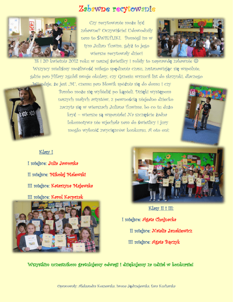 Zabawne recytowanie Czy recytowanie może być zabawne? Oczywiście! Udowodniły nam to ŚWIETLIKI. Pomógł im w tym Julian Tuwim, gdyż to jego wiersze recytowały dzieci 18 i 20 kwietnia 2012 roku w naszej świetlicy i robiły to naprawdę zabawnie Wszyscy mieliśmy możliwość miłego spędzenia czasu, zastanawiając się wspólnie, gdzie pan Hilary zgubił swoje okulary, czy Grzesiu wrzucił list do skrzynki, dlaczego „W” udaje, że jest „M”, czemu pan Słowik spóźnia się do domu i czy Bambo może się wybielić po kąpieli. Dzięki występom naszych małych artystów, z pewnością niejedno dziecko zaczyta się w wierszach Juliana Tuwima, bo co tu dużo kryć – wiersze są wspaniałe! Na szczęście żadna lokomotywa nie wjechała nam do świetlicy i jury mogło wyłonić zwycięzców konkursu. A oto oni: Klasy I I miejsce: Julia Jaworska II miejsce: Mikołaj Malewski III miejsce: Katarzyna Majewska III miejsce: Karol Kacprzak Klasy II i III: I miejsce: Agata Chojnacka II miejsce: Natalia Janakiewicz III miejsce: Agata Bączyk Wszystkim uczestnikom gratulujemy odwagi i dziękujemy za udział w konkursie! Opracowały: Aleksandra Koszewska, Iwona Jędrzejewska, Ewa Kucharska