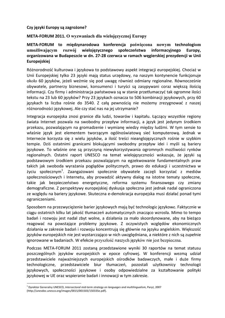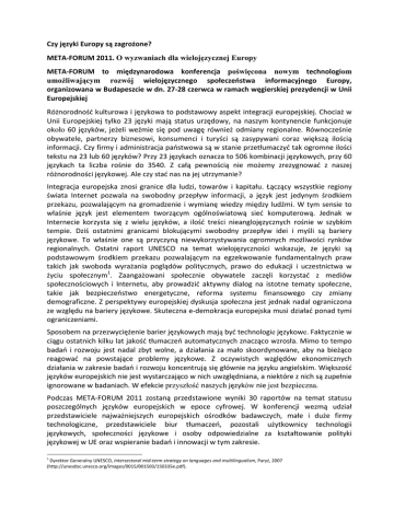 Czy języki Europy są zagrożone? META-‐FORUM 2011. O wyzwaniach dla wielojęzycznej Europy META-‐FORUM to międzynarodowa konferencja poświęcona nowym technologiom umożliwającym rozwój wielojęzycznego społeczeństwa informacyjnego Europy, organizowana w Budapeszcie w dn. 27-‐28 czerwca w ramach węgierskiej prezydencji w Unii Europejskiej Różnorodność kulturowa i językowa to podstawowy aspekt integracji europejskiej. Chociaż w Unii Europejskiej tylko 23 języki mają status urzędowy, na naszym kontynencie funkcjonuje około 60 języków, jeżeli weźmie się pod uwagę również odmiany regionalne. Równocześnie obywatele, partnerzy biznesowi, konsumenci i turyści są zasypywani coraz większą ilością informacji. Czy firmy i administracja państwowa są w stanie przetłumaczyć tak ogromne ilości tekstu na 23 lub 60 języków? Przy 23 językach oznacza to 506 kombinacji językowych, przy 60 językach ta liczba rośnie do 3540. Z całą pewnością nie możemy zrezygnować z naszej różnorodności językowej. Ale czy stać nas na jej utrzymanie? Integracja europejska znosi granice dla ludzi, towarów i kapitału. Łączący wszystkie regiony świata Internet pozwala na swobodny przepływ informacji, a język jest jedynym środkiem przekazu, pozwalającym na gromadzenie i wymianę wiedzy między ludźmi. W tym sensie to właśnie język jest elementem tworzącym ogólnoświatową sieć komputerową. Jednak w Internecie korzysta się z wielu języków, a ilość treści nieanglojęzycznych rośnie w szybkim tempie. Dziś ostatnimi granicami blokującymi swobodny przepływ idei i myśli są bariery językowe. To właśnie one są przyczyną niewykorzystywania ogromnych możliwości rynków regionalnych. Ostatni raport UNESCO na temat wielojęzyczności wskazuje, że języki są podstawowym środkiem przekazu pozwalającym na egzekwowanie fundamentalnych praw takich jak swoboda wyrażania poglądów politycznych, prawo do edukacji i uczestnictwa w życiu społecznym1. Zaangażowani społecznie obywatele zaczęli korzystać z mediów społecznościowych i Internetu, aby prowadzić aktywny dialog na istotne tematy społeczne, takie jak bezpieczeństwo energetyczne, reforma systemu finansowego czy zmiany demograficzne. Z perspektywy europejskiej dyskusja społeczna jest jednak nadal ograniczona ze względu na bariery językowe. Skuteczna e-‐demokracja europejska musi działać ponad tymi ograniczeniami. Sposobem na przezwyciężenie barier językowych mają być technologie językowe. Faktycznie w ciągu ostatnich kilku lat jakość tłumaczeń automatycznych znacząco wzrosła. Mimo to tempo badań i rozwoju jest nadal zbyt wolne, a działania za mało skoordynowane, aby na bieżąco reagować na powstające problemy językowe. Z oczywistych względów ekonomicznych działania w zakresie badań i rozwoju koncentrują się głównie na języku angielskim. Większość języków europejskich nie jest wystarczająco w nich uwzględniana, a niektóre z nich są zupełnie ignorowane w badaniach. W efekcie przyszłość naszych języków nie jest bezpieczna. Podczas META-‐FORUM 2011 zostaną przedstawione wyniki 30 raportów na temat statusu poszczególnych języków europejskich w epoce cyfrowej. W konferencji wezmą udział przedstawiciele najważniejszych europejskich ośrodków badawczych, małe i duże firmy technologiczne, przedstawiciele biur tłumaczeń, pozostali użytkownicy technologii językowych, społeczności językowe i osoby odpowiedzialne za kształtowanie polityki językowej w UE oraz wspieranie badań i innowacji w tym zakresie. 1 Dyrektor Generalny UNESCO, Intersectoral mid-‐term strategy on languages and multilingualism, Paryż, 2007 (http://unesdoc.unesco.org/images/0015/001503/150335e.pdf). Spotkanie organizuje META-‐NET, Sieć Doskonałości składająca się z 47 ośrodków badawczych z 31 krajów, finansowana przez Komisję Europejską. Polska jest reprezentowana w tej Sieci przez Instytut Podstaw Informatyki PAN oraz Uniwersytet Łódzki. META-‐NET tworzy „Technologiczny Sojusz Wielojęzycznej Europy” jednoczący naukowców, dostawców i użytkowników technologii językowych we wspólnym działaniu na rzecz badań i innowacji w Europie. Jak dotąd do sojuszu przystąpili już przedstawiciele ponad 280 organizacji z 40 krajów. W swoim przemówieniu otwierającym konferencję Zoran Stančič, zastępca Dyrektora Generalnego ds. społeczeństwa informacyjnego i mediów w Komisji Europejskiej, formułuje wyraźne oczekiwania: „W Unii Europejskiej niemal znieśliśmy fizyczne granice między państwami, ale nadal dzielą nas granice innego rodzaju, m.in. bariery językowe. Dostęp do informacji we wszystkich językach jest warunkiem koniecznym zwiększenia sprzedaży produktów i usług oraz powstania w pełni jednolitego rynku cyfrowego. Jestem przekonany, że Europa może nadal zajmować pozycję lidera w zakresie technologii językowych i dostarczać rozwiązania, które będą działać na korzyść społeczeństwa europejskiego i całej gospodarki. Jednak można to osiągnąć tylko wspólnym wysiłkiem, tworząc silne partnerstwo ze wszystkimi zainteresowanymi. Miejsce technologii językowych wśród innych dziedzin badań i rozwoju w Europie będzie w dużym stopniu zależeć od tego, czy wszystkie zainteresowane strony przemówią jednym głosem”. Uczestnicy META-‐FORUM będą dyskutować o wizji i wstępnych planach dotyczących spodziewanego postępu technologicznego. Dzięki trzem grupom roboczym i dialogowi publicznemu prowadzonemu w Internecie eksperci z ponad 100 firm i organizacji naukowych stworzyli śmiałe wizje przyszłych badań i szerokich zastosowań technologii językowych, które będą mieć wpływ na naszą pracę i codzienne życie. Opracowane wizje zostaną przedstawione i omówione podczas konferencji w Budapeszcie. Wspólna wizja posłuży jako punkt wyjścia planów badań strategicznych, których