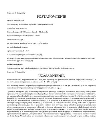 Sygn. akt II Cz 236/15 POSTANOWIENIE Dnia 26 lutego 2015 r. Sąd Okręgowy w Szczecinie Wydział II Cywilny Odwoławczy w składzie następującym: Przewodniczący: SSO Wiesława Buczek – Markowska Sędziowie SO Agnieszka Bednarek – Moraś SO Tomasz Szaj (spr.) po rozpoznaniu w dniu 26 lutego 2015 r. w Szczecinie na posiedzeniu niejawnym sprawy z wniosku J. S. i S. S. o wyłączenie sędziego w sprawie I Co 1297/13 na skutek zażalenia wnioskodawców na postanowienie Sądu Rejonowego w Gryfinie z dnia 20 października 2014 roku, w sprawie o sygn. akt I Co 935/14 oddala zażalenie. SSO Tomasz Szaj SSO Wiesława Buczek – Markowska SSO Agnieszka Bednarek - Moraś Sygn. akt II Cz 236/15 UZASADNIENIE Postanowieniem z 20 października 2014 roku, Sąd Rejonowy w Gryfinie oddalił wniosek o wyłączenie sędziego (...) od prowadzenia postępowania z wniosku (...) w B. – I Co 1297/13. Sąd Rejonowy wskazał, że przyczyny wyłączenia sędziego określone są w art. 48 § 1 oraz art. 49 k.p.c. Przyczyny uzasadniające wyłączenie sędziego określają przepisy art. 48 i 49 k.p.c. Zgodnie z treścią art. 48 § 1 kodeksu postępowania cywilnego sędzia jest wyłączony z mocy samej ustawy: 1) w sprawach, w których jest stroną lub pozostaje z jedną ze stron w takim stosunku prawnym, że wynik sprawy oddziaływa na jego prawa lub obowiązki; 2) w sprawach swego małżonka, krewnych lub powinowatych w linii prostej, krewnych bocznych do czwartego stopnia i powinowatych bocznych do drugiego stopnia; 3) w sprawach osób związanych z nim z tytułu przysposobienia, opieki lub kurateli; 4) w sprawach, w których był lub jest jeszcze pełnomocnikiem albo był radcą prawnym jednej ze stron; 5) w sprawach, w których w instancji niższej brał udział w wydaniu zaskarżonego orzeczenia, jako też w sprawach o ważność aktu prawnego z jego udziałem sporządzonego lub przez niego rozpoznanego oraz w sprawach, w których występował jako prokurator; 6) sprawach o odszkodowanie z tytułu szkody wyrządzonej przez wydanie prawomocnego orzeczenia niezgodnego z prawem, jeżeli brał udział w wydaniu tego orzeczenia. § 2. Powody wyłączenia trwają także po ustaniu uzasadniającego je małżeństwa, przysposobienia, opieki lub kurateli. § 3 Sędzia, który brał udział w wydaniu orzeczenia objętego skargą o wznowienie, nie może orzekać co do tej skargi. W myśl art.49 kpc niezależnie od przyczyn wymienionych w art. 48, sąd wyłącza sędziego na jego żądanie lub na wniosek strony, jeżeli istnieje okoliczność tego rodzaju, że mogłaby wywołać uzasadnioną wątpliwość co do bezstronności sędziego w danej sprawie. Sąd Rejonowy wskazał, że z analizy wniosku J. S. i S. S. oraz oświadczenia sędziego (...) wynika, iż w niniejszej sprawie nie występują żadne przyczyny o charakterze ustawowym, związane z występowaniem jakiegoś stosunku osobistego między sędzią a którąkolwiek ze stron w rozumieniu art. 48 i 49 k.p.c., jak również inne okoliczności, które mogłyby wywołać wątpliwości co do bezstronności sędziego i uzasadniałyby jego wyłączenie. Zarzut dłużników, jakoby sędzia nie powinien orzekać w żadnej sprawie ich dotyczącej do czasu prawomocnego rozstrzygnięcia ich wniosku o wyłączenie tego sędziego w sprawie I Ns 500/10, nie jest zasadny. Żaden przepis prawa nie zakazuje sędziemu rozstrzygania spraw strony, która wniosła o jego wyłączenie, do czasu rozstrzygnięcia wniosku o takie wyłączenie w innej sprawie, za wyjątkiem sprawy, której wniosek dotyczy (art. 50 § 3 k.p.c.). W niniejszej sprawie powstrzymanie się od podejmowania decyzji przez sędziego (...) dotyczy wyłącznie sprawy I Ns 500/10, nie ma natomiast zastosowania do innych spraw toczących się w sądzie z udziałem J. S. i S. S.. Sprawa egzekucyjna I Co 1297/13, której podstawą jest realizacja postanowienia o zabezpieczeniu udzielonym w sprawie I Ns 500/10 jest sprawą odrębną, o niezależnym bycie od sprawy I Ns 500/10, zatem nie ma przeszkód do rozpoznania jej przez sędziego K., o ile nie zachodzą powołane powyżej ustawowe przesłanki wyłączenia sędziego, których jednak w żaden sposób nie wykazano. Na powyższe postanowienie zażalenie złożyli S. S. i J. S., zaskarżając je w całości i wnosząc o wyłączenie sędziego od orzekania w niniejszej sprawie, a ewentualnie o uchylenie postanowienia i przekazanie sprawy do ponownego rozpoznania. Podnieśli, że sędzia powinien być wyłączony w sprawie I Co 1297/13 albowiem jest to sprawa ściśle związana ze sprawą I Ns 500/10 i dotyczą tej samej nieruchomości, a także żądanie wyłączenia sędziego w jednej sprawie wywołuje wątpliwości co do bezstronności sędziego co do tej strony również w innych sprawach, gdyż może być uprzedzony do tej strony. Sąd Okręgowy zważył, co następuje: Zażalenie podlegało oddaleniu jako oczywiście bezzasadne. W niniejszej sprawie Sąd Rejonowy dokonał prawidłowej oceny przesłanek wyłączenia sędziego i przedstawił szeroko obowiązujące przepisy oraz stanowisko orzecznictwa w tej kwestii. Zażalenie w istocie nie zawiera żadnych argumentów przeciwko wydanemu orzeczeniu. Podkreślić przy tym należy, że prawomocnym postanowieniem Sądu Okręgowego w Szczecinie z dnia 18 czerwca 2014 roku, sygn. akt II Cz 884/14 Sąd Okręgowy oddalił zażalenie wnioskodawców na postanowienie o oddaleniu wniosku o wyłączenie sędziego(...)od rozpoznania sprawy I Ns 500/10. Tym samym postępowanie w przedmiocie wyłączenia sędziego od rozpoznania tej sprawy prawomocnie się zakończyło, zaś sędzia (...) nie został wyłączony od jej rozpoznania. Nadto dostrzec należy, że postępowanie I Co 1297/13 nie jest postępowaniem rozpoznawczym, lecz stanowi postępowanie wykonawcze w zakresie postanowienia z dnia 28 kwietnia 2011 roku w sprawie I Ns 500/10, regulującego stosunki stron na czas trwania postępowania. Trafnie skarżący wskazują, że 