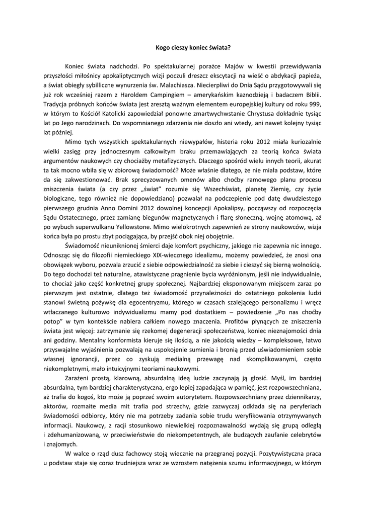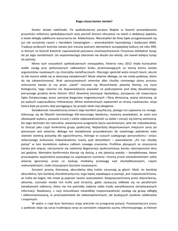 Kogo cieszy koniec świata? Koniec świata nadchodzi. Po spektakularnej porażce Majów w kwestii przewidywania przyszłości miłośnicy apokaliptycznych wizji poczuli dreszcz ekscytacji na wieść o abdykacji papieża, a świat obiegły sybilliczne wynurzenia św. Malachiasza. Niecierpliwi do Dnia Sądu przygotowywali się już rok wcześniej razem z Haroldem Campingiem – amerykańskim kaznodzieją i badaczem Biblii. Tradycja próbnych końców świata jest zresztą ważnym elementem europejskiej kultury od roku 999, w którym to Kościół Katolicki zapowiedział ponowne zmartwychwstanie Chrystusa dokładnie tysiąc lat po Jego narodzinach. Do wspomnianego zdarzenia nie doszło ani wtedy, ani nawet kolejny tysiąc lat później. Mimo tych wszystkich spektakularnych niewypałów, histeria roku 2012 miała kuriozalnie wielki zasięg przy jednoczesnym całkowitym braku przemawiających za teorią końca świata argumentów naukowych czy chociażby metafizycznych. Dlaczego spośród wielu innych teorii, akurat ta tak mocno wbiła się w zbiorową świadomość? Może właśnie dlatego, że nie miała podstaw, które da się zakwestionować. Brak sprecyzowanych omenów albo choćby ramowego planu procesu zniszczenia świata (a czy przez „świat” rozumie się Wszechświat, planetę Ziemię, czy życie biologiczne, tego również nie dopowiedziano) pozwalał na podczepienie pod datę dwudziestego pierwszego grudnia Anno Domini 2012 dowolnej koncepcji Apokalipsy, począwszy od rozpoczęcia Sądu Ostatecznego, przez zamianę biegunów magnetycznych i flarę słoneczną, wojnę atomową, aż po wybuch superwulkanu Yellowstone. Mimo wielokrotnych zapewnień ze strony naukowców, wizja końca była po prostu zbyt pociągająca, by przejść obok niej obojętnie. Świadomość nieuniknionej śmierci daje komfort psychiczny, jakiego nie zapewnia nic innego. Odnosząc się do filozofii niemieckiego XIX-wiecznego idealizmu, możemy powiedzieć, że znosi ona obowiązek wyboru, pozwala zrzucić z siebie odpowiedzialność za siebie i cieszyć się bierną wolnością. Do tego dochodzi też naturalne, atawistyczne pragnienie bycia wyróżnionym, jeśli nie indywidualnie, to chociaż jako część konkretnej grupy społecznej. Najbardziej eksponowanym miejscem zaraz po pierwszym jest ostatnie, dlatego też świadomość przynależności do ostatniego pokolenia ludzi stanowi świetną pożywkę dla egocentryzmu, którego w czasach szalejącego personalizmu i wręcz wtłaczanego kulturowo indywidualizmu mamy pod dostatkiem – powiedzenie „Po nas choćby potop” w tym kontekście nabiera całkiem nowego znaczenia. Profitów płynących ze zniszczenia świata jest więcej: zatrzymanie się rzekomej degeneracji społeczeństwa, koniec nieznajomości dnia ani godziny. Mentalny konformista kieruje się ilością, a nie jakością wiedzy – kompleksowe, łatwo przyswajalne wyjaśnienia pozwalają na uspokojenie sumienia i bronią przed uświadomieniem sobie własnej ignorancji, przez co zyskują medialną przewagę nad skomplikowanymi, często niekompletnymi, mało intuicyjnymi teoriami naukowymi. Zarażeni prostą, klarowną, absurdalną ideą ludzie zaczynają ją głosić. Myśl, im bardziej absurdalna, tym bardziej charakterystyczna, ergo lepiej zapadająca w pamięć, jest rozpowszechniana, aż trafia do kogoś, kto może ją poprzeć swoim autorytetem. Rozpowszechniany przez dziennikarzy, aktorów, rozmaite media mit trafia pod strzechy, gdzie zazwyczaj odkłada się na peryferiach świadomości odbiorcy, który nie ma potrzeby zadania sobie trudu weryfikowania otrzymywanych informacji. Naukowcy, z racji stosunkowo niewielkiej rozpoznawalności wydają się grupą odległą i zdehumanizowaną, w przeciwieństwie do niekompetentnych, ale budzących zaufanie celebrytów i znajomych. W walce o rząd dusz fachowcy stoją wiecznie na przegranej pozycji. Pozytywistyczna praca u podstaw staje się coraz trudniejsza wraz ze wzrostem natężenia szumu informacyjnego, w którym szansę przebicia się mają tylko najbardziej wyróżniające się poglądy. Naukowy sceptycyzm zazwyczaj powstrzymuje racjonalistów od wydawania sądów pewnych, absolutnych, a zdrowy rozsądek ciężko zredukować do chwytliwego sloganu. Jak więc ustrzec się przed zbiorową histerią? Na sposób kartezjański – nie bać się własnej niewiedzy i kwestionować wszystko.
