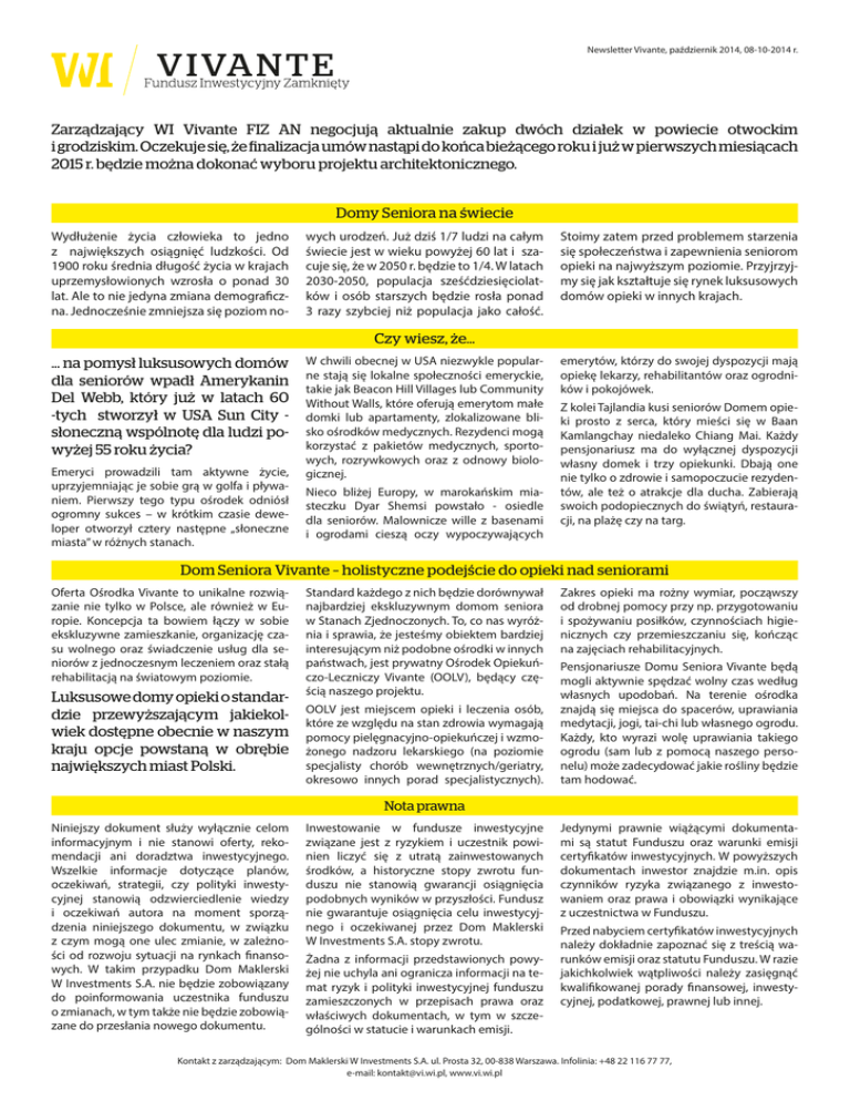 Newsletter Vivante, październik 2014, 08-10-2014 r. Zarządzający WI Vivante FIZ AN negocjują aktualnie zakup dwóch działek w powiecie otwockim i grodziskim. Oczekuje się, że finalizacja umów nastąpi do końca bieżącego roku i już w pierwszych miesiącach 2015 r. będzie można dokonać wyboru projektu architektonicznego. Domy Seniora na świecie Wydłużenie życia człowieka to jedno z największych osiągnięć ludzkości. Od 1900 roku średnia długość życia w krajach uprzemysłowionych wzrosła o ponad 30 lat. Ale to nie jedyna zmiana demograficzna. Jednocześnie zmniejsza się poziom no- wych urodzeń. Już dziś 1/7 ludzi na całym świecie jest w wieku powyżej 60 lat i szacuje się, że w 2050 r. będzie to 1/4. W latach 2030-2050, populacja sześćdziesięciolatków i osób starszych będzie rosła ponad 3 razy szybciej niż populacja jako całość. Stoimy zatem przed problemem starzenia się społeczeństwa i zapewnienia seniorom opieki na najwyższym poziomie. Przyjrzyjmy się jak kształtuje się rynek luksusowych domów opieki w innych krajach. Czy wiesz, że… ... na pomysł luksusowych domów dla seniorów wpadł Amerykanin Del Webb, który już w latach 60 -tych stworzył w USA Sun City słoneczną wspólnotę dla ludzi powyżej 55 roku życia? Emeryci prowadzili tam aktywne życie, uprzyjemniając je sobie grą w golfa i pływaniem. Pierwszy tego typu ośrodek odniósł ogromny sukces – w krótkim czasie deweloper otworzył cztery następne „słoneczne miasta” w różnych stanach. W chwili obecnej w USA niezwykle popularne stają się lokalne społeczności emeryckie, takie jak Beacon Hill Villages lub Community Without Walls, które oferują emerytom małe domki lub apartamenty, zlokalizowane blisko ośrodków medycznych. Rezydenci mogą korzystać z pakietów medycznych, sportowych, rozrywkowych oraz z odnowy biologicznej. Nieco bliżej Europy, w marokańskim miasteczku Dyar Shemsi powstało - osiedle dla seniorów. Malownicze wille z basenami i ogrodami cieszą oczy wypoczywających emerytów, którzy do swojej dyspozycji mają opiekę lekarzy, rehabilitantów oraz ogrodników i pokojówek. Z kolei Tajlandia kusi seniorów Domem opieki prosto z serca, który mieści się w Baan Kamlangchay niedaleko Chiang Mai. Każdy pensjonariusz ma do wyłącznej dyspozycji własny domek i trzy opiekunki. Dbają one nie tylko o zdrowie i samopoczucie rezydentów, ale też o atrakcje dla ducha. Zabierają swoich podopiecznych do świątyń, restauracji, na plażę czy na targ. Dom Seniora Vivante – holistyczne podejście do opieki nad seniorami Oferta Ośrodka Vivante to unikalne rozwiązanie nie tylko w Polsce, ale również w Europie. Koncepcja ta bowiem łączy w sobie ekskluzywne zamieszkanie, organizację czasu wolnego oraz świadczenie usług dla seniorów z jednoczesnym leczeniem oraz stałą rehabilitacją na światowym poziomie. Luksusowe domy opieki o standardzie przewyższającym jakiekolwiek dostępne obecnie w naszym kraju opcje powstaną w obrębie największych miast Polski. Standard każdego z nich będzie dorównywał najbardziej ekskluzywnym domom seniora w Stanach Zjednoczonych. To, co nas wyróżnia i sprawia, że jesteśmy obiektem bardziej interesującym niż podobne ośrodki w innych państwach, jest prywatny Ośrodek Opiekuńczo-Leczniczy Vivante (OOLV), będący częścią naszego projektu. OOLV jest miejscem opieki i leczenia osób, które ze względu na stan zdrowia wymagają pomocy pielęgnacyjno-opiekuńczej i wzmożonego nadzoru lekarskiego (na poziomie specjalisty chorób wewnętrznych/geriatry, okresowo innych porad specjalistycznych). Zakres opieki ma rożny wymiar, począwszy od drobnej pomocy przy np. przygotowaniu i spożywaniu posiłków, czynnościach higienicznych czy przemieszczaniu się, kończąc na zajęciach rehabilitacyjnych. Pensjonariusze Domu Seniora Vivante będą mogli aktywnie spędzać wolny czas według własnych upodobań. Na terenie ośrodka znajdą się miejsca do spacerów, uprawiania medytacji, jogi, tai-chi lub własnego ogrodu. Każdy, kto wyrazi wolę uprawiania takiego ogrodu (sam lub z pomocą naszego personelu) może zadecydować jakie rośliny będzie tam hodować. Nota prawna Niniejszy dokument służy wyłącznie celom informacyjnym i nie stanowi oferty, rekomendacji ani doradztwa inwestycyjnego. Wszelkie informacje dotyczące planów, oczekiwań, strategii, czy polityki inwestycyjnej stanowią odzwierciedlenie wiedzy i oczekiwań autora na moment sporządzenia niniejszego dokumentu, w związku z czym mogą one ulec zmianie, w zależności od rozwoju sytuacji na rynkach finansowych. W takim przypadku Dom Maklerski W Investments S.A. nie będzie zobowiązany do poinformowania uczestnika funduszu o zmianach, w tym także nie będzie zobowiązane do przesłania nowego dokumentu. Inwestowanie w fundusze inwestycyjne związane jest z ryzykiem i uczestnik powinien liczyć się z utratą zainwestowanych środków, a historyczne stopy zwrotu funduszu nie stanowią gwarancji osiągnięcia podobnych wyników w przyszłości. Fundusz nie gwarantuje osiągnięcia celu inwestycyjnego i oczekiwanej przez Dom Maklerski W Investments S.A. stopy zwrotu. Żadna z informacji przedstawionych powyżej nie uchyla ani ogranicza informacji na temat ryzyk i polityki inwestycyjnej funduszu zamieszczonych w przepisach prawa oraz właściwych dokumentach, w tym w szczególności w statucie i warunkach emisji. Jedynymi prawnie wiążącymi dokumentami są statut Funduszu oraz warunki emisji certyfikatów inwestycyjnych. W powyższych dokumentach inwestor znajdzie m.in. opis czynników ryzyka związanego z inwestowaniem oraz prawa i obowiązki wynikające z uczestnictwa w Funduszu. Przed nabyciem certyfikatów inwestycyjnych należy dokładnie zapoznać się z treścią warunków emisji oraz statutu Funduszu. W razie jakichkolwiek wątpliwości należy zasięgnąć kwalifikowanej porady finansowej, inwestycyjnej, podatko