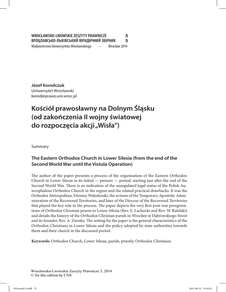 WROCŁAWSKO-LWOWSKIE ZESZYTY PRAWNICZE ВРОЦЛАВСЬКО-ЛЬВІВСЬКИЙ ЮРИДИЧНИЙ ЗБІРНИК Wydawnictwo Uniwersytetu Wrocławskiego • 5 5 Wrocław 2014 Józef Koredczuk Uniwersytet Wrocławski [email protected] Kościół prawosławny na Dolnym Śląsku (od zakończenia II wojny światowej do rozpoczęcia akcji „Wisła”) Summary The Eastern Orthodox Church in Lower Silesia (from the end of the Second World War until the Vistula Operation) The author of the paper presents a process of the organisation of the Eastern Orthodox Church in Lower Silesia in its initial — pioneer — period, starting just after the end of the Second World War. There is an indication of the unregulated legal status of the Polish Autocephalous Orthodox Church in the region and the related practical drawbacks. It was the Orthodox Metropolitan, Dionizy Waledynski, the actions of the Temporary Apostolic Administration of the Recovered Territories, and later of the Diocese of the Recovered Territories that played the key role in the process. The paper depicts the very first post-war peregrinations of Orthodox Christian priests to Lower Silesia (Rev. E. Lachocki and Rev. W. Rafalski) and details the history of the Orthodox Christian parish in Wrocław at Dąbrowskiego Street and its founder, Rev. A. Znosko. The setting for the paper is the general characteristics of the Orthodox Christians in Lower Silesia and the policy adopted by state authorities towards them and their church in the discussed period. Keywords: Orthodox Church, Lower Silesia, parish, priestly, Orthodox Christians Wrocławsko-Lwowskie Zeszyty Prawnicze 5, 2014 © for this edition by CNS WLzeszyty 5.indb 73 2015-06-15 13:34:33 74 Józef Koredczuk O ile o polityce wyznaniowej komunistycznych władz w Polsce po II wojnie światowej mówi się, że nie była w pełni suwerenna, lecz inspirowana przez Związek Radziecki, o tyle o ich polityce wobec Kościoła prawosławnego w Polsce można powiedzieć, że była prowadzona pod dyktando władz radzieckich. Stawiało to Kościół prawosławny, szczególnie w pierwszych latach po wojnie, w niezwykle trudnej sytuacji, zwłaszcza na nowych, nieznanych dotychczas nikomu ziemiach, jakimi były Ziemie Północne i Zachodnie. W skład tzw. Ziem Odzyskanych, które po przeszło sześciu stuleciach zostały przyłączone do Polski, wchodził Dolny Śląsk. W nowej powojennej rzeczywistości znalazł się on w sferze zainteresowania polskiego Kościoła prawosławnego. Kościół prawosławny na Dolnym Śląsku przed 1945 r. nie był zupełnie nieznany. Na początku XX w., w 1901 r. kosztem 25 tysięcy marek, w Sokołowsku koło Wałbrzycha (niem. Görbersdorf) wybudowano kaplicę prawosławną ku czci św. Archanioła Michała dla rosyjskich kuracjuszy odwiedzających to uzdrowisko. Była ona własnością Prawosławnego Bractwa św. Włodzimierza w Berlinie. Czasowo, bo od 1944 do maja 1945 r., także we Wrocławiu odprawiano nabożeństwa prawosławne. Odbywały się one prawdopodobnie w dzisiejszym kościele ewangelickim pod wezwaniem św. Krzysztofa na placu Dominikańskim. Brali w nich udział robotnicy przymusowi, głównie Bułgarzy, którzy mieli nawet swojego księdza. Być może uczestniczyli w nich również robotnicy przymusowi innych narodowości (Białorusini, Rosjanie, Ukraińcy i Serbowie) ze znajdującego się niedaleko obozu przy ówczesnej Clausewitzstrasse 19 (obecnie ul. Hauke-Bossaka). Pod koniec wojny nabożeństwa prawosławne we Wrocławiu były także organizowane dla wywiezionych i ewakuowanych tu osób narodowości ukraińskiej. Wśród nich przebywali też hierarchowie Ukraińskiej Autokefalicznej Cerkwi Prawosławnej. Według zachowanych archiwaliów liczbę ludności prawosławnej w tym okresie można szacować na około 2–3 tys. osób. Działająca wówczas cerkiew prawosławna we Wrocławiu podlegała arcybiskupowi Serafinowi (Lade)1, głowie emigracyjnej diecezji Rosyjskiej Cerkwi Prawosławnej (orientacji karłowackiej) z siedzibą w Berlinie2. Oczywiście nie można mówić o jakiejkolwiek ciągłości między strukturami Kościoła prawosławnego istniejącymi na Dolnym Śląsku przed 1945 r. i po tym okresie. Musiał powstać, jak zauwa1 W okresie od 23 listopada 1939 r. do 23 września 1940 r. kierował on także Cerkwią Prawosławną na ziemiach polskich, kiedy to gestapo zmusiło metropolitę abp. Dionizego do przekazania mu władzy; P. Gerent, Wierni wyznania prawosławnego na Dolnym Śląsku w świetle powojennych migracji ludności, „Zeszyty Naukowe Studenckiego Koła Ukrainoznawczego Uniwersytetu Wrocławskiego”, z. 3, Wrocław 1996, s. 45. 2 R. Żerelik, Zarys dziejów prawosławia na Śląsku po II wojnie światowej, [w:] Katedra Narodzenia Przenajświętszej Bogarodzicy we Wrocławiu, red. I. Rydzanowicz, Wrocław 1996, s. 31; P. Gerent, Prawosławie na Dolnym Śląsku w latach 1945–1989, Toruń 2007, s. 86–87; S. Dudra, Cerkiew w diasporze. Z dziejów prawosławnej Diecezji wrocławsko-szczecińskiej, Poznań 2009, s. 40. Por. także P. Gerent, Cerkiew prawosławna w Polsce po zakończeniu II wojny światowej, Wrocław 1998 (praca magisterska, nienumerowane strony); http://lemko.org/polish/gerent.html [dostęp: 2.02.2014]. Wrocławsko-Lwowskie Zeszyty Prawnicze 5, 2014 © for this edition by CNS WLzeszyty 5.indb 74 2015-06-15 13:34:33 Kościół prawosławny na Dolnym Śląsku 75 żył Rościsław Żerelik, „na »surowym korzeniu« w całkiem nowej sytuacji administracyjnej i majątkowej tego Kościoła oraz w nowej sytuacji społeczno-politycznej”3. Po przejęciu Dolnego Śląska przez administrację polską początki budowy struktur Kościoła prawosławnego związane są z osiedlaniem się na tych terenach nielicznej ludności prawosławnej. Sytuacja w tym zakresie uległa diametralnej zmianie w połowie 1947 r. wraz z napływem przymusowo wysiedlonych w ramach akcji „Wisła”. Ludność ta stała się podstawową 