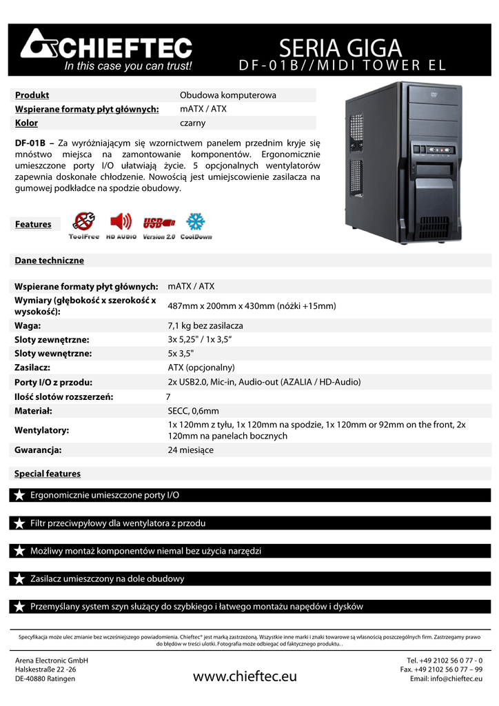 SERIA GIGA DF-01B//MIDI TOWER EL In this case you can trust! Obudowa komputerowa mATX / ATX czarny Produkt Wspierane formaty płyt głównych: Kolor DF-01B – Za wyróżniającym się wzornictwem panelem przednim kryje się mnóstwo miejsca na zamontowanie komponentów. Ergonomicznie umieszczone porty I/O ułatwiają życie. 5 opcjonalnych wentylatorów zapewnia doskonałe chłodzenie. Nowością jest umiejscowienie zasilacza na gumowej podkładce na spodzie obudowy. Features Dane techniczne Wspierane formaty płyt głównych: Wymiary (głębokość x szerokość x wysokość): Waga: Sloty zewnętrzne: Sloty wewnętrzne: Zasilacz: mATX / ATX Porty I/O z przodu: 2x USB2.0, Mic-in, Audio-out (AZALIA / HD-Audio) Ilość slotów rozszerzeń: Materiał: 7 SECC, 0,6mm 1x 120mm z tyłu, 1x 120mm na spodzie, 1x 120mm or 92mm on the front, 2x 120mm na panelach bocznych 24 miesiące Wentylatory: Gwarancja: 487mm x 200mm x 430mm (nóżki +15mm) 7,1 kg bez zasilacza 3x 5,25" / 1x 3,5“ 5x 3,5" ATX (opcjonalny) Special features Ergonomicznie umieszczone porty I/O Filtr przeciwpyłowy dla wentylatora z przodu Możliwy montaż komponentów niemal bez użycia narzędzi Zasilacz umieszczony na dole obudowy Przemyślany system szyn służący do szybkiego i łatwego montażu napędów i dysków Specyfikacja może ulec zmianie bez wcześniejszego powiadomienia. Chieftec® jest marką zastrzeżoną. Wszystkie inne marki i znaki towarowe są własnością poszczególnych firm. Zastrzegamy prawo do błędów w treści ulotki. Fotografia może odbiegać od faktycznego produktu. . Arena Electronic GmbH Halskestraße 22 -26 DE-40880 Ratingen www.chieftec.eu Tel. +49 2102 56 0 77 - 0 Fax. +49 2102 56 0 77 – 99 Email: [email protected]