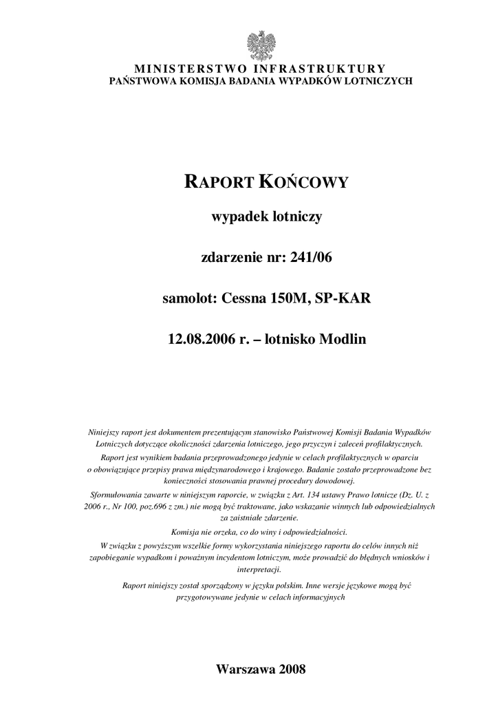 Sformułowania zawarte w niniejszym raporcie, w związku z Art. 134 ustawy Prawo lotnicze (Dz. U. z