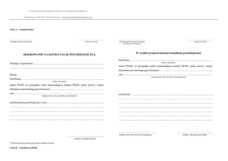 Pracownia Psychologiczna Osowa ul. Kolbego 40 Bydgoszcz Rejestracja: 507 332 733 Informacje: www.psychotestybydgoszcz.pl Część A – wypełnia lekarz ………………………….. ……………………………. ……………………………… ……………………………. (pieczątka podmiotu kierującego) (miejscowość data) (pieczątka jednostki przeprowadzającej konsultację psychologiczną) (miejscowość data) SKIEROWANIE NA KONSULTACJĘ PSYCHOLOGICZNĄ W wyniku przeprowadzonej konsultacji psychologicznej Pana/Panią ……………………………………………………………………………………....... Działając na podstawie …………………………………………………………………………... …………………………………………………………………………………………………….. (imię i nazwisko) numer PESEL (w przypadku osoby nieposiadającej numeru PESEL podać nazwę i numer dokumentu potwierdzającego tożsamość) ………………………………………………………... zam. ………………………………………………………………………………………………. kieruję: Pana/Panią ……………………………………………………………………………………....... (miejscowość, ulica, nr domu, nr mieszkania) (imię i nazwisko) numer PESEL (w przypadku osoby nieposiadającej numeru PESEL podać nazwę i numer dokumentu potwierdzającego tożsamość) ………………………………………………………... zam. ………………………………………………………………………………………………. (miejscowość, ulica, nr domu, nr mieszkania) stwierdzam ………………………………………………………………………………………... …………………………………………………………………………………………………….. na konsultację psychologiczną w celu ……………………………………………………………. …………………………………………………………………………………………………….. …………………………………………………………………………………………………….. …………………………………………………………………………………………………….. …………………………………………………………………………………………………….. …………………………………………………………………………………………………….. …………………………………………………………………………………………………….. …………………………………………………………………………………………………… …………………………………………………………………………………………………….. …………………………………………………………………………………………………….. ……………………………………… …………………………………….. (podpis i pieczątka lekarska) *) Wpisać podstawę prawną, przy braku podstawy skreślić. Część B – wypełnia psycholog (podpis osoby skierowanej na konsultację) …………………………………….. (podpis i pieczątka psychologa)