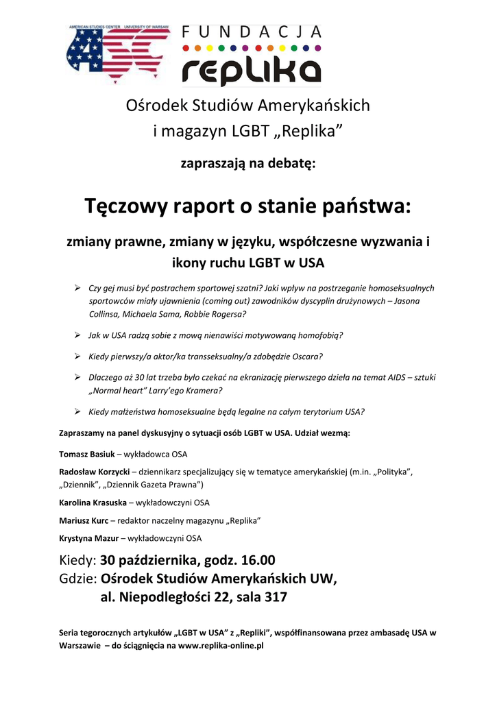 Ośrodek Studiów Amerykańskich i magazyn LGBT „Replika” zapraszają na debatę: Tęczowy raport o stanie państwa: zmiany prawne, zmiany w języku, współczesne wyzwania i ikony ruchu LGBT w USA Czy gej musi być postrachem sportowej szatni? Jaki wpływ na postrzeganie homoseksualnych sportowców miały ujawnienia (coming out) zawodników dyscyplin drużynowych – Jasona Collinsa, Michaela Sama, Robbie Rogersa? Jak w USA radzą sobie z mową nienawiści motywowaną homofobią? Kiedy pierwszy/a aktor/ka transseksualny/a zdobędzie Oscara? Dlaczego aż 30 lat trzeba było czekać na ekranizację pierwszego dzieła na temat AIDS – sztuki „Normal heart” Larry’ego Kramera? Kiedy małżeństwa homoseksualne będą legalne na całym terytorium USA? Zapraszamy na panel dyskusyjny o sytuacji osób LGBT w USA. Udział wezmą: Tomasz Basiuk – wykładowca OSA Radosław Korzycki – dziennikarz specjalizujący się w tematyce amerykańskiej (m.in. „Polityka”, „Dziennik”, „Dziennik Gazeta Prawna”) Karolina Krasuska – wykładowczyni OSA Mariusz Kurc – redaktor naczelny magazynu „Replika” Krystyna Mazur – wykładowczyni OSA Kiedy: 30 października, godz. 16.00 Gdzie: Ośrodek Studiów Amerykańskich UW, al. Niepodległości 22, sala 317 Seria tegorocznych artykułów „LGBT w USA” z „Repliki”, współfinansowana przez ambasadę USA w Warszawie – do ściągnięcia na www.replika-online.pl