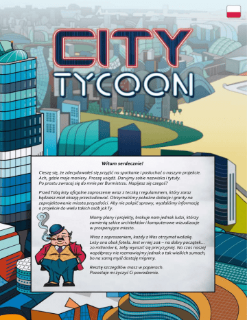 Witam serdecznie! Cieszę się, że zdecydowałeś się przyjść na spotkanie i posłuchać o naszym projekcie. Ach, gdzie moje maniery. Proszę usiądź. Darujmy sobie nazwiska i tytuły. Po prostu zwracaj się do mnie per Burmistrzu. Napijesz się czegoś? Przed Tobą leży oficjalne zaproszenie wraz z teczką i regulaminem, który zaraz będziesz miał okazję przestudiować. Otrzymaliśmy pokaźne dotacje i granty na zaprojektowanie miasta przyszłości. Aby nie pokpić sprawy, wysłaliśmy informację o projekcie do wielu takich osób jak Ty. Mamy plany i projekty, brakuje nam jednak ludzi, którzy zamienią szkice architektów i komputerowe wizualizacje w prosperujące miasto. Wraz z zaproszeniem, każdy z Was otrzymał walizkę. Leży ona obok fotela. Jest w niej 20$ – na dobry początek... 20 milionów $, żeby wyrazić się precyzyjniej. Na czas naszej współpracy nie rozmawiajmy jednak o tak wielkich sumach, bo na samą myśl dostaję migreny. Resztę szczegółów masz w papierach. Pozostaje mi życzyć Ci powodzenia. City Tycoon jest grą ekonomiczną dla od 2 do 5 graczy, w której wcielamy się w role inwestorów biorących udział w projekcie mającym na celu stworzenie miasta przyszłości. Celem gry jest rozbudowa przestrzeni miejskiej i dzięki temu powiększanie zadowolenia wśród mieszkańców. Gracz, którego firma zdobędzie najwięcej punktów zadowolenia wygra grę. • KOMPONENTY GRY W pudełku z grą City Tycoon znajdziesz następujące elementy: 168 KAFLI 4 kafle startowe – można je odróżnić od pozostałych tym, że na rewersie posiadają symbol „S” oznaczający kafel startowy. Na początku każdej gry układa się z nich „centrum miasta”. 12 kafli elektrowni i wodociągów (po 6 szt.) – dwustronne kafle z czerwonym i niebieskim tłem, za pomocą których będziemy zasilać miasto w prąd i wodę. 32 kafle terenu – dwustronne kafle z rysunkami łąki i wody. 120 kafli dzielnic (po 30 szt. do 4 etapów) – wszystkie pozostałe kafle. Dodatkowo oznaczone na odwrocie do którego z etapów gry przynależą. Dzielnice będą używane do rozbudowy miasta. 85 KOSTEK SUROWCÓW 2 (30 kostek czerwonych - prąd, 25 kostek niebieskich - woda, 25 kostek żółtych - dobra, 5 dużych kostek żółtych o równowartość 5 małych) 130 ŻETONÓW FIRM Każdy spośród trzech surowców dostępnych w grze – prądu, wody i dóbr, posiada własny kolor kostek. Za ich pomocą będziemy zaznaczać przepływ surowców i ich wykorzystanie przez poszczególne dzielnice. W pudełku znajduje się 5 zestawów żetonów firm w pięciu różnych kolorach po 26 żetonów w każdym, którymi gracze będą zaznaczać wybudowane przez siebie dzielnice, ilość zgromadzonych punktów zadowolenia oraz swoją kolejność w trakcie tury. PLANSZA PUNKTACJI Na planszy punktacji każdy z graczy zaznacza zgromadzoną przez siebie ilość punktów zadowolenia mieszkańców. Punkty zadowolenia to wskaźnik zwycięstwa – ten z graczy, który zgromadzi ich najwięcej – wygrywa. Na planszy punktacji znajduje się również tor kolejności, ustalający kolejność podczas każdego z etapów budowy miasta. PIENIĄDZE (30 żetonów o nominale 1$, 30 żetonów o nominale 5$, 10 żetonów o nominale 10$, 10 żetonów o nominale 25$) Kapitał, którym będą dysponować gracze, reprezentowany jest przez żetony o nominałach 1, 5, 10, 25. Za ich pomocą gracze będą kupować nowe dzielnice i opłacać transfer surowców. INSTRUKCJA Niniejsza instrukcja jest zbiorem zasad rozbudowy miasta. Należy się do niej odwoływać w wypadku ustalenia szczegółowych zasad. • PRZYGOTOWANIE DO GRY Na środku stołu kładziemy 4 kafle startowe układając je tak, jak pokazano na ilustracji [1] (od innych kafli można je łatwo odróżnić po literce „S” znajdującej się na ich odwrocie). Od tych kafelków gracze będą rozpoczynali budowę wspólnego miasta. Na kaflach startowych elektrowni oraz wodociągu kładziemy kostki surowców w ilości równej ilości graczy. Np.: Jeśli grają cztery osoby, kładziemy cztery niebieskie kostki na kaflu wodociągu i cztery czerwone na elektrowni. Podczas rozgrywki dwu i trzyosobowej kafle startowe układane są w inny sposób (zobacz schemat na stronie 4). Kafle dzielnic należy podzielić na cztery stosy zgodnie z oznaczeniem etapu na ich rewersie (I, II, III, oraz IV). Następnie zakryte stosy kładziemy obok planszy punktacji. [2] 6 4 5 2 1 3 3 Obok niej kładziemy także kostki surowców (niebieskie, czerwone, żółte) [3] oraz żetony pieniędzy. Powyżej planszy punktacji należy umieścić dwa stosy: z kaflami wodociągów oraz elektrowni. Kafle te należy ułożyć wedle kolejności cyfr znajdujących się w dolnej części, tak aby te z numerem 1 znajdowały się na górze, a te z numerem 6 na dole stosu [4]. Tuż obok należy położyć kafle terenu. Każdy z graczy otrzymuje 26 znaczników wybranej firmy w jednym z dostępnych kolorów. Jeden z tych znaczników kładzie na torze punktowym na wartości 0 - będzie nim zaznaczał ilość zdobytych punktów zadowolenia [5]. Drugi z nich posłuży do zaznaczenia kolejności w trakcie gry [6]. W pierwszym etapie kolejność jest ustalana w sposób losowy i odpowiednio zaznaczana na torze kolejności. Pierwszy gracz otrzymuje 20 $, a każdy kolejny o 2 $ więcej od poprzedniego (drugi gracz 22 $, trzeci 24 $ itd.) Rozpoczynamy rozgrywkę. PRZYGOTOWANIE KAFLI STARTOWYCH DLA 2 i 3 GRACZY. Podczas partii na dwóch graczy dwie krawędzie odbiegające od centrum miasta będą nieaktywne, a podczas partii na trzech graczy jedna z tych krawędzi pozostanie nieaktywna. Należy położyć przy nich kafle terenu z wodą i traktować je jakby rozciągały się w nieskończoność w jedną, i w drugą stronę. Ustawienie dla dwóch graczy (strzałki wskazują możliwe kierunki rozbudowy miasta) Ustawienie dla trzech graczy (strzałki wskazują możliwe kierunki rozbudowy miasta) • PRZEBIEG ROZGRYWKI Gra