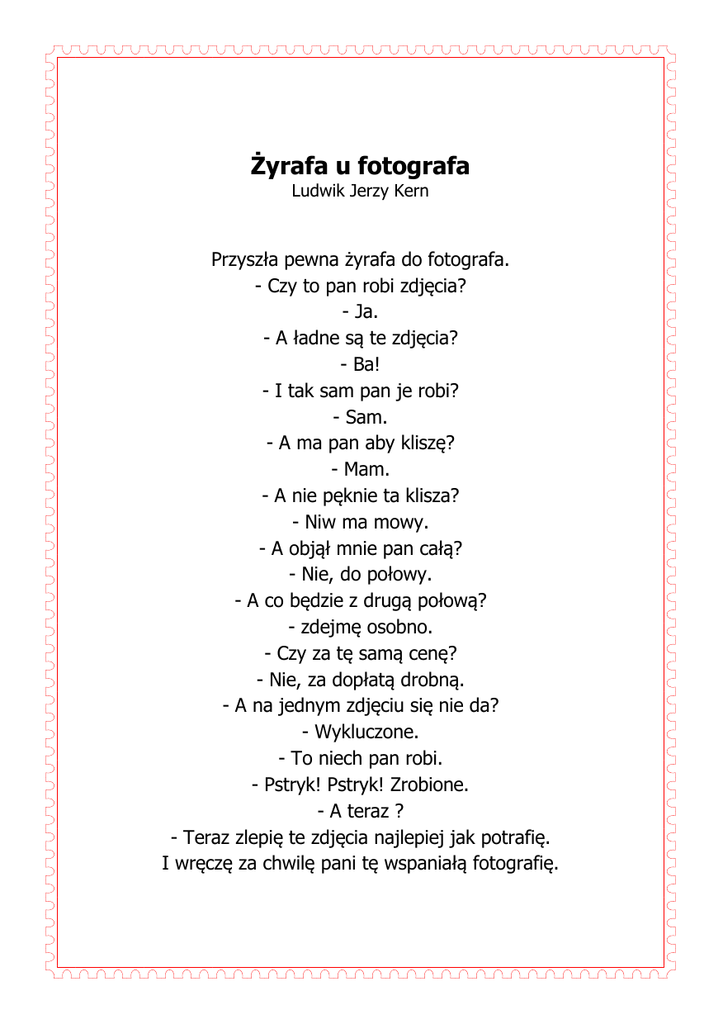 Żyrafa u fotografa Ludwik Jerzy Kern Przyszła pewna żyrafa do fotografa. - Czy to pan robi zdjęcia? - Ja. - A ładne są te zdjęcia? - Ba! - I tak sam pan je robi? - Sam. - A ma pan aby kliszę? - Mam. - A nie pęknie ta klisza? - Niw ma mowy. - A objął mnie pan całą? - Nie, do połowy. - A co będzie z drugą połową? - zdejmę osobno. - Czy za tę samą cenę? - Nie, za dopłatą drobną. - A na jednym zdjęciu się nie da? - Wykluczone. - To niech pan robi. - Pstryk! Pstryk! Zrobione. - A teraz ? - Teraz zlepię te zdjęcia najlepiej jak potrafię. I wręczę za chwilę pani tę wspaniałą fotografię.
