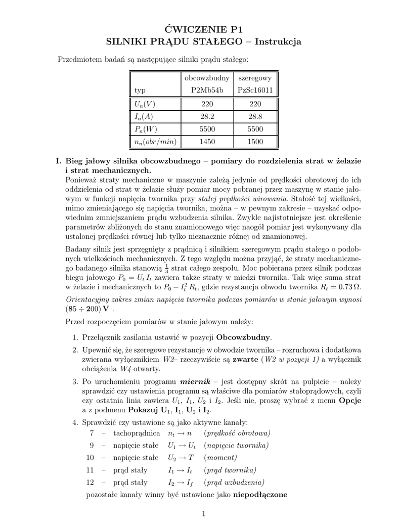 ĆWICZENIE P1 SILNIKI PRĄDU STAŁEGO – Instrukcja